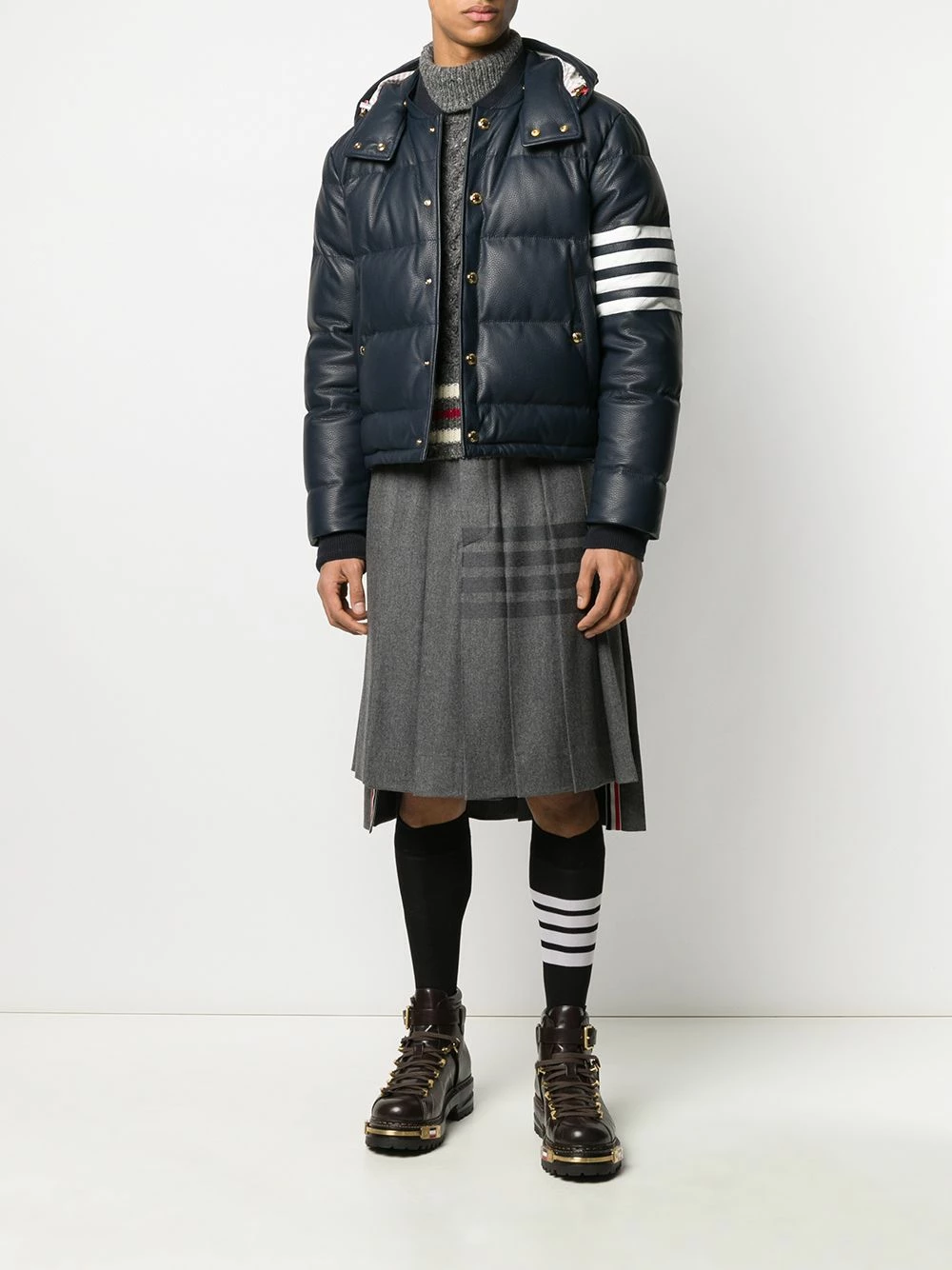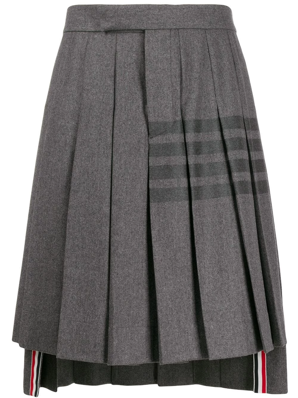 Who said men don’t wear skirts? Not Thom Browne for sure! Spun from soft wool and cashmere blend, this knee-length pleated 4-Bar striped skirt is for the ones who are not afraid to show their rebellious side. Go edgy or go home! Featuring a concealed front fastening, a pleated design, a knee length and a tonal 4-bar detail.