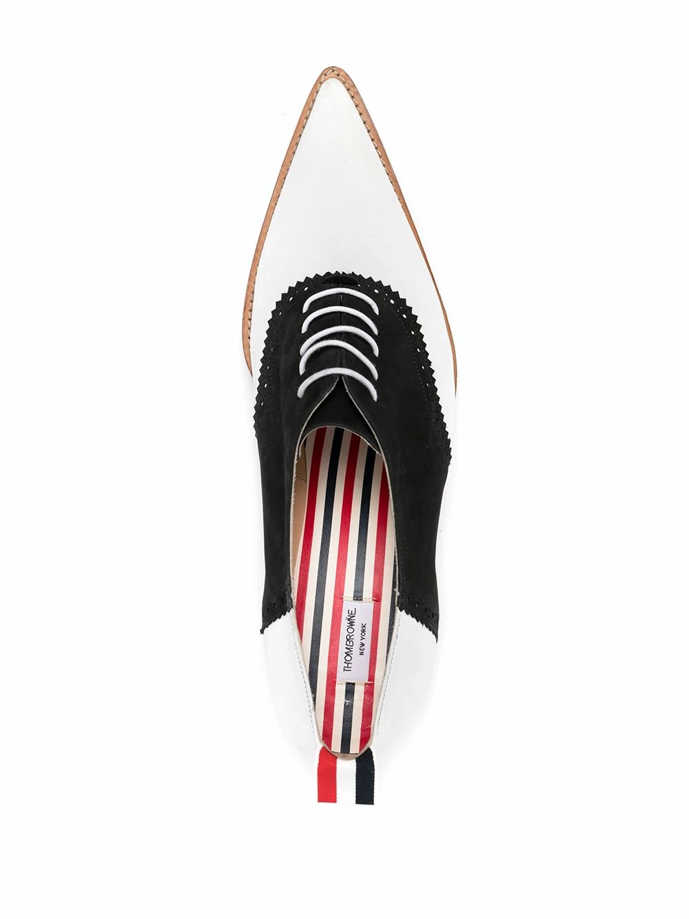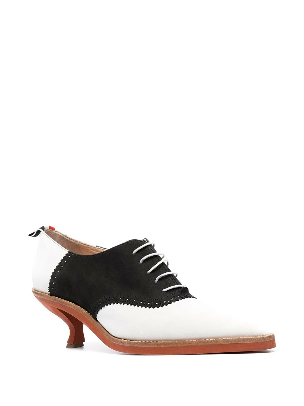 Your morning commute just got easier? How? You ask. Well, the wearable sculpted heel on this pair of Thom Browne pumps means there’s no need to take a spare pair of shoes to the office. And do you know what that means? A free hand for coffee. Featuring brogue detailing, a front lace-up detail, a pointed toe, a sculpted high heel, a panelled colour block design and a grosgrain band.