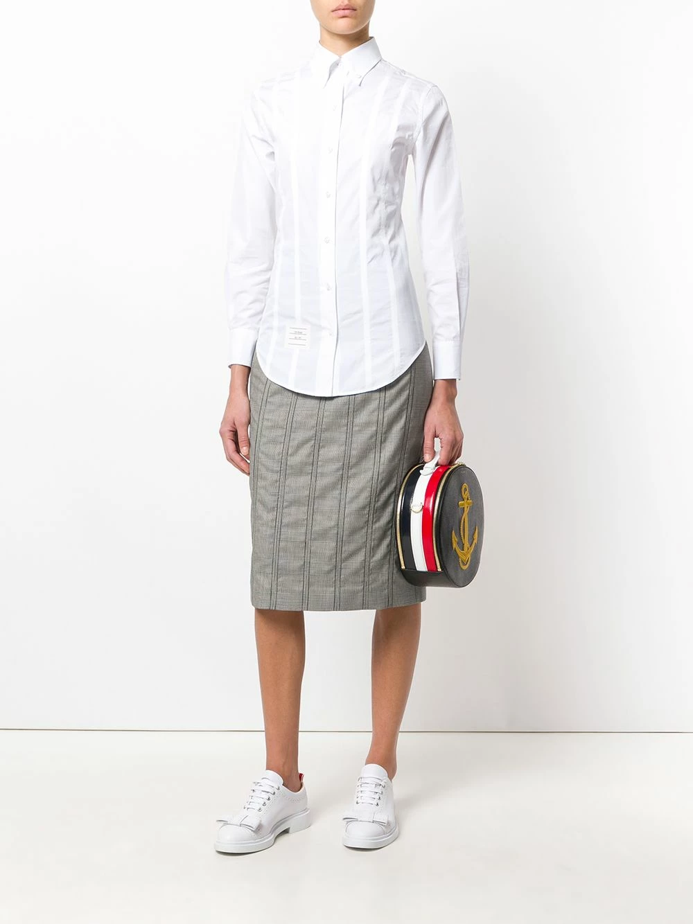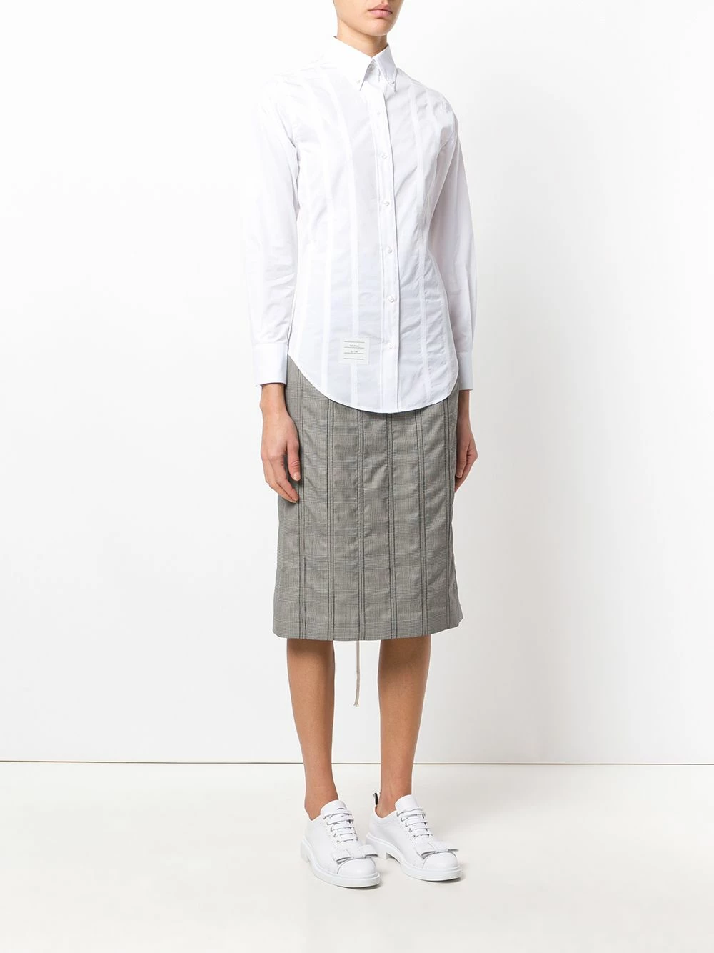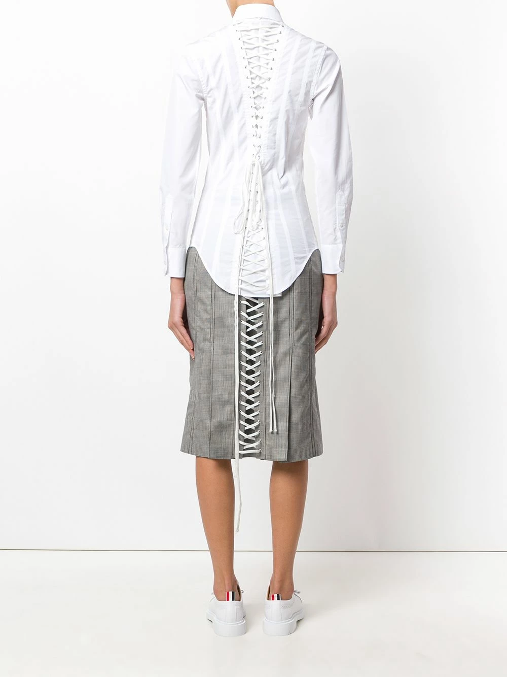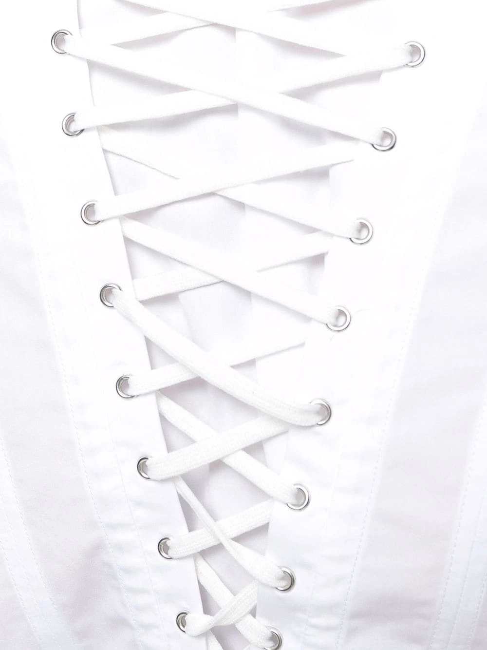 With a history in men’s formalwear, Thom Browne brings its tailoring expertise to the table when creating its women’s collection, focusing on premium materials and expertly cut shapes. Crafted in Italy from a crisp white cotton, this lace-up back shirt from Thom Browne features a button collar, a front button fastening, long sleeves, button cuffs, a branded patch to the front, a curved hem and a corset style lace-up back.