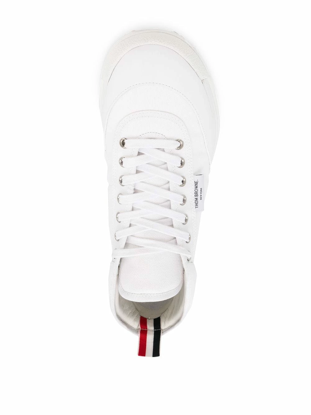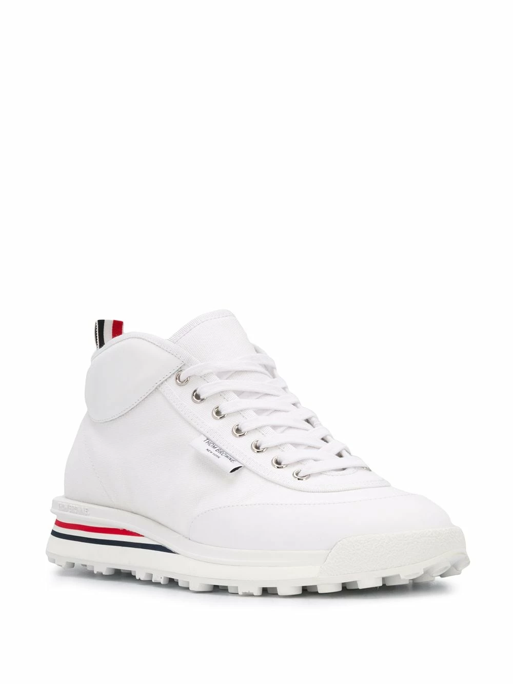 Take your casual style to the next level with these white high-top sneakers from Thom Browne. The signature three-stripe logo on the sole and at the rear will stand out anywhere you. Level up.