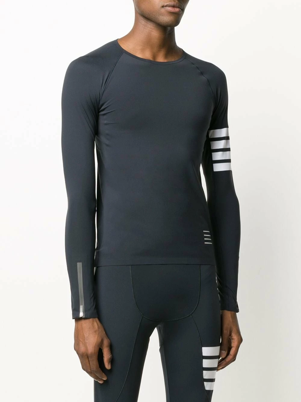 Hit the gym with style was never so easy! This lightweight compression tech 4-Bar T-shirt from Thom Browne will keep you cool and will make sure that you are 100% focused on being fit. Work those abs boy! Featuring a round neck, long sleeves, a fitted silhouette, a lightweight construction and a 4-bar stripe detail to the sleeve.