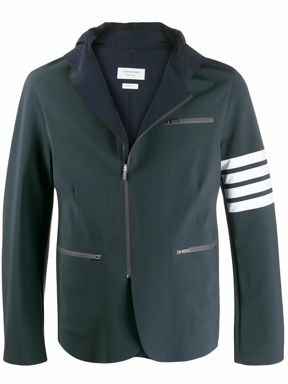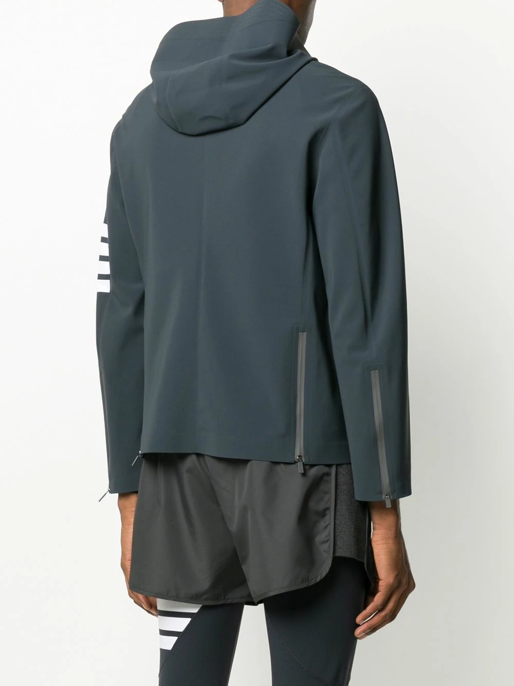 Hitting the gym in style was never so easy with this lightweight tech hooded 4-Bar jacket from Thom Browne. Now you don’t have any excuses to stay home (well you have, but ugly clothes are not one)! Featuring a hood, a front zip fastening, long sleeves, a zipped chest pocket, front zipped pockets, a lightweight construction and a 4-bar stripe detail to the sleeve.