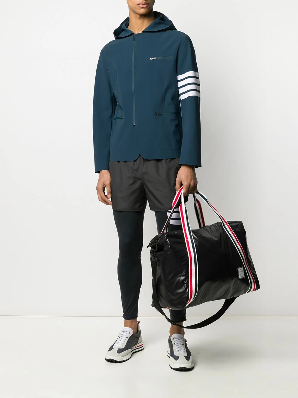 Four strikes and you’re Thom Browne. Showcasing the signature 4-Bar stripe detailing to the sleeve, this lightweight tech hooded jacket is part of Thom Browne’s innovative activewear collection, ensuring ultimate style whilst you work up a sweat. Or nip to the shop. Featuring a hood, a front zip fastening, long sleeves, a stripe detail to the side, front zipped pockets and side zip fastenings.