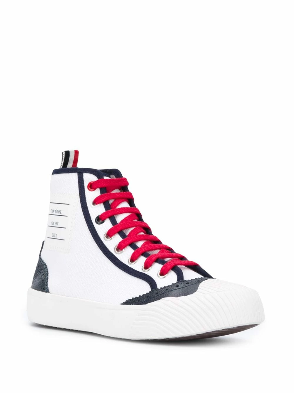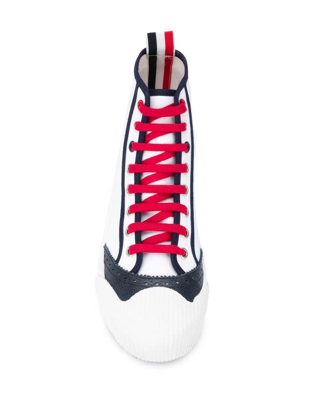 Whenever you expect a tailoring house to zig, Thom Browne choose to zag. A perfect example are these hi-top sneakers, which are crafted in Spain using high-quality canvas — but which also feature brogue-style contrast leather. High meets low, zig meets zag, and you meet your new favourite pair of shoes.
