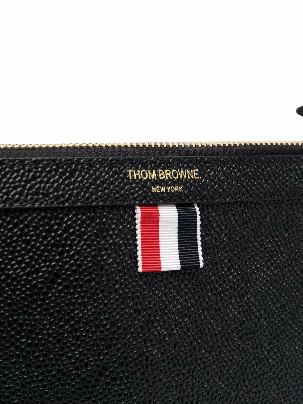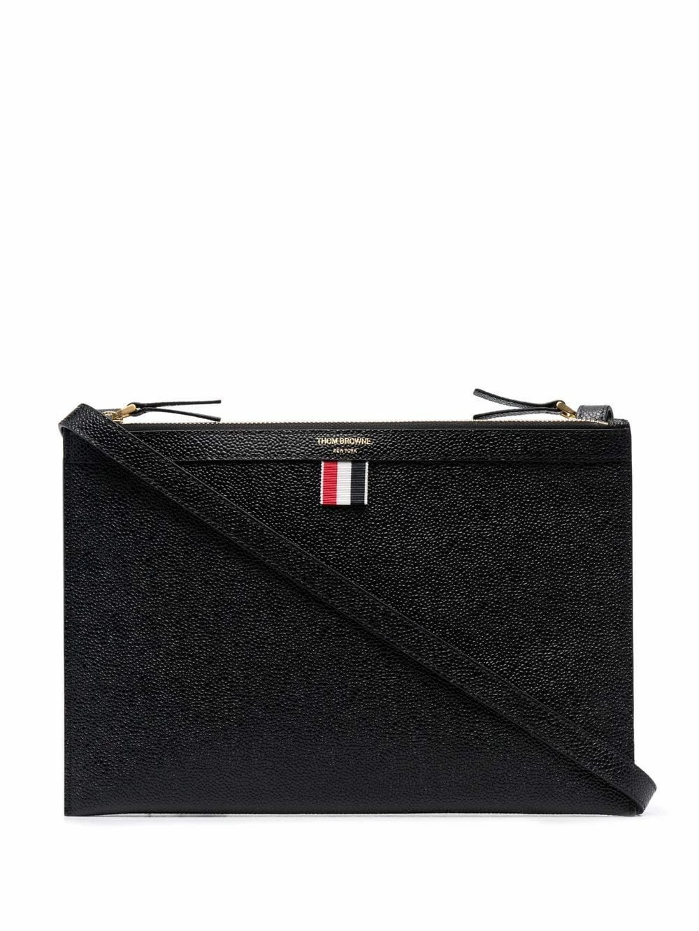 Thom Browne offers this bag made from black pebbled leather. Designed with two zipped compartments, this piece is punctuated with the label’s signature 4-bar tab making this piece instantly recognisable.