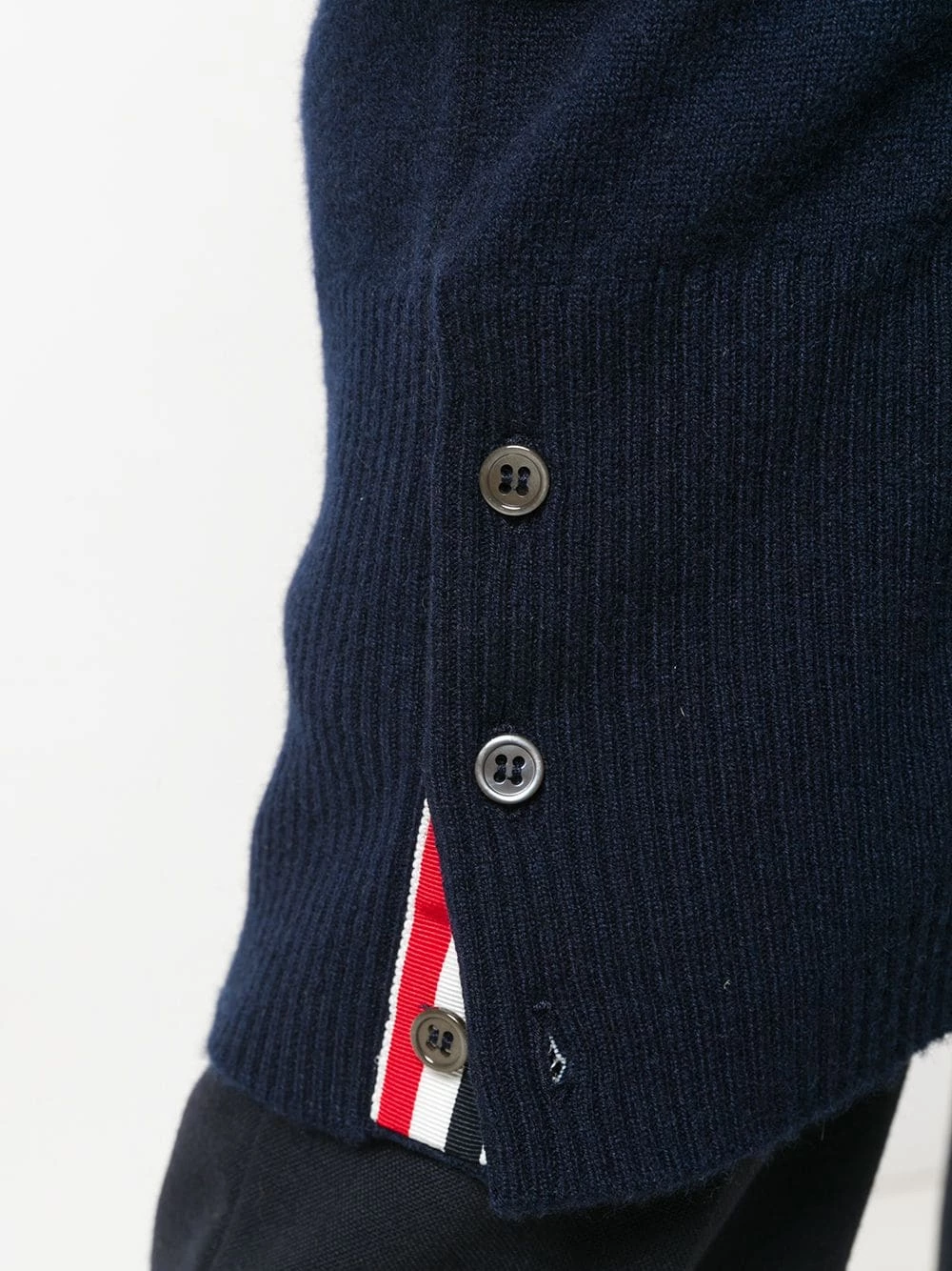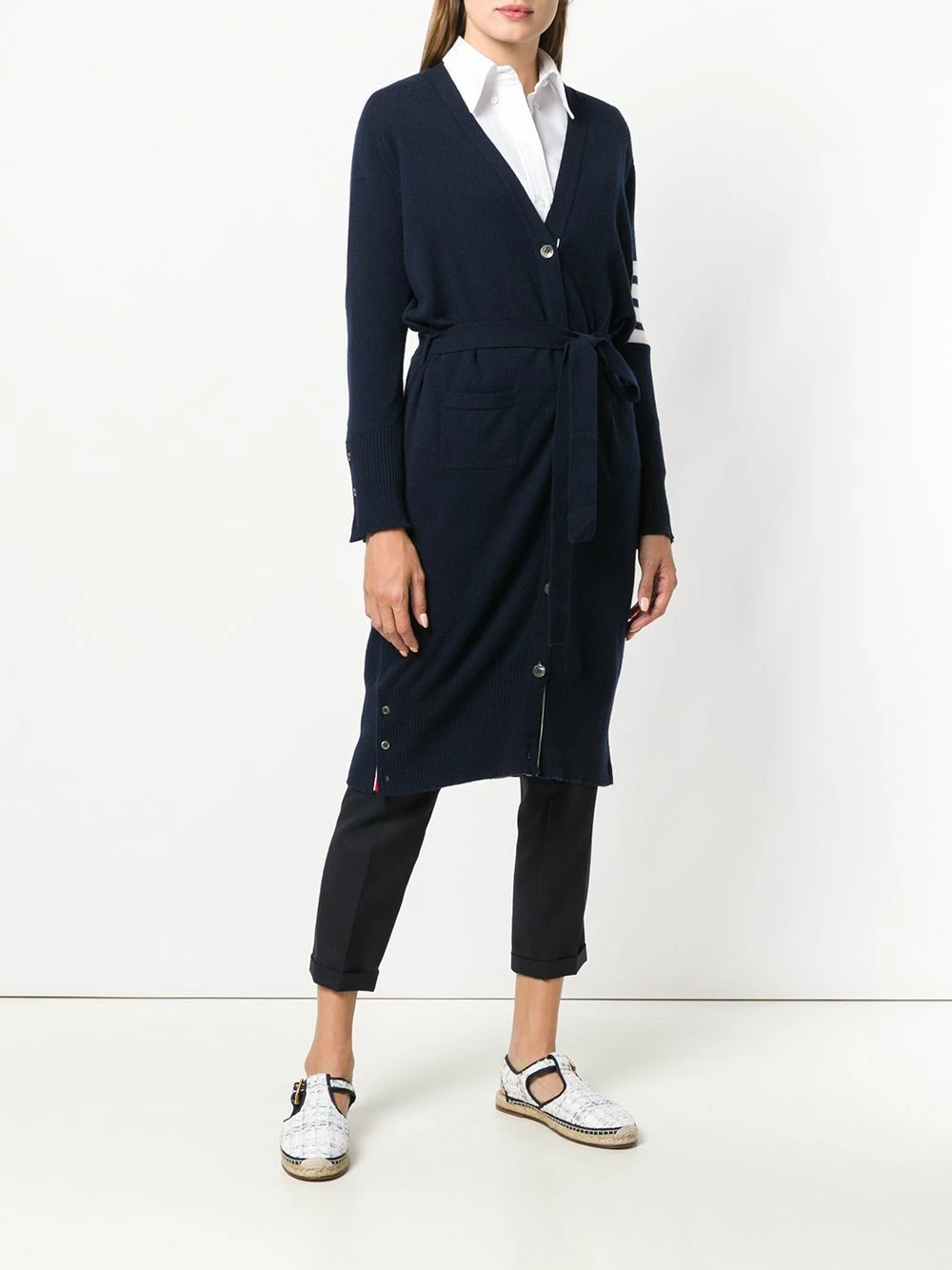 Thom Browne’s embrace of preppy menswear has translated effortlessly over into a women’s line that’s every bit as playful as it is polished. Crafted from navy blue cashmere and intended for a relaxed fit, this knee-length belted cardigan features a feminine v-neck, dropped shoulders, a front button fastening, front pockets, a ribbed hem and cuffs, a signature tri-colour striped tab at the back and four-bar stripes at the sleeve.