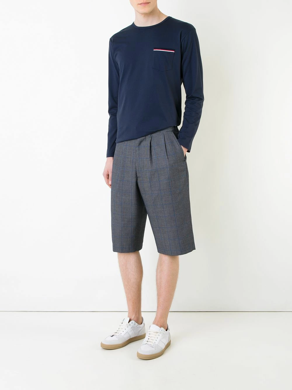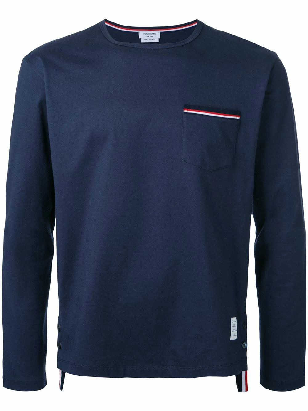 Famed for his traditional tailoring with a twist, Thom Browne, applies his expert hand to the classic T-shirt, crafting a crew neck silhouette from navy cotton. The design is characterised by its long slim sleeves and chest patch pocket, trimmed with the signature tri-tone stripe. The hallmark also appears as a tab, appearing at each side of the buttoned high-low hem, before being finished with a woven brand patch. This item is true to fit.