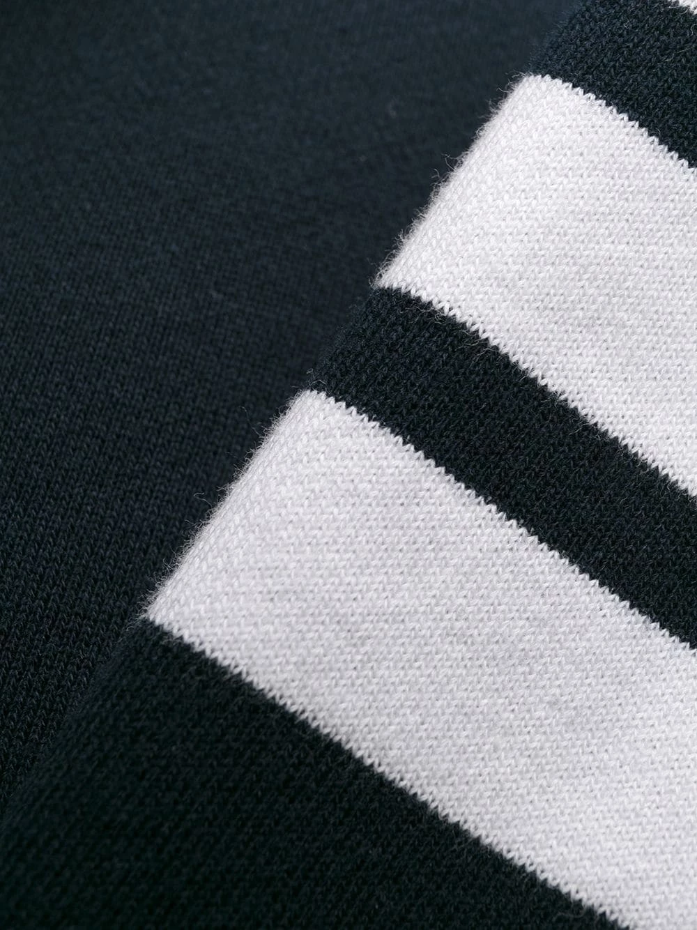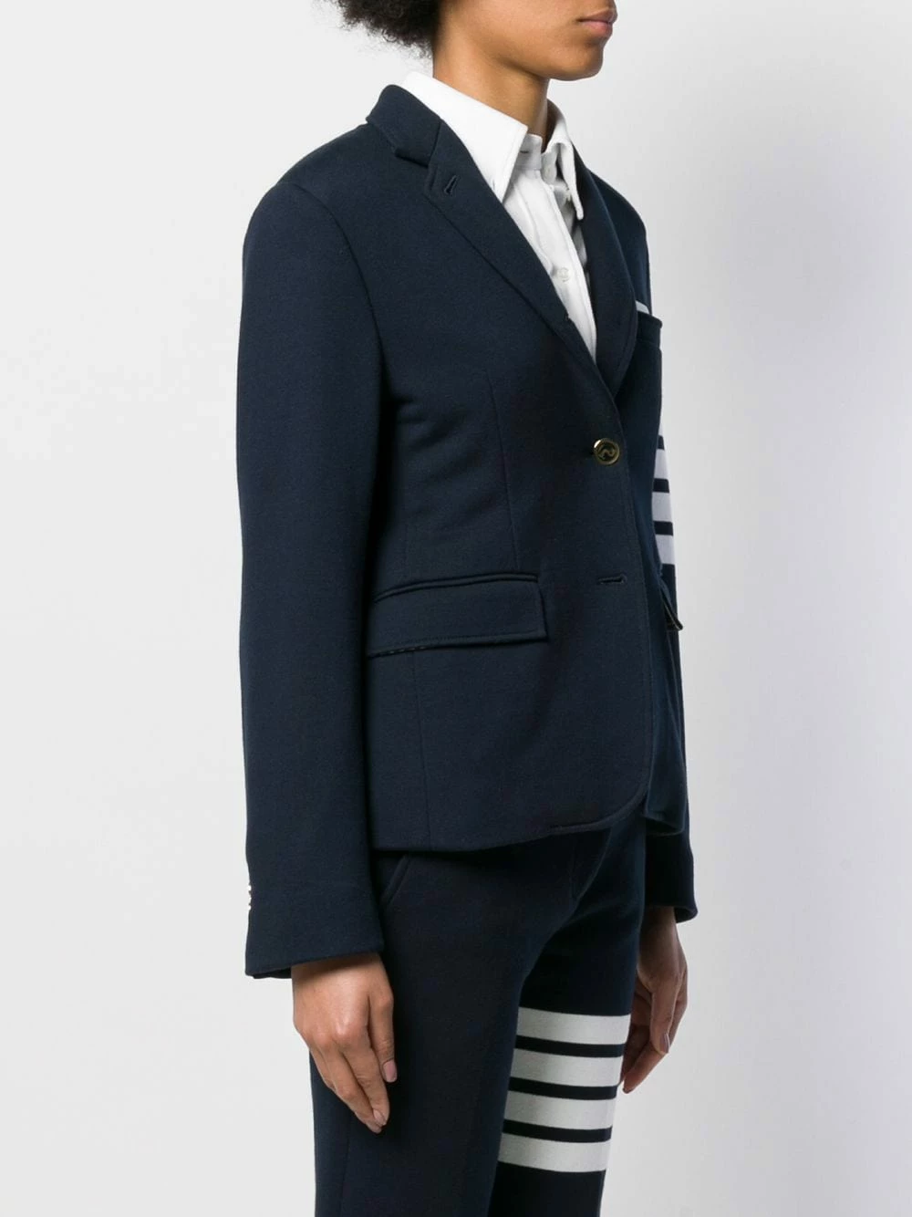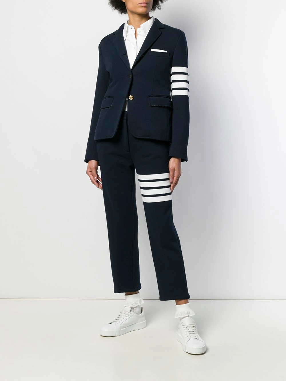 Who said formal couldn’t be fun? Not Thom Browne, that’s for sure. This navy blue cotton loopback narrow shoulder 4-Bar blazer benefits from a tailored design whilst also boasting the iconic 4-Bar print at the sleeve. What are you waiting for? Featuring structured shoulders, notched lapels, a broad welt chest pocket, a front button fastening, front flap pockets, long sleeves, button cuffs, a double vent to the rear and a 4-Bar print to one side.