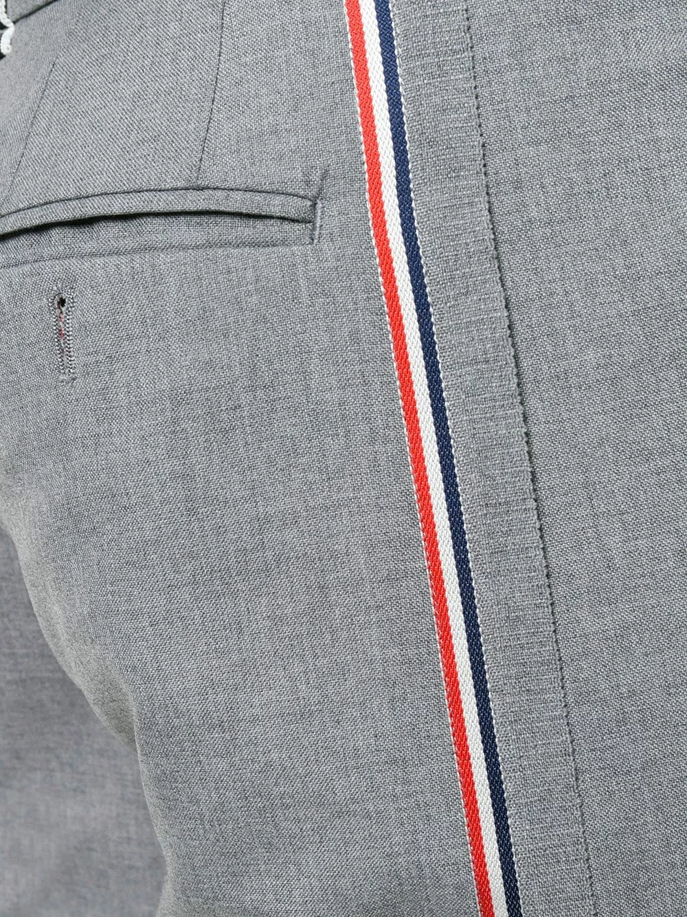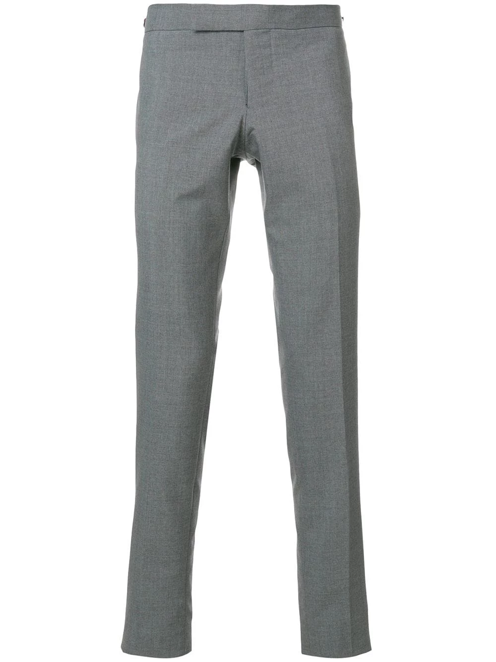 Medium grey wool blend low-rise skinny trousers from Thom Browne.