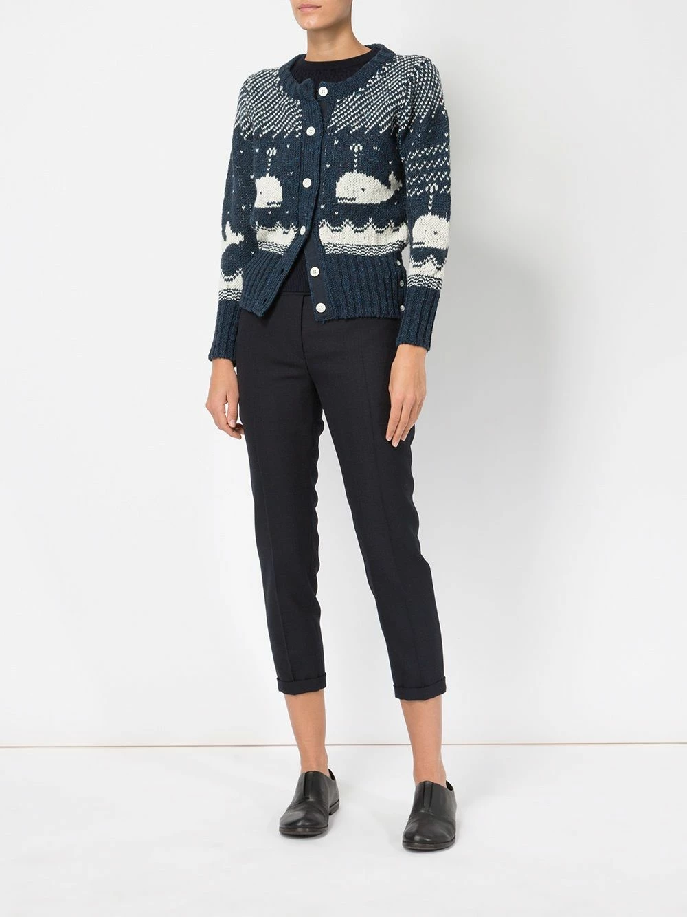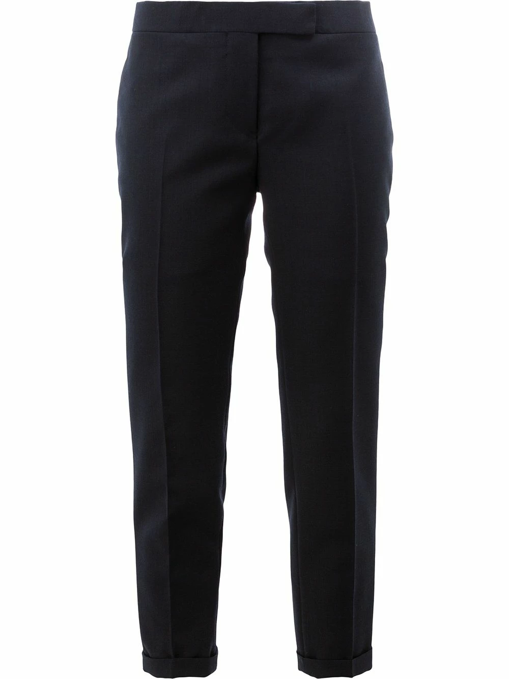 Navy blue wool Lowrise Skinny Trousers In Navy 2-Ply Wool Fresco from Thom Browne featuring a concealed front fastening, buttoned jetted pockets at the rear, creases and a cropped length.