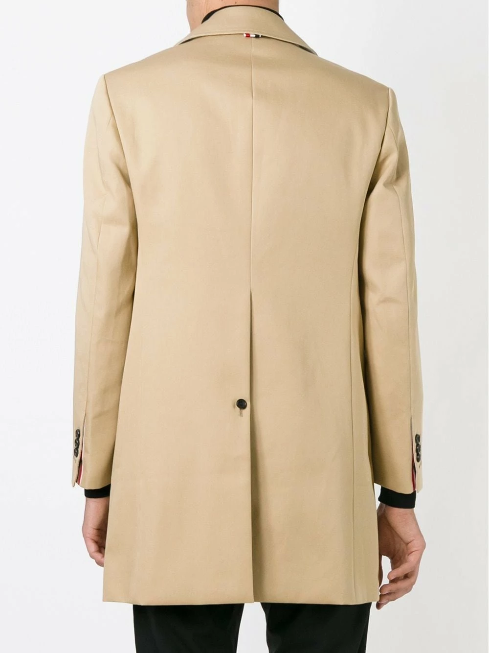 Beige cotton mac bal collar overcoat from THOM BROWNE featuring a classic collar, a button fastening, long sleeves, side pockets and button cuffs.