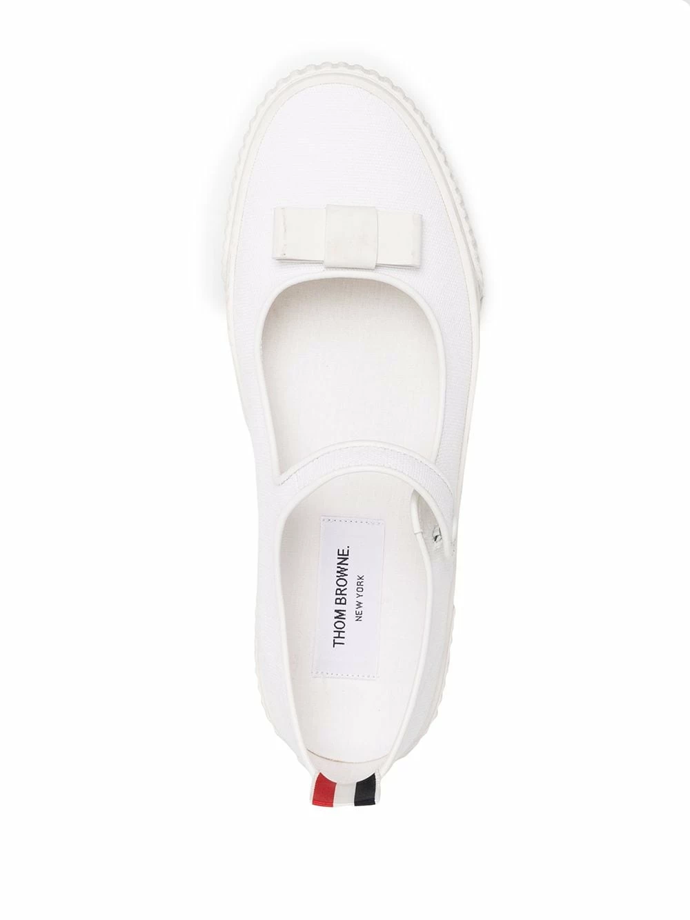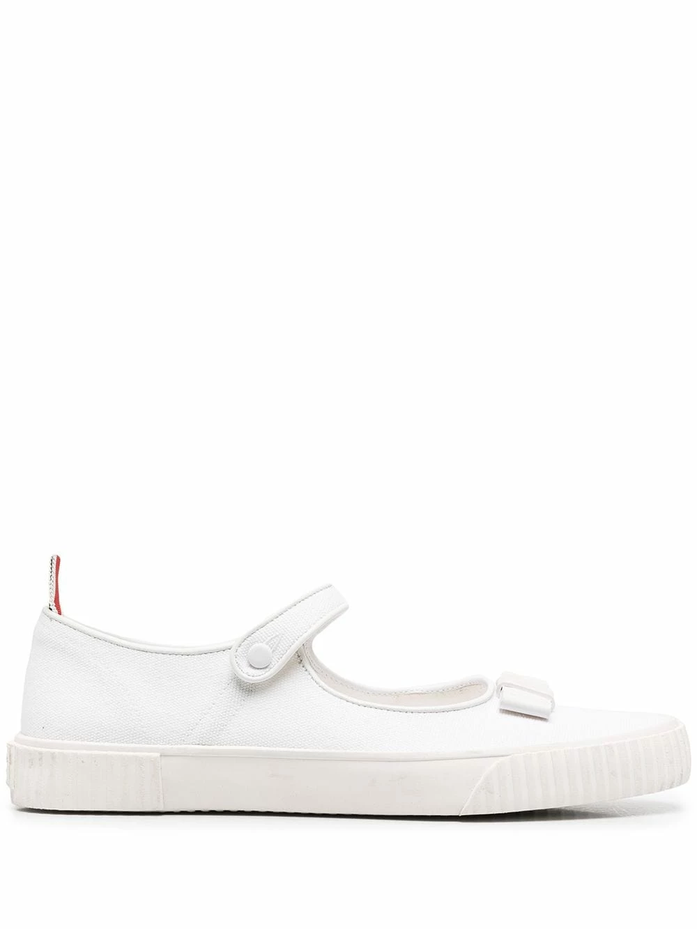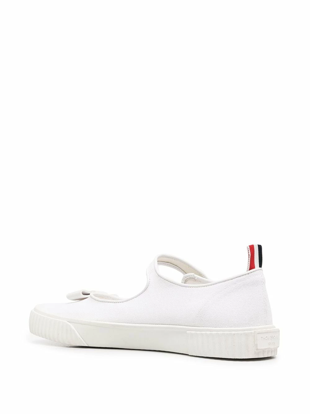 Precious things must be celebrated. Made from white cotton, these Mary Jane bow detail sneakers from Thom Browne are definitely one of those. Your feet appreciate it. Featuring a bow detail, a round toe, a snap button closure, a flat rubber sole and a tricolour grosgrain tab on the rear.
