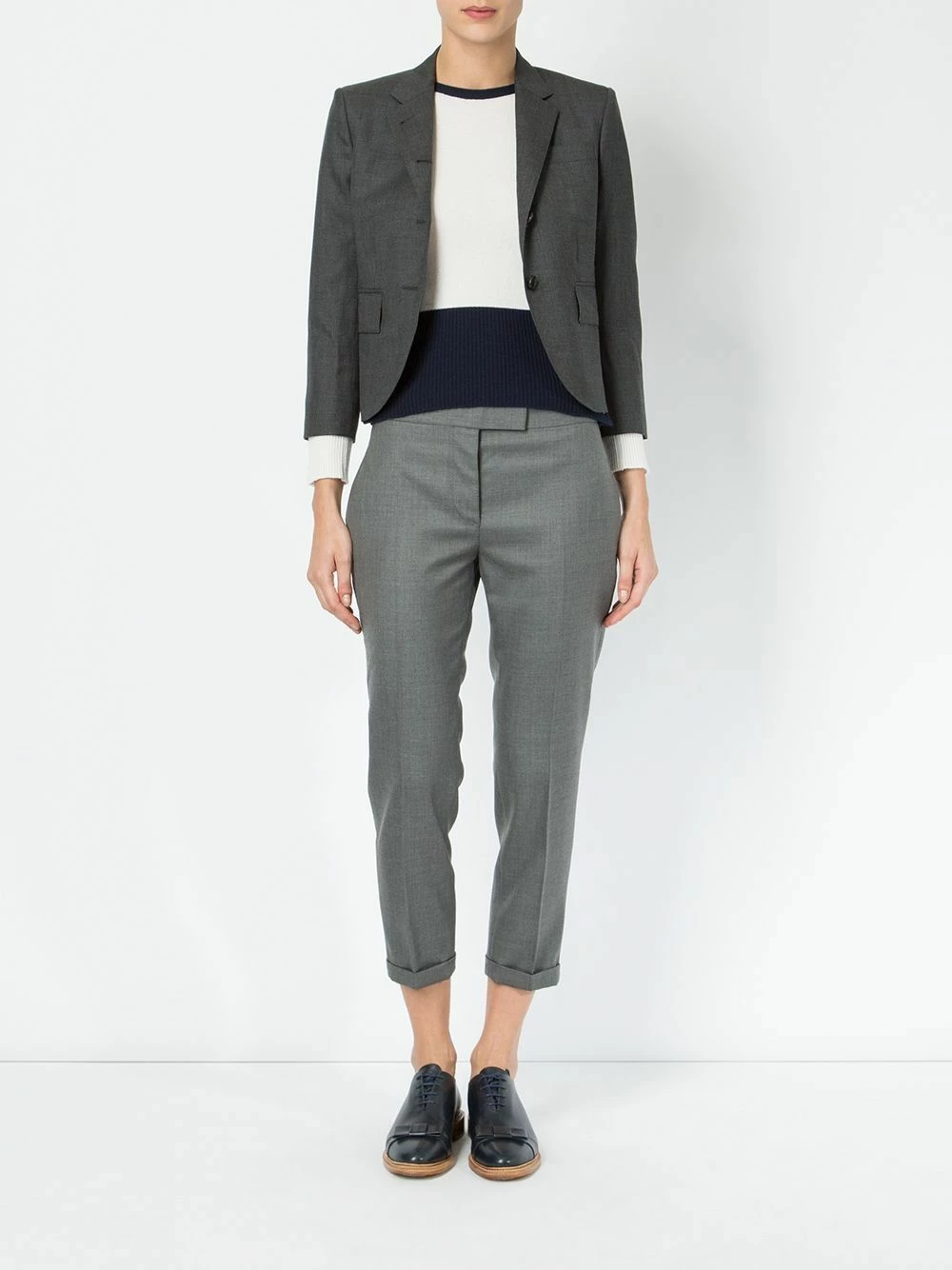 Thom Browne transforms the classic tailored trousers by cutting them into a cropped silhouette. Crafted from wool in a grey hue, this pair features the traditional details – note the pressed crease – alongside signature branding details, such as the grosgrain loop tab.