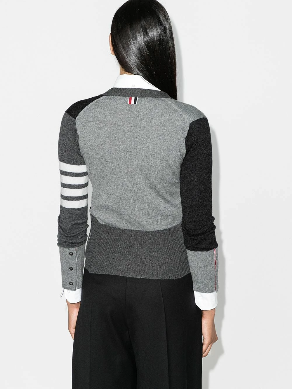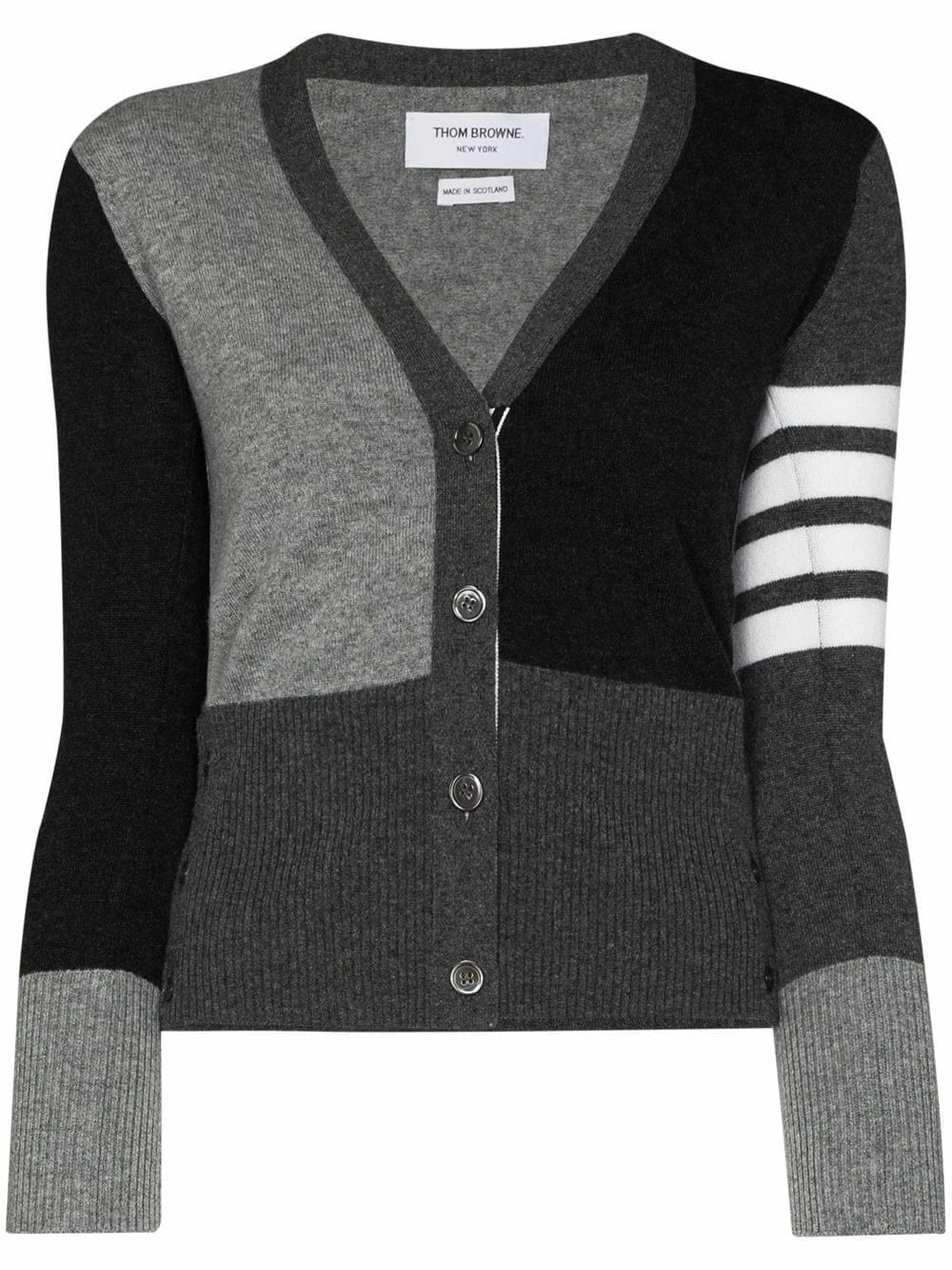 As renowned for his beloved knitwear as he is for his boundary-pushing tailoring, this knitted cardigan finds Thom Browne editing a familiar favourite with more athletically-inclined detailing. Crafted in the United Kingdom from soft cashmere, this sophisticated cardigan features a v-neck, a front button fastening, long sleeves, button cuffs, a ribbed hem and cuffs, 4-bar stripes at the sleeve, red, white and blue grosgrain cuffs detail and back yoke tab and side buttoned slits.