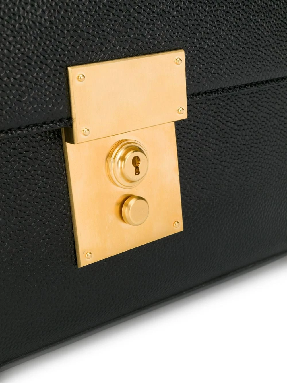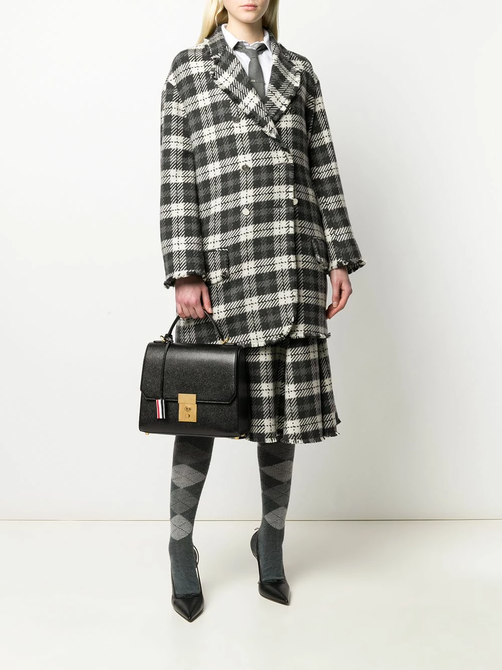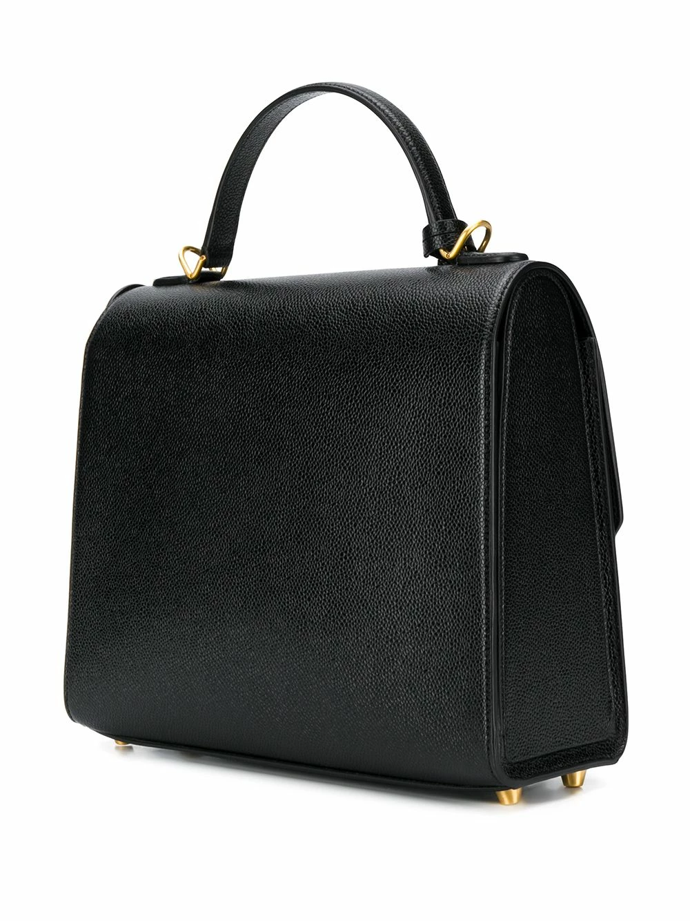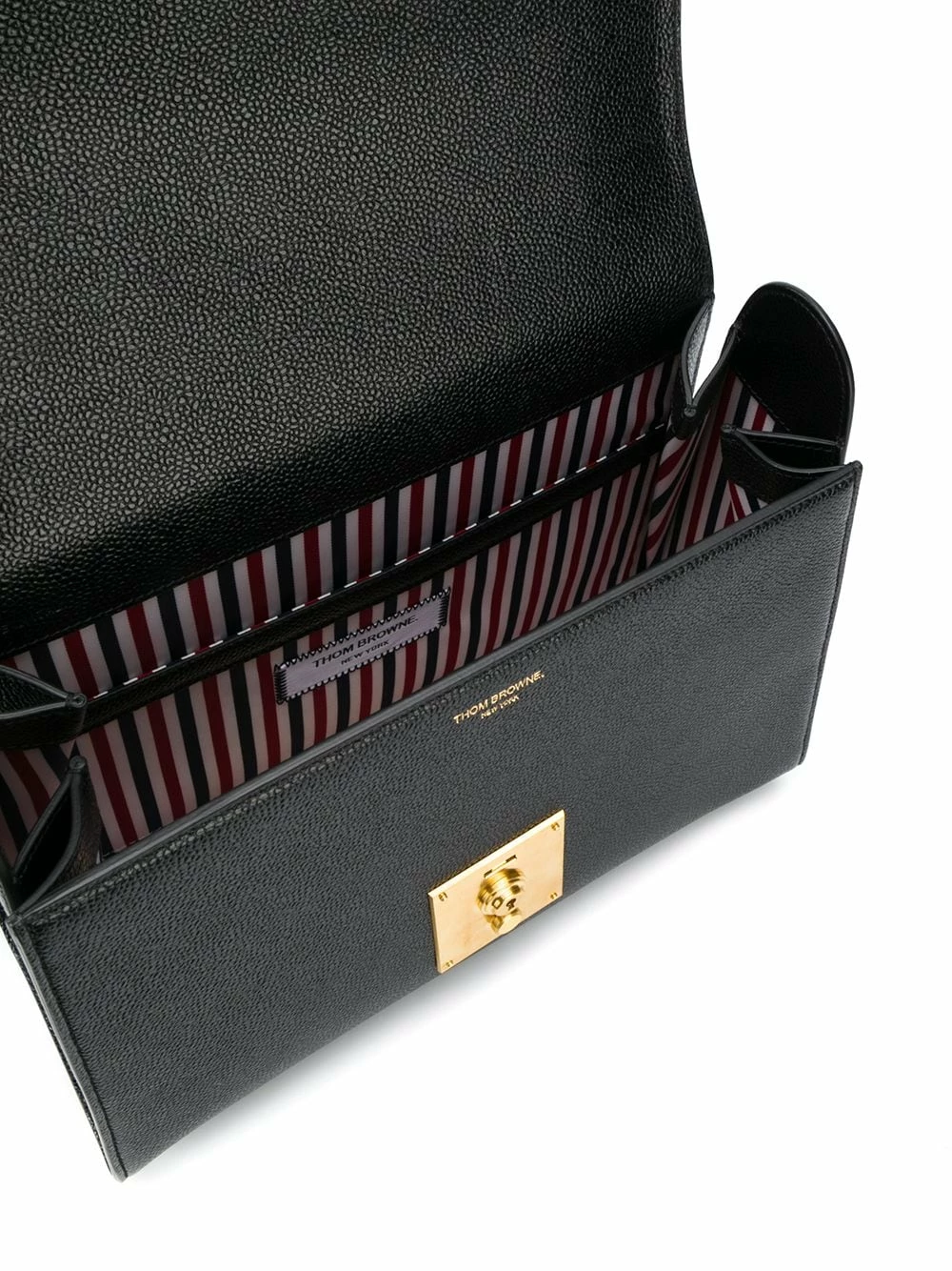 Feeling like saying “you transfix me quite” to this Thom Browne piece? We totally get you. Made from black pebbled calf leather, this Mrs. Thom flap crossbody bag is pretty much perfection on earth. Plus, you get to carry all you want inside of it. Featuring a round top handle, a hanging leather tag, a detachable shoulder strap, a foldover top with push-lock closure, gold-tone hardware, an internal logo patch, red, white and blue accents and a striped lining.
