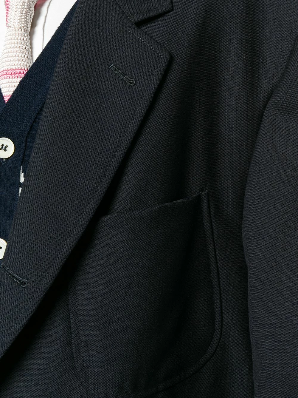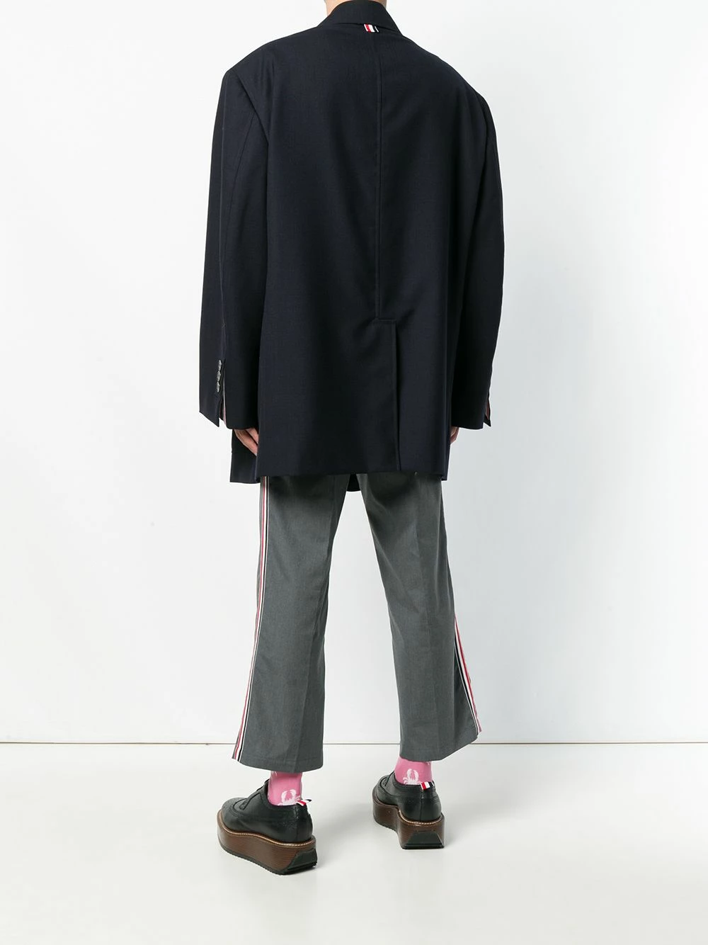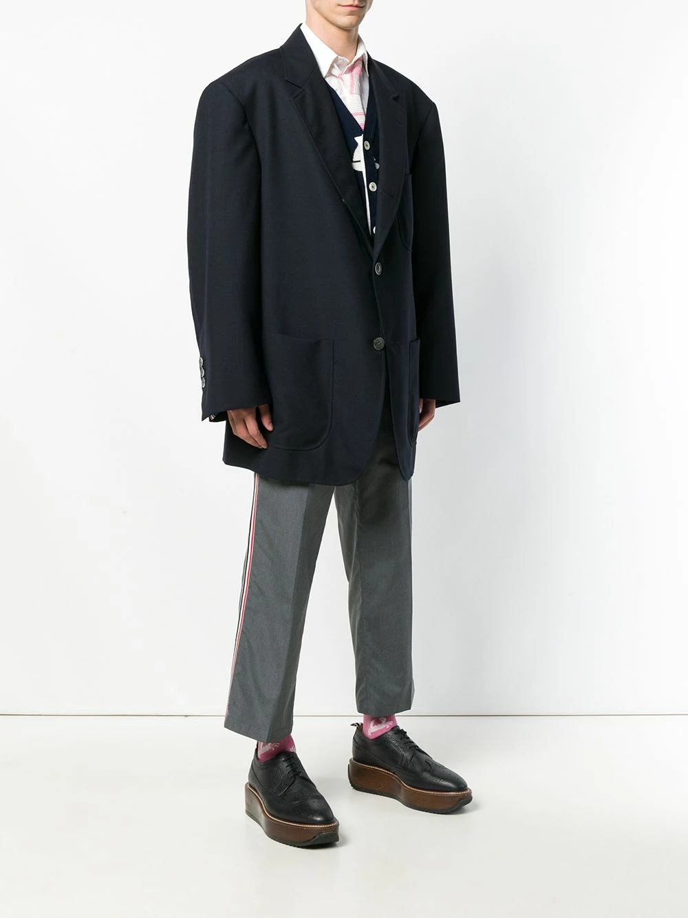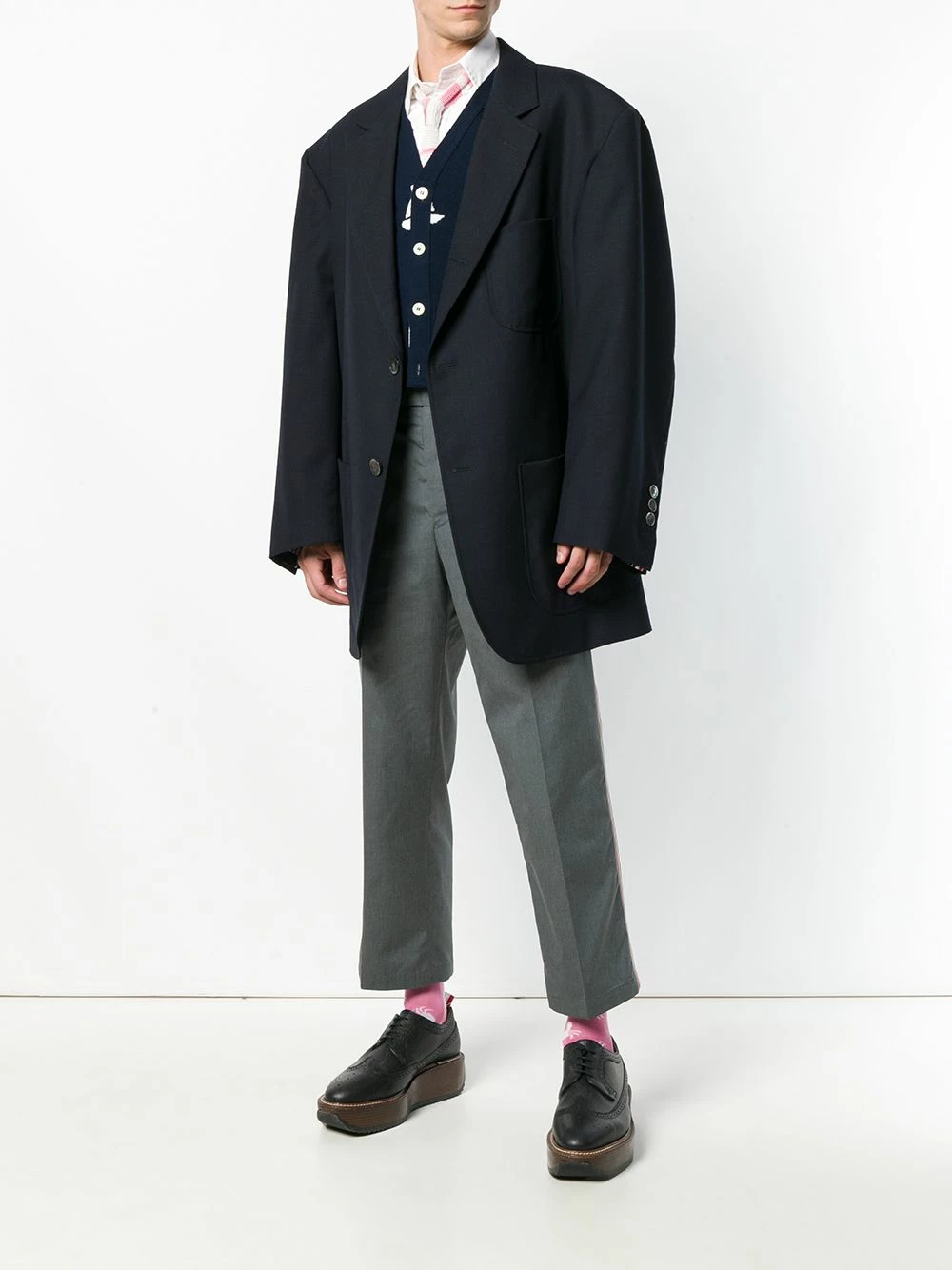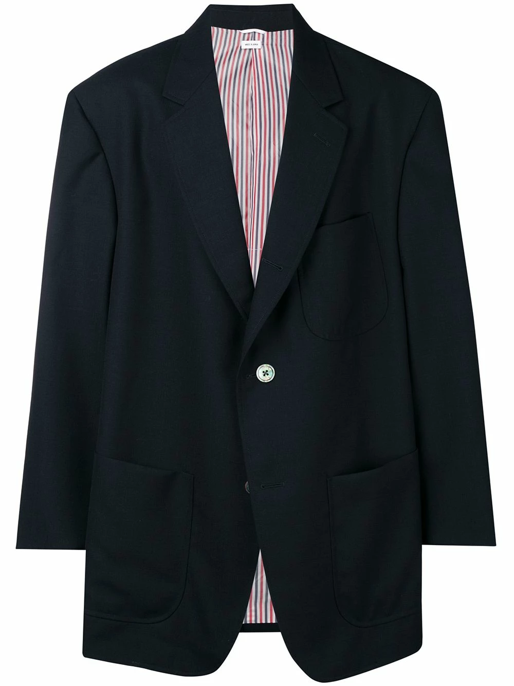Thom Browne’s latest menswear collection saw a technicolour re-interpretation of archival preppy silhouettes, with the American label boldly pushing the boundaries through garish prints and surreal proportions. Crafted from navy blue wool, this oversized patch pocket sport coat features notched lapels, a front button fastening, structured shoulders, elongated sleeves, button cuffs, a chest pocket, two front pockets, a rear central vent, an oversized fit and a tricolour grosgrain tab on the rear.
