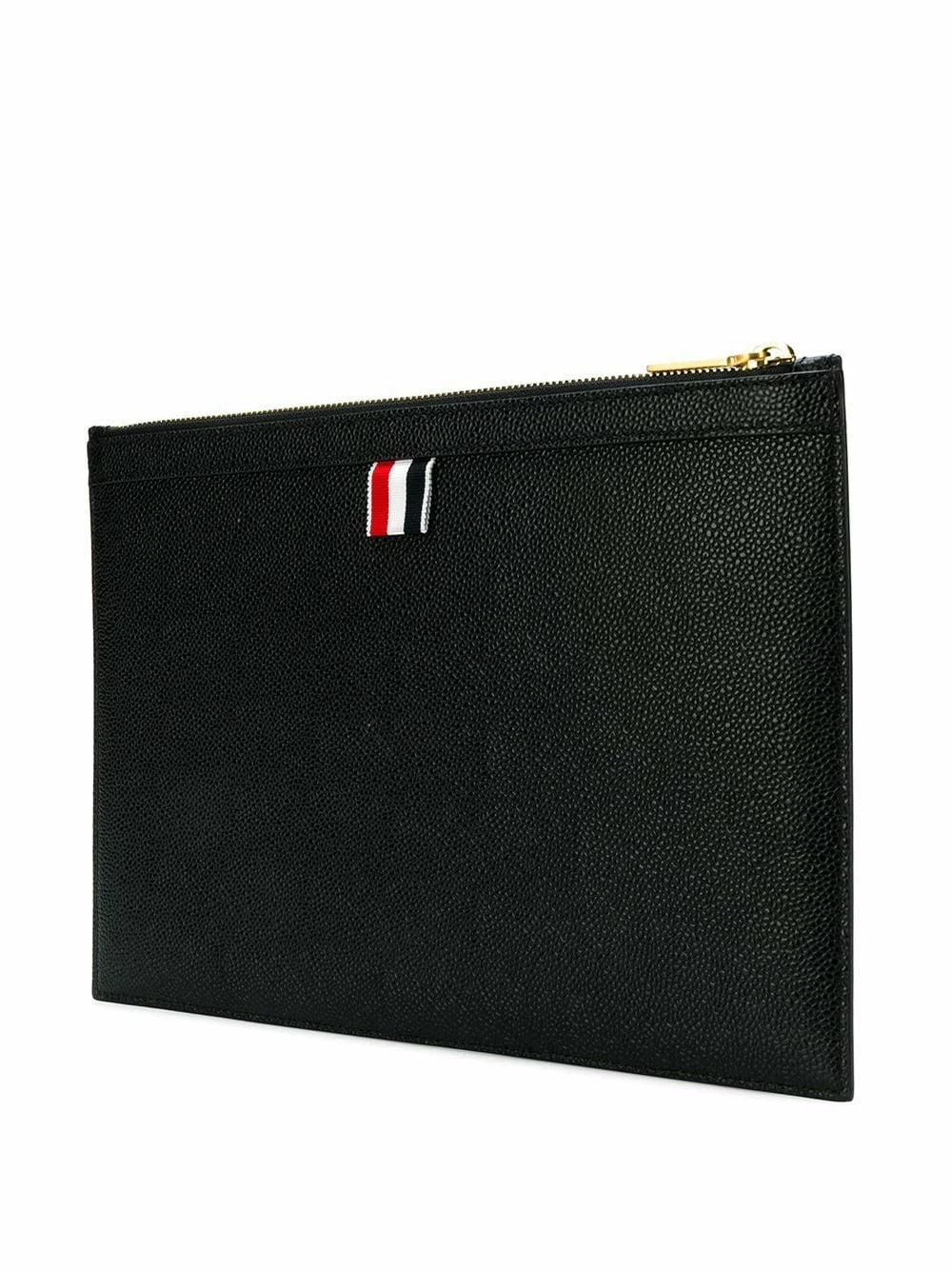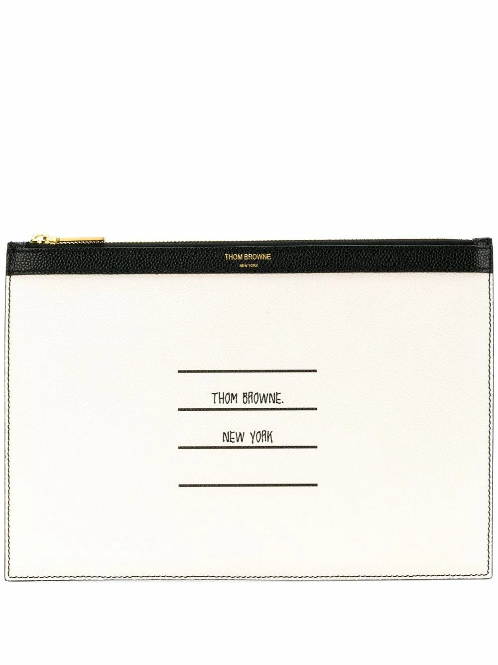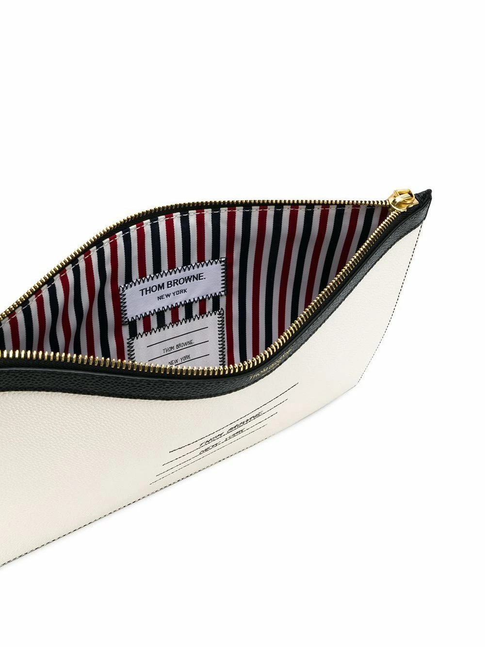Black and white leather Paper Label Small Tablet Holder from Thom Browne featuring a panelled colour block design, gold-tone hardware, a top zip fastening, a signature tri-colour striped trim, a front centre logo stamp, an internal logo patch and a striped lining.