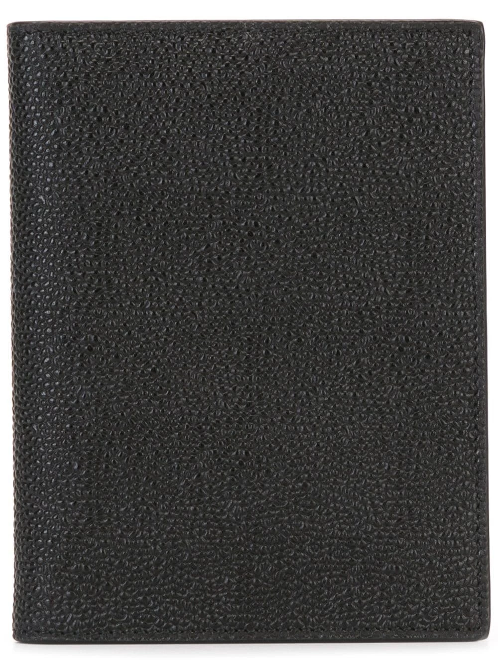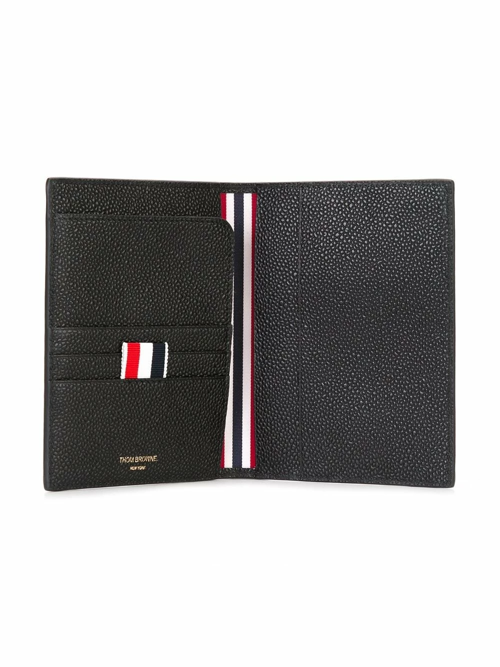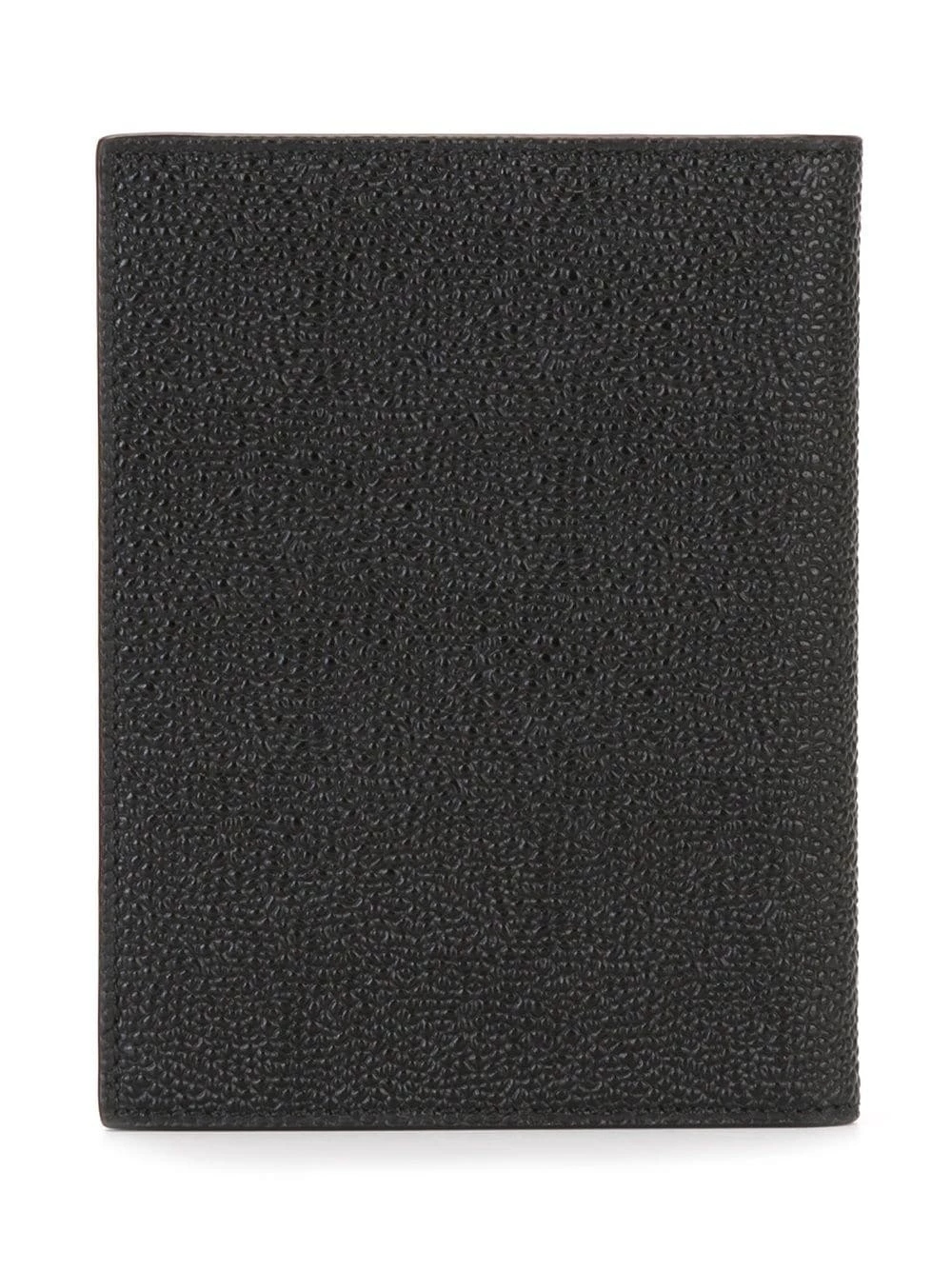 Black leather Passport Holder In Pebble Grain from Thom Browne featuring a pebbled leather texture, multiple interior card slots, internal slip pockets and an internal logo stamp.