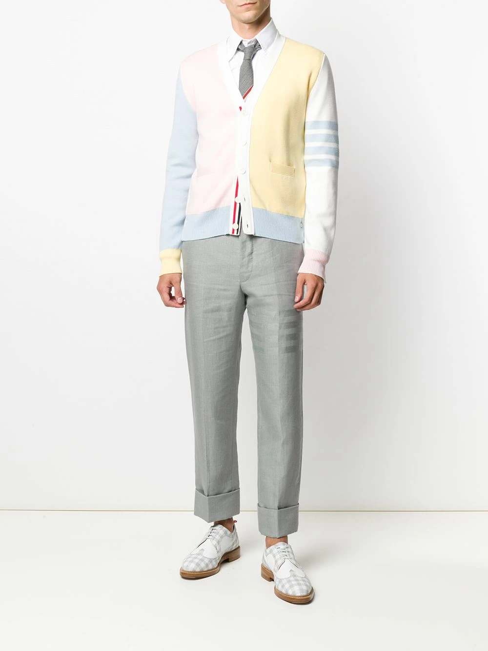 Pure pastel perfection. This cotton knit cardigan from Thom Browne features side stripe detail, v-neck, front button fastening and pastel colour palette. For those in touch with their feminine side.