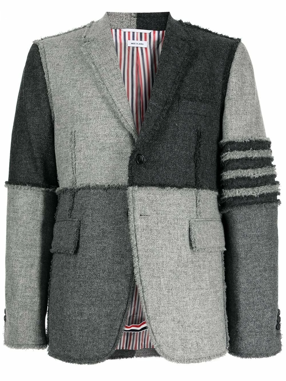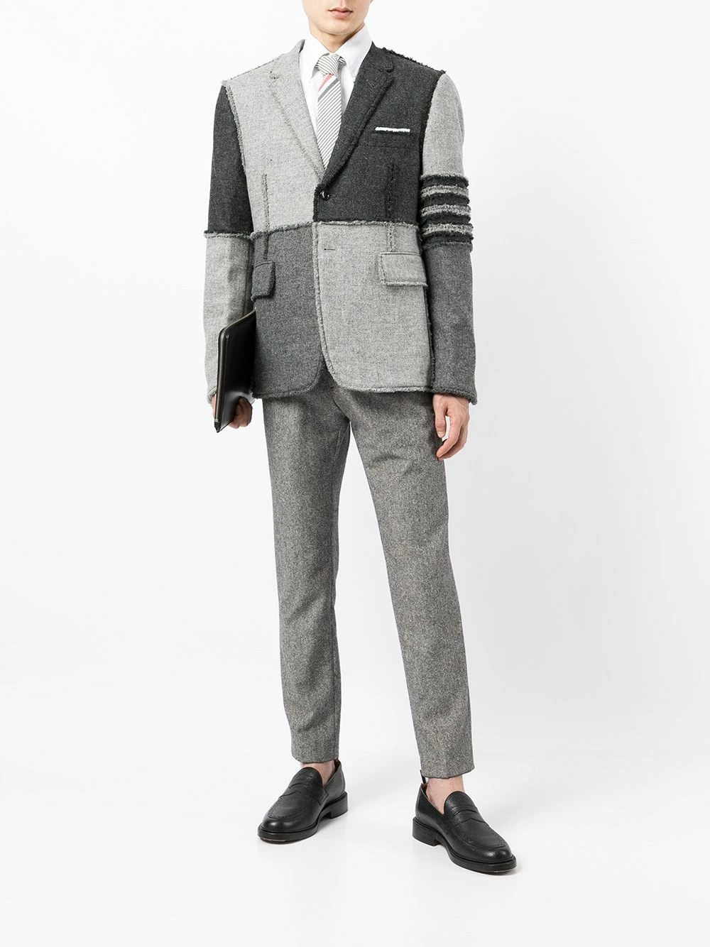 Thom Browne’s ability to transform classic silhouette is showcased by this blazer. Crafted from wool and cut into a traditional single-breasted silhouette, its patchwork construction adds a contemporary touch – note the frayed details.