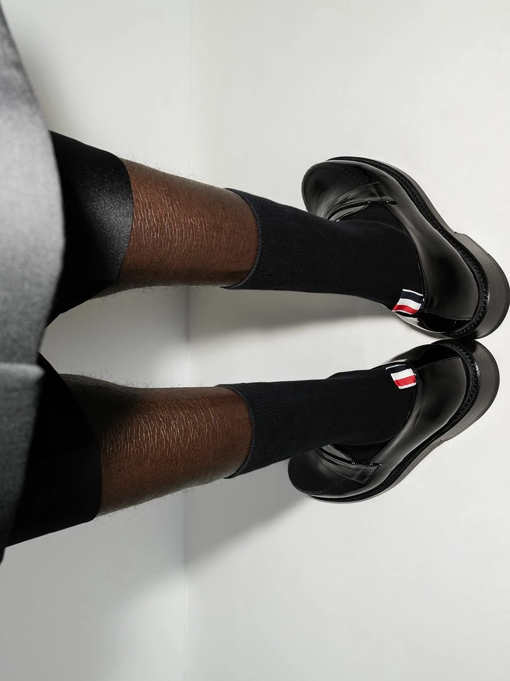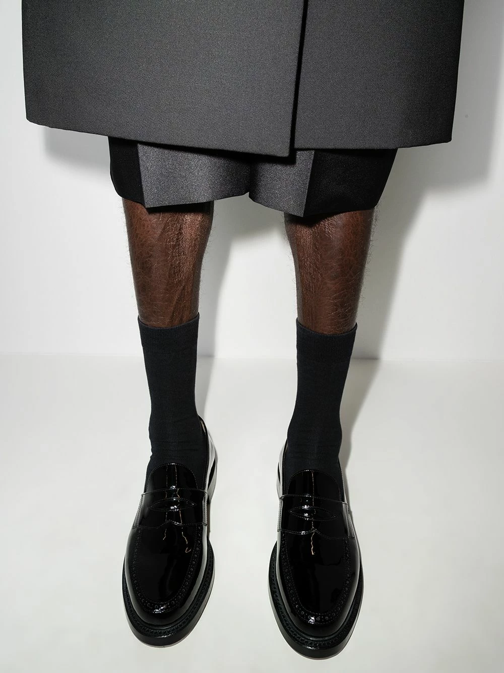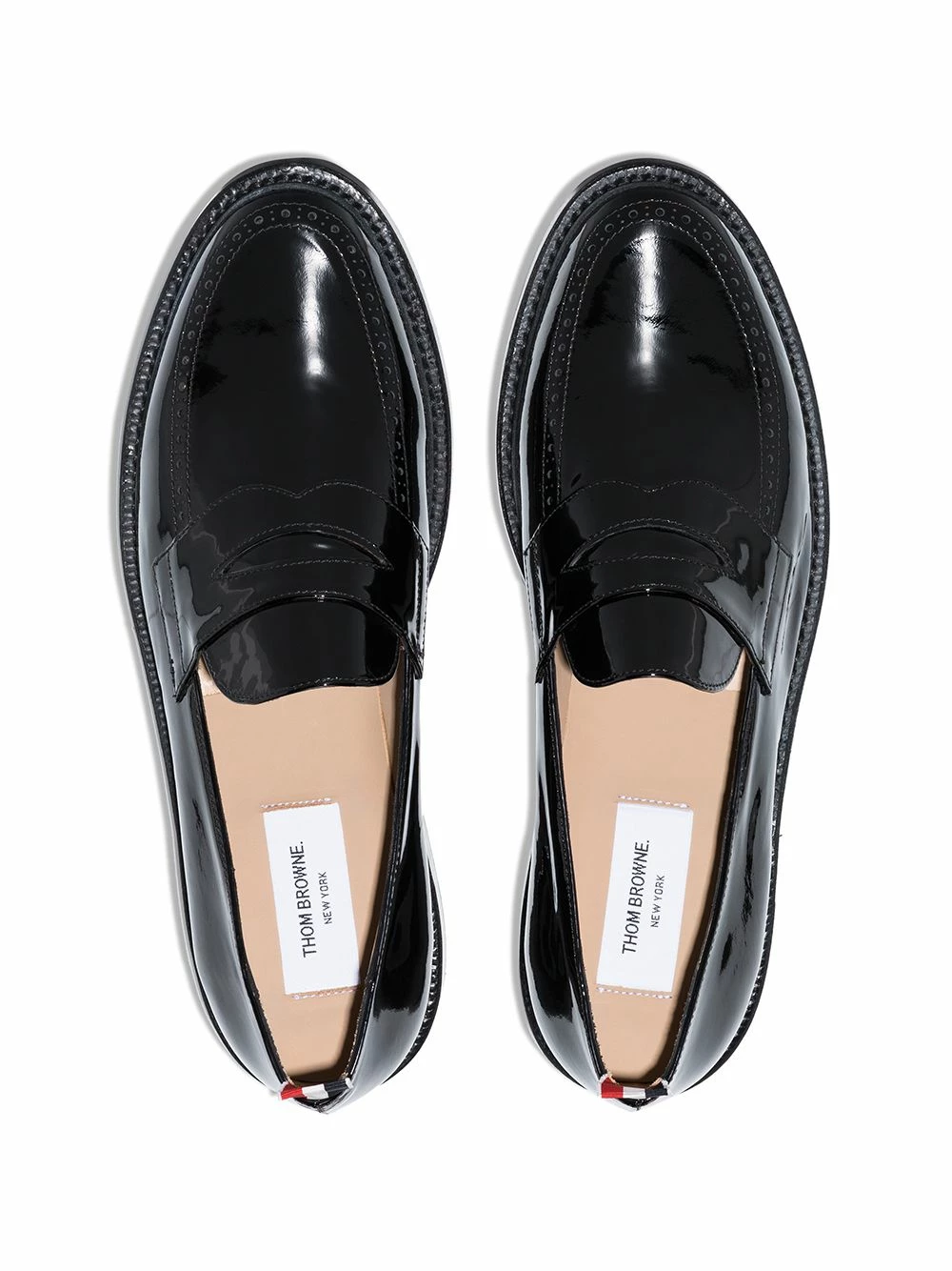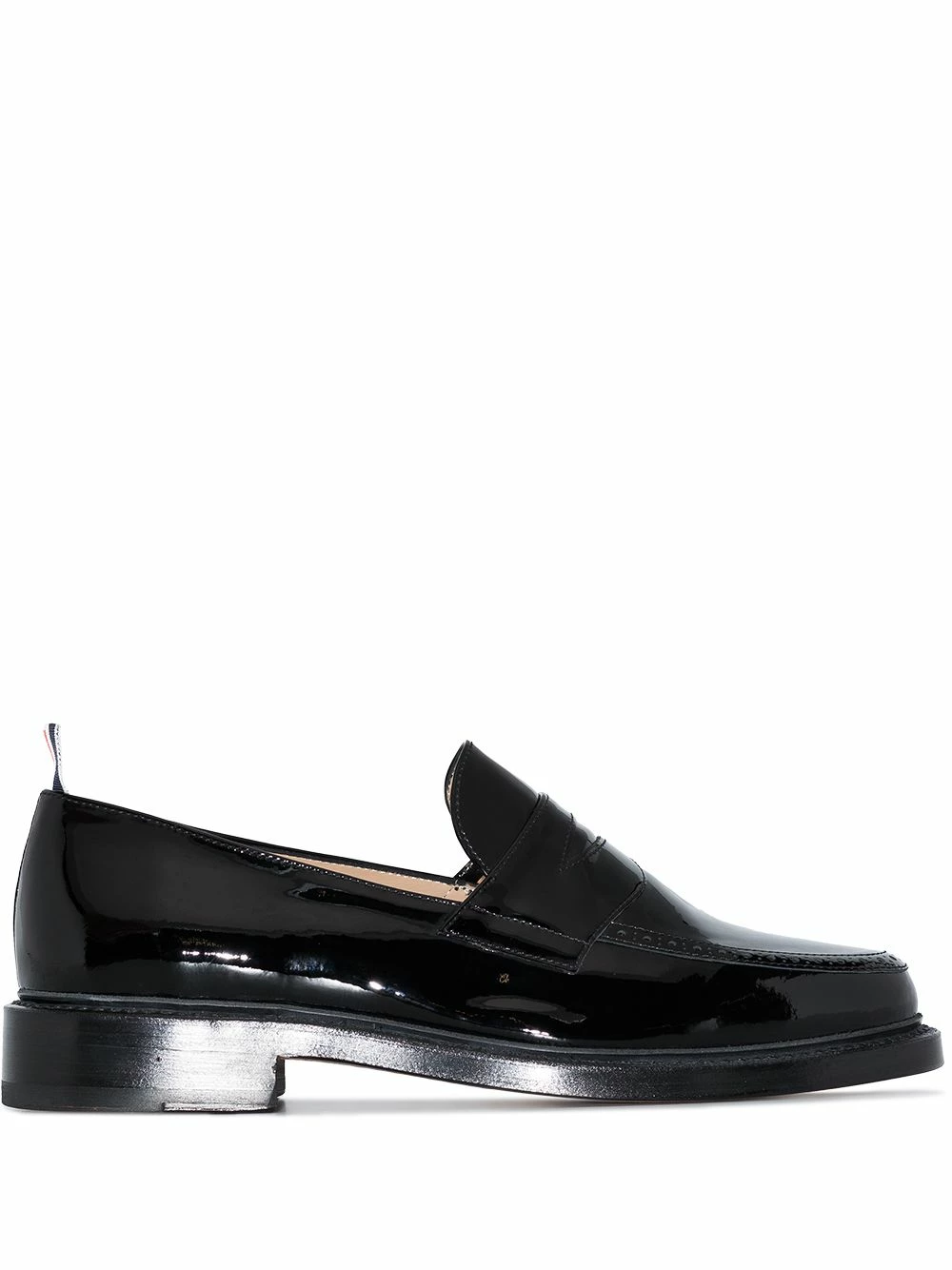 A patent leather construction adds a glossy finish to these Thom Browne penny loafers. The design is finished with a signature grosgrain loop tab for a touch of recognition.