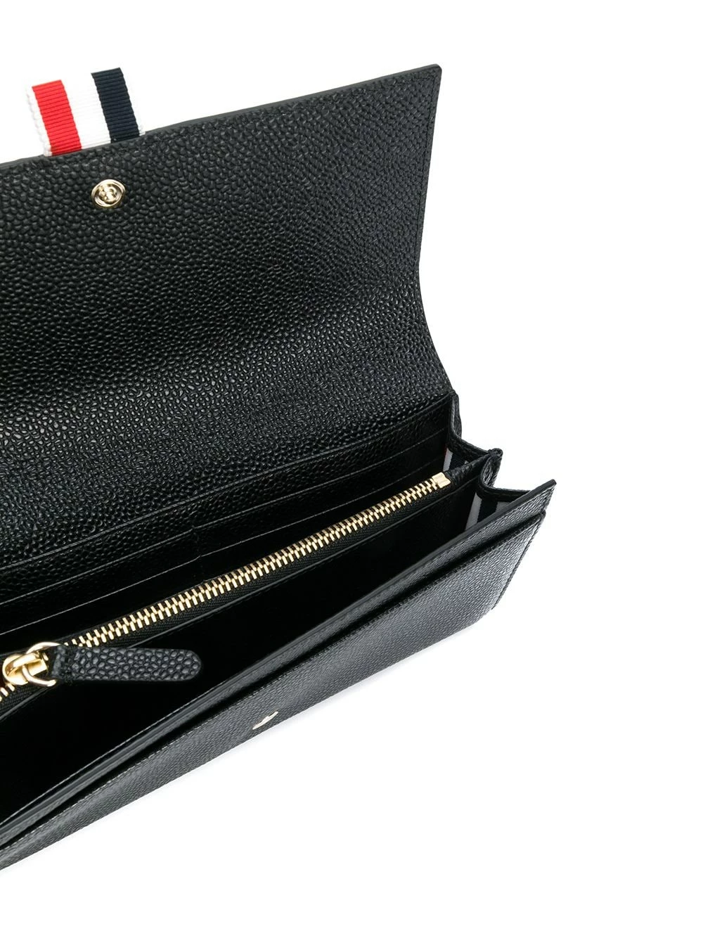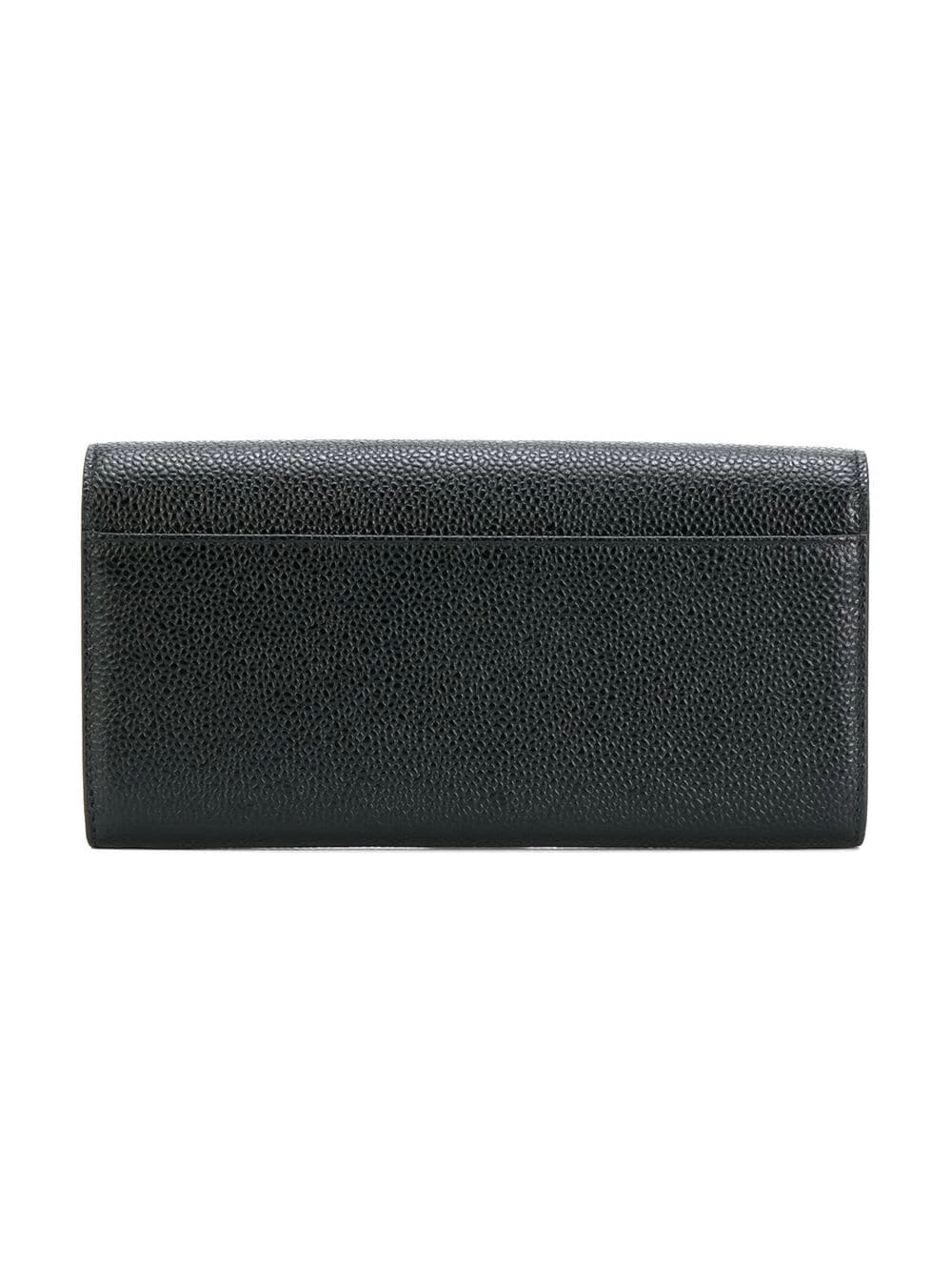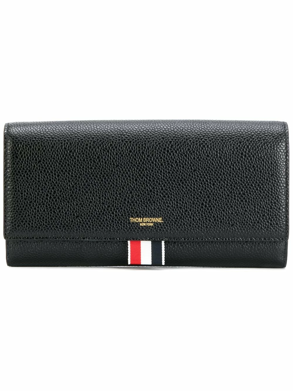 Successfully nominated to and winner of a series of Designer Of The Year titles, Thom Browne began his journey in ready-to-wear in 2003. Perpetuating a timeless craftsmanship of handmade tailoring, his innovative garments are recognised by many museums around the world, just as his collections are equally esteemed in all corners of the globe. Crafted in Italy, this continental wallet is constructed from black calf leather with a pebble grain effect. The model features a foldover top with a snap closure, interior compartments divided by a gold-tone zipped partition, four card slots and an open front pocket. The delicate details are found on the signature striped lining at the accordion-style interior, at the signature pull tab at the front and the classic metallic logo stamp at the flap.