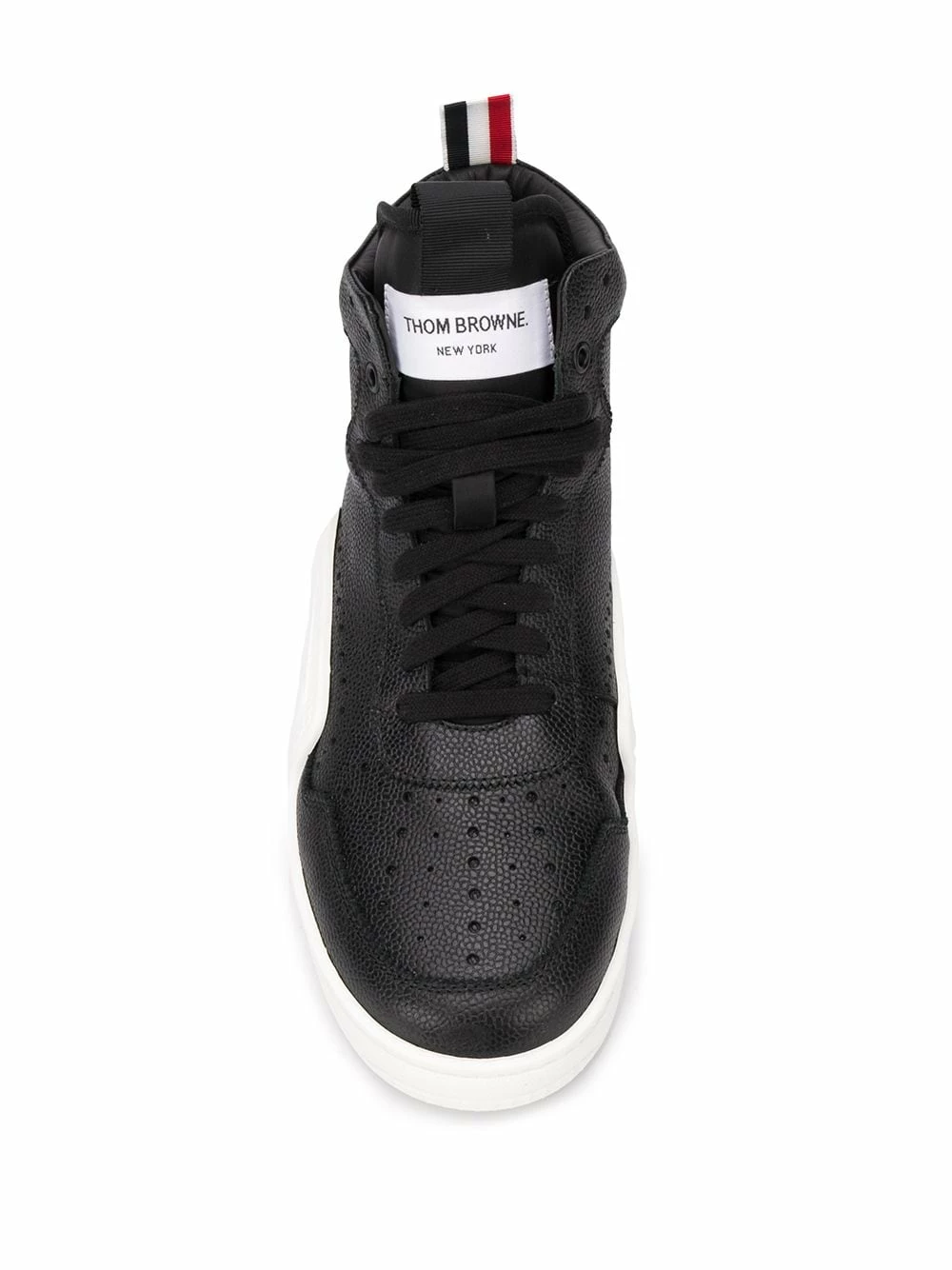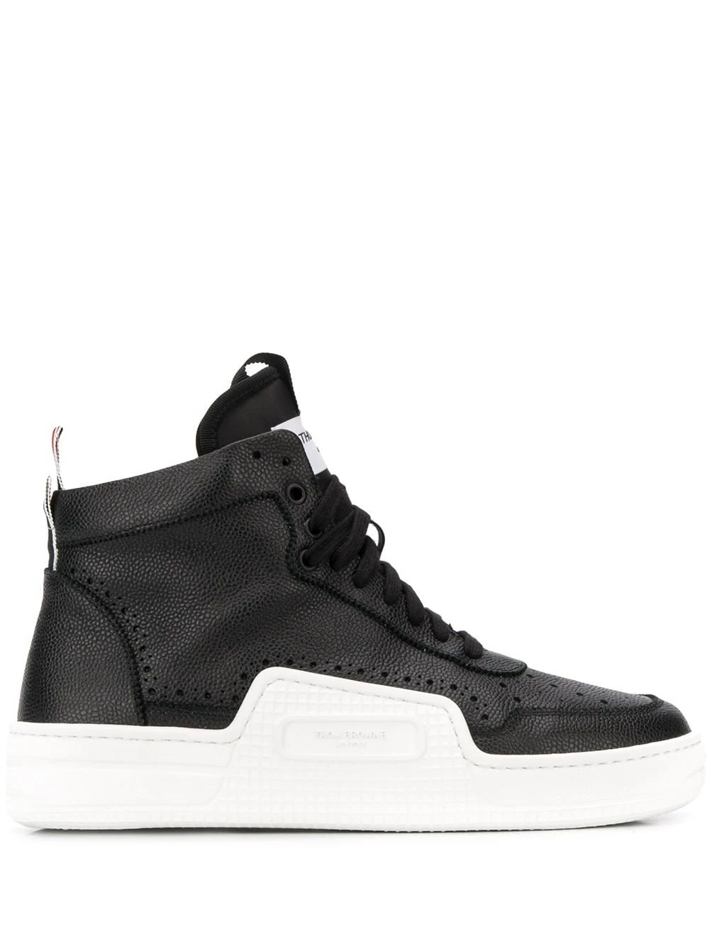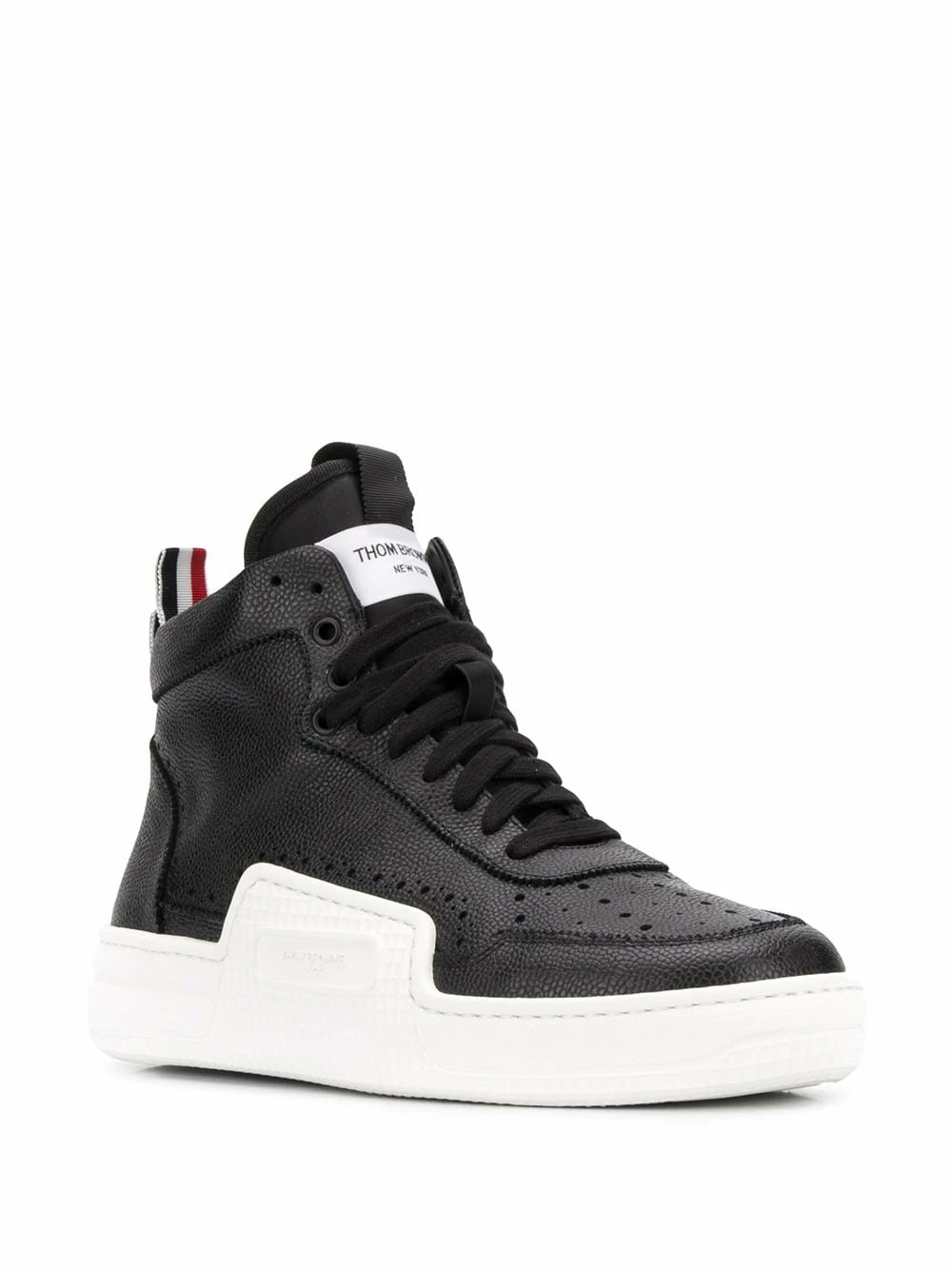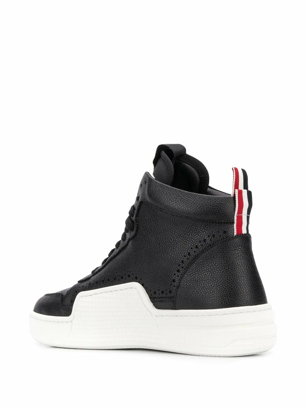 Whether you’re on or off the court, look the part in these RWB basketball hi-top sneakers from Thom Browne. Crafted in calf leather, these black hi-tops are detailed with perforations and a signature branded stripe rear pull tab. Shoot some hoops in style. Featuring a round toe, a perforated detail, a lace-up front fastening, a logo patch at the tongue, a pull tab at the rear and a white rubber sole.