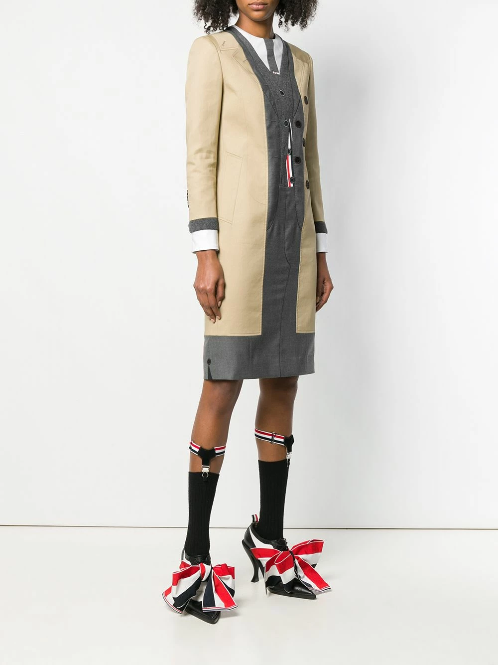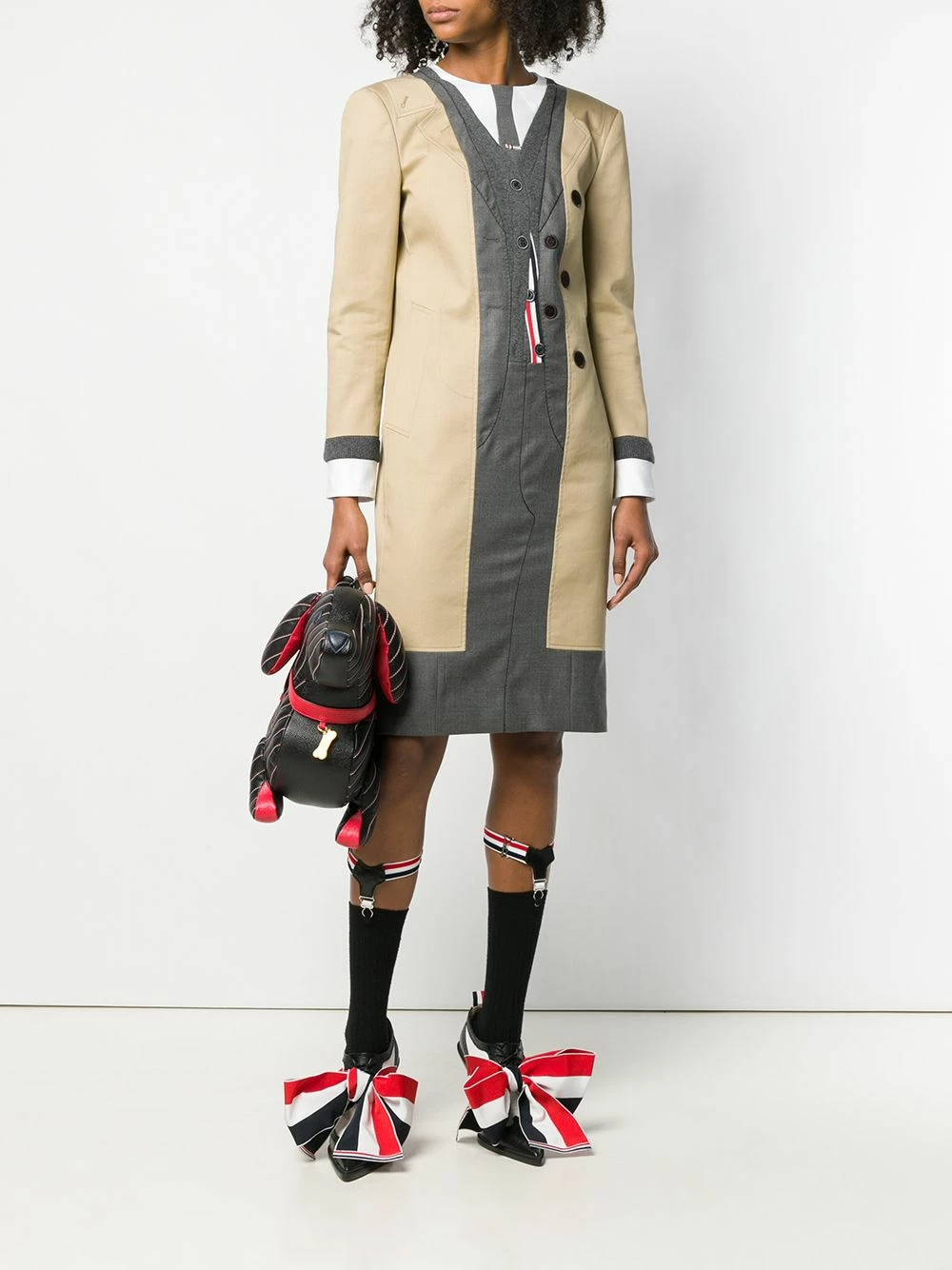 Looking for a quirky touch? Look no further than this suit-style dress from Thom Browne. You could say that it ‘suits’ your style. Featuring a round neck, long sleeves, a rear zip fastening, button cuffs, a knee length, a suit style, a signature grosgain loop tab and RWB details.