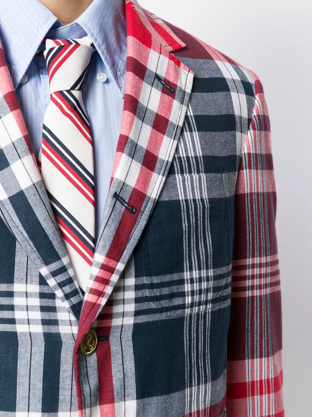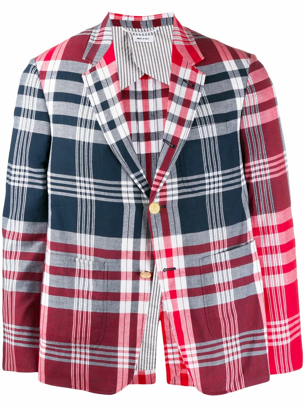 Launched in 2003, Thom Browne is internationally celebrated for its clean-cut silhouettes and couture-like sensibilities. Crafted from red. white and blue cotton, this plaid Madras-print sport blazer features notched lapels, a front button fastening, long sleeves, front pockets, a check print, button cuffs, a back slit at hem and a boxy fit.