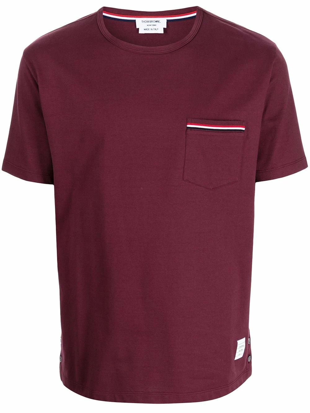 Thom Browne updates the classic short-sleeve T-shirt with signature details. This dark red cotton top has a chest patch pocket at the chest, trimmed with the brand’s RWB stripe.