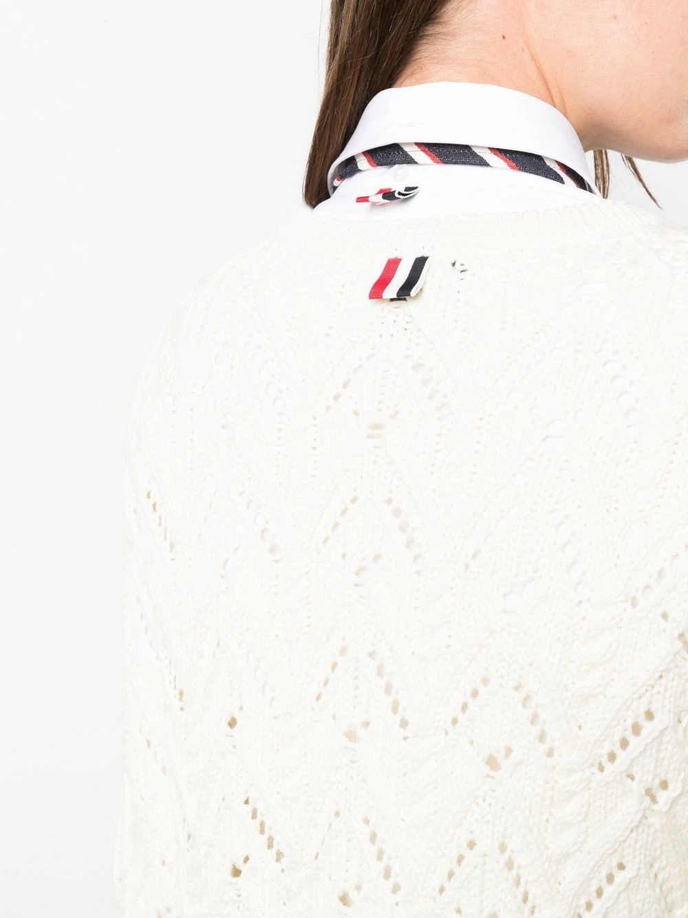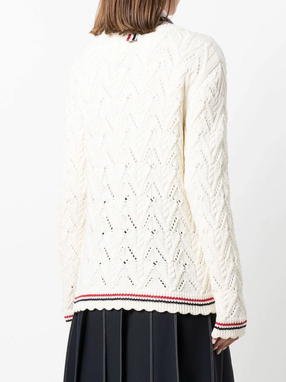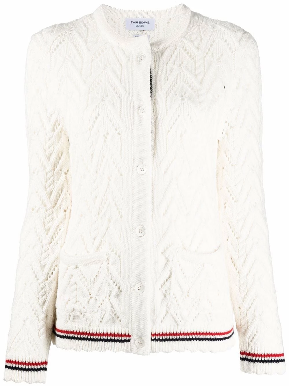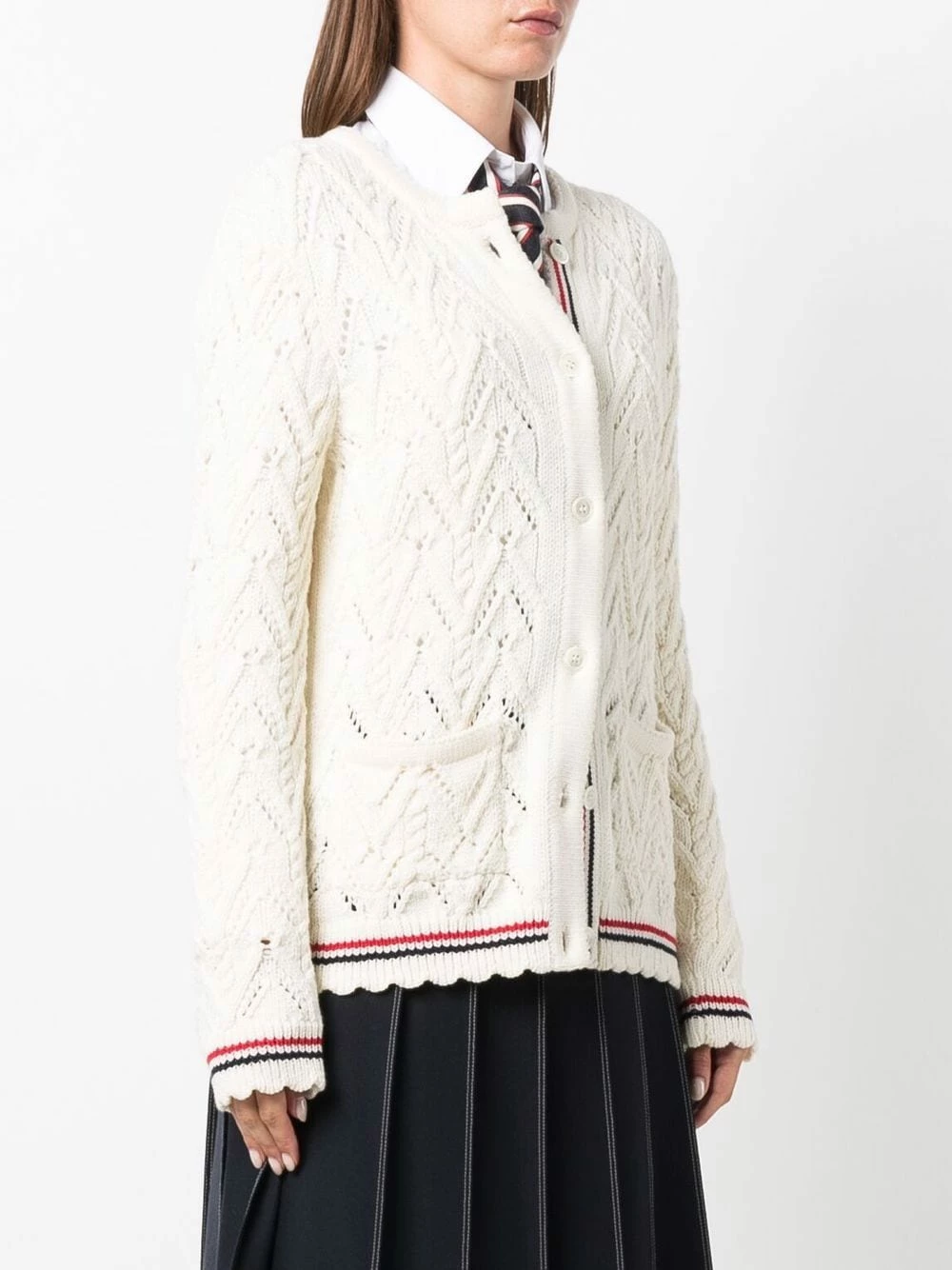 Thom Browne’s put-together aesthetic is maintained with the introduction of this merino cardigan. Boasting the signature RWB detail, it has a pointelle knit and is trimmed with a soft scallop edge.