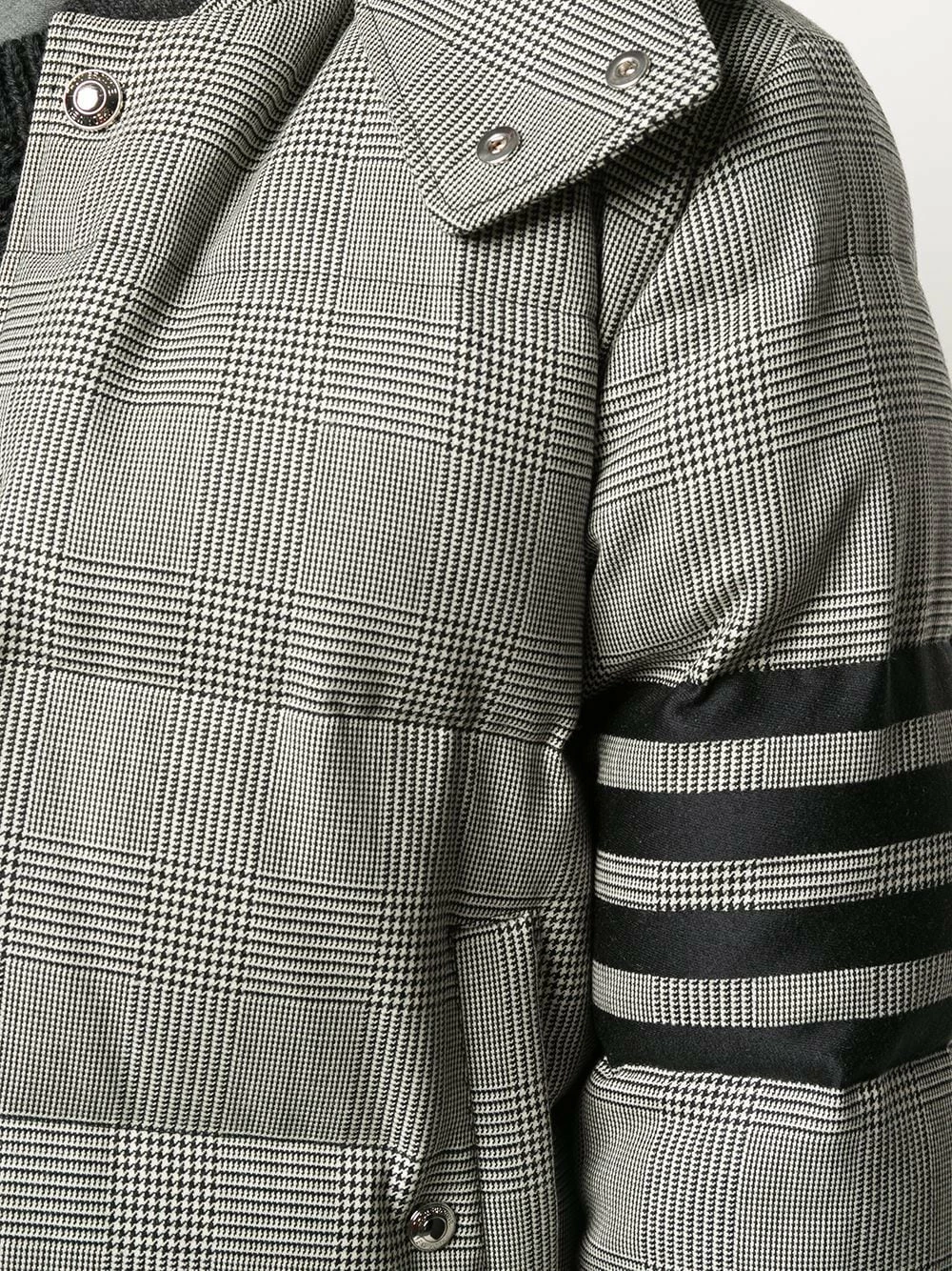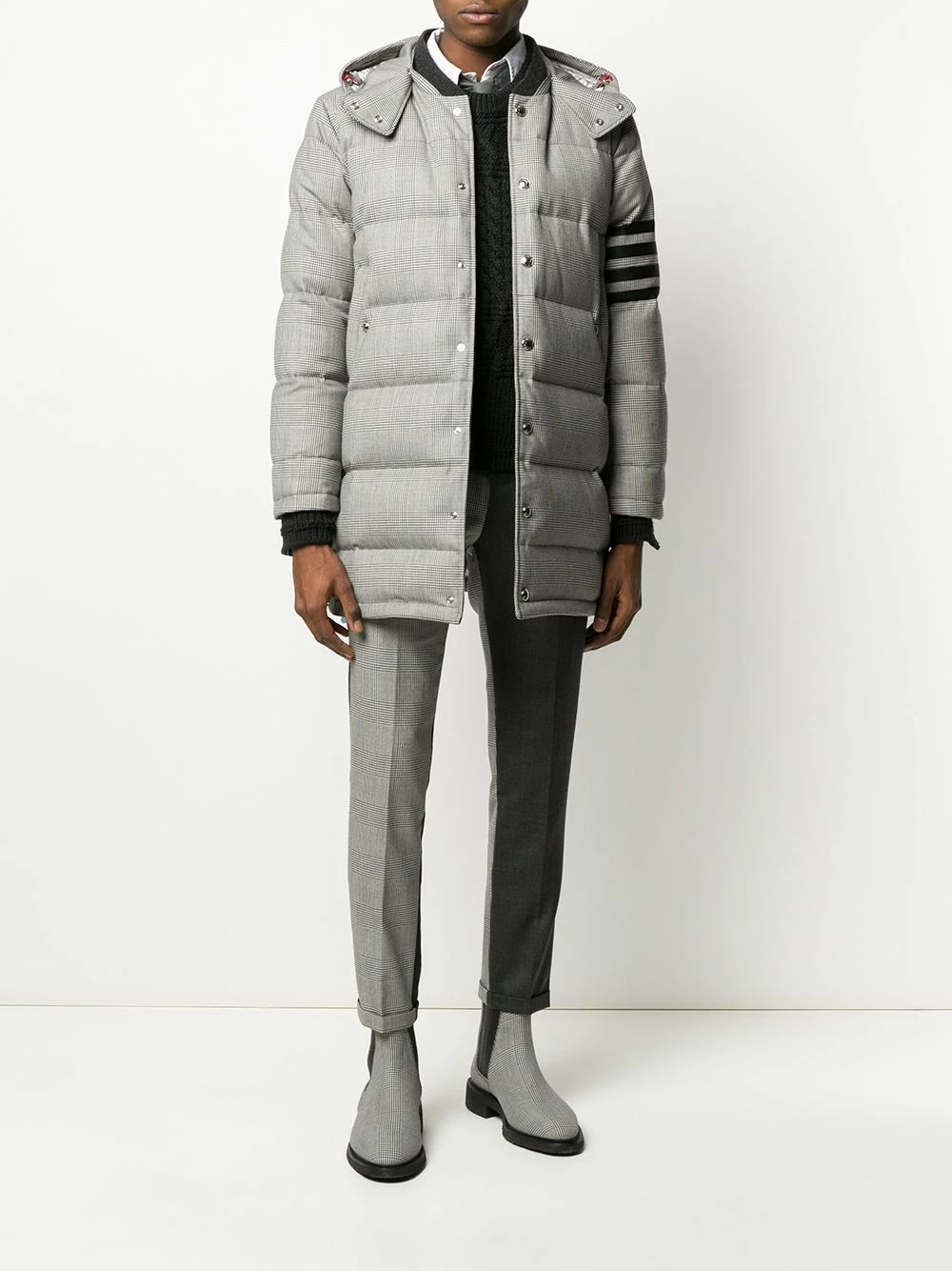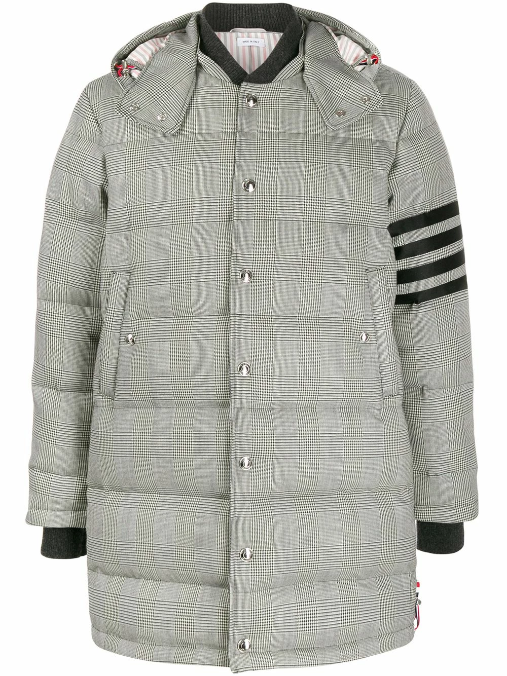 Versatility is the key to a successful wardrobe and this Prince of Wales padded coat from Thom Browne certainly offers that. It is topped with a detachable hood so you can alter your look based on your mood, or perhaps more suitably the weather. Check it out. Featuring a detachable hood, a snap fastening, side pockets, 4-bar stripes on the sleeve, a Prince of Wales check pattern and down-feather filling.