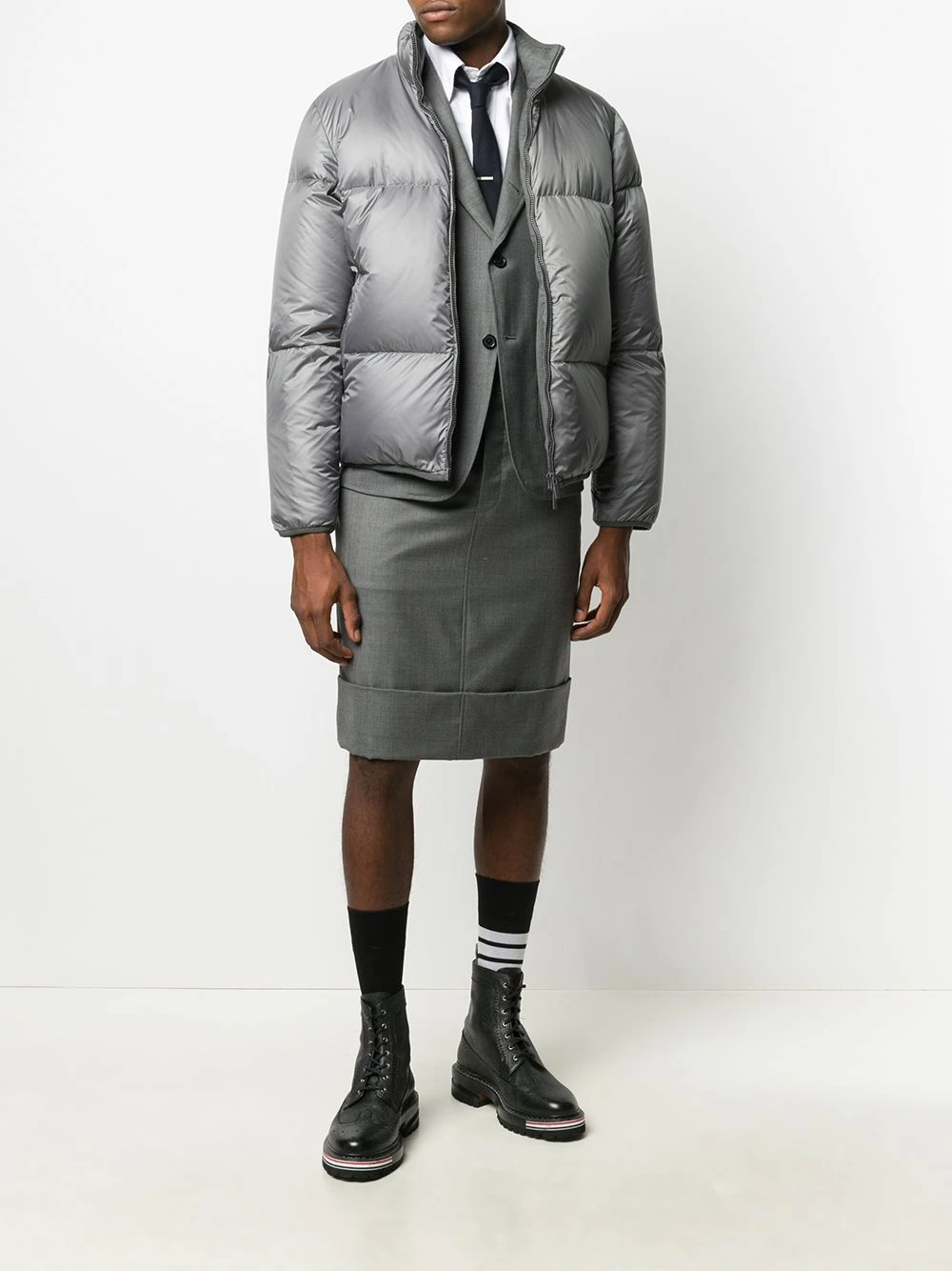 Keep warm in the coolest way possible. The grey of the piece gives a metallic sheen to the already gleaming, padded piece. Goose-down filling ensures you are insulated to the highest standard possible. You’ll be sad when warmer weather comes around.