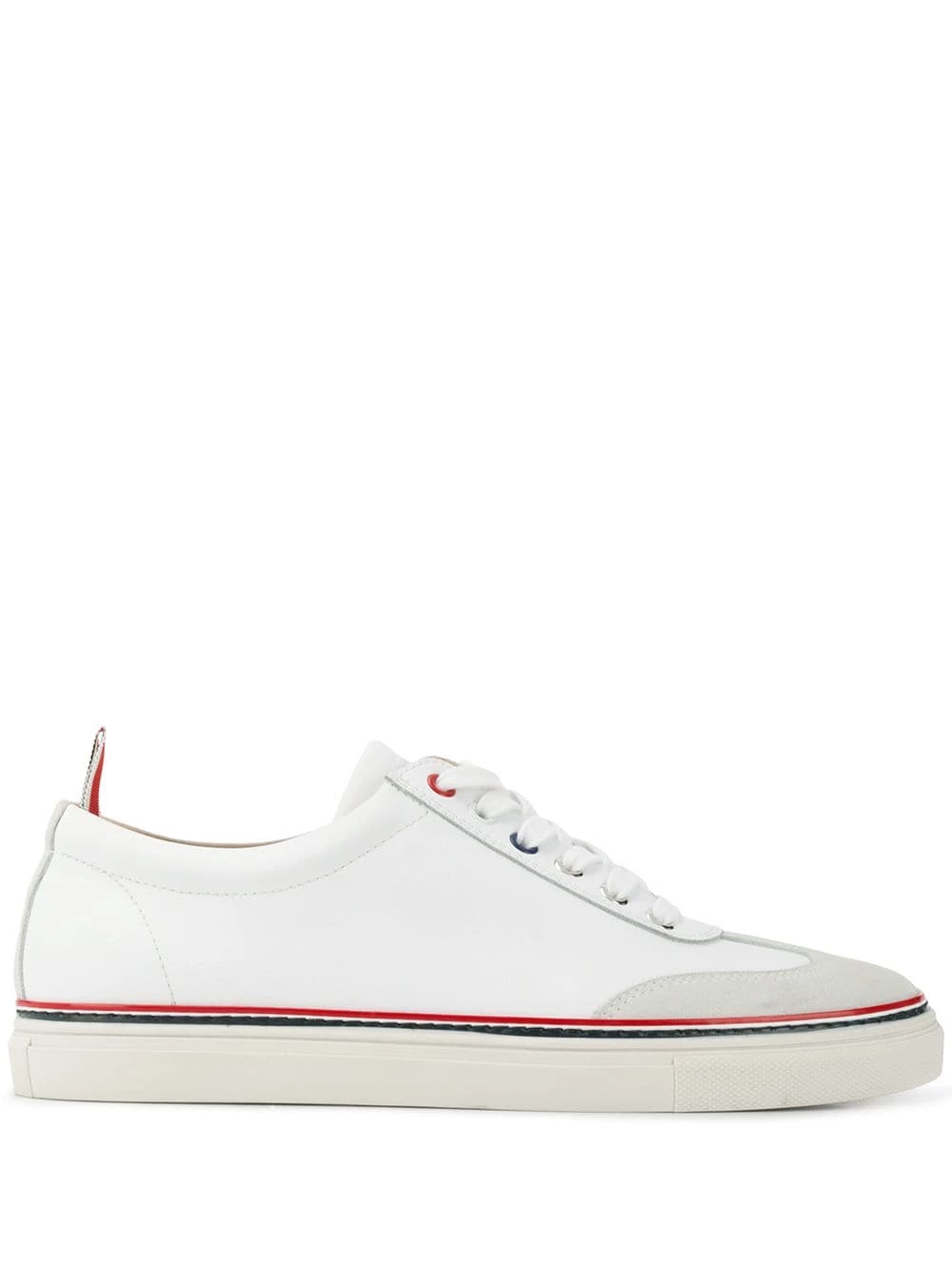 Looking to win in the style race? Pull on these RWB-detail Thom Browne sneakers to cross the finish line. Go for gold! Featuring a logo patch at the tongue, a brand embossed insole, a round toe, a front lace up detail, a white rubber sole, a signature grosgrain loop tab and RWB details.