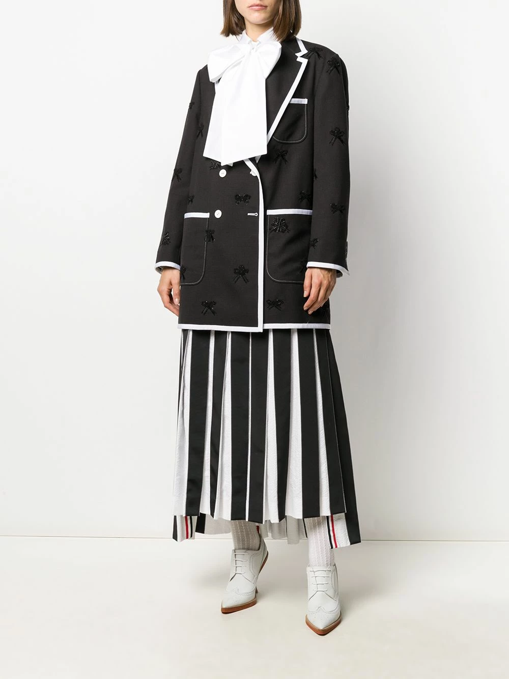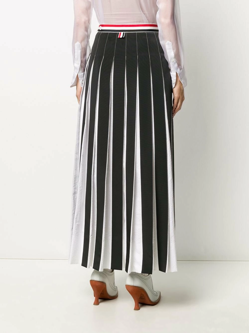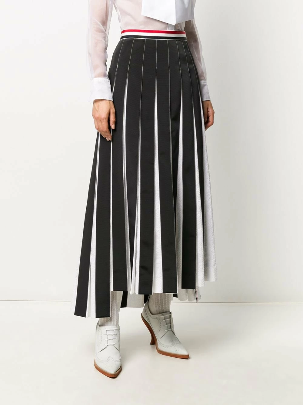Walk into your next business meeting in confidence and style with this RWB-detail ankle-length skirt from Thom Browne. Fully pleated, it will guarantee an elegant silhouette. All eyes on you.