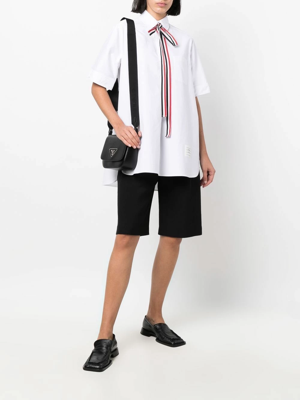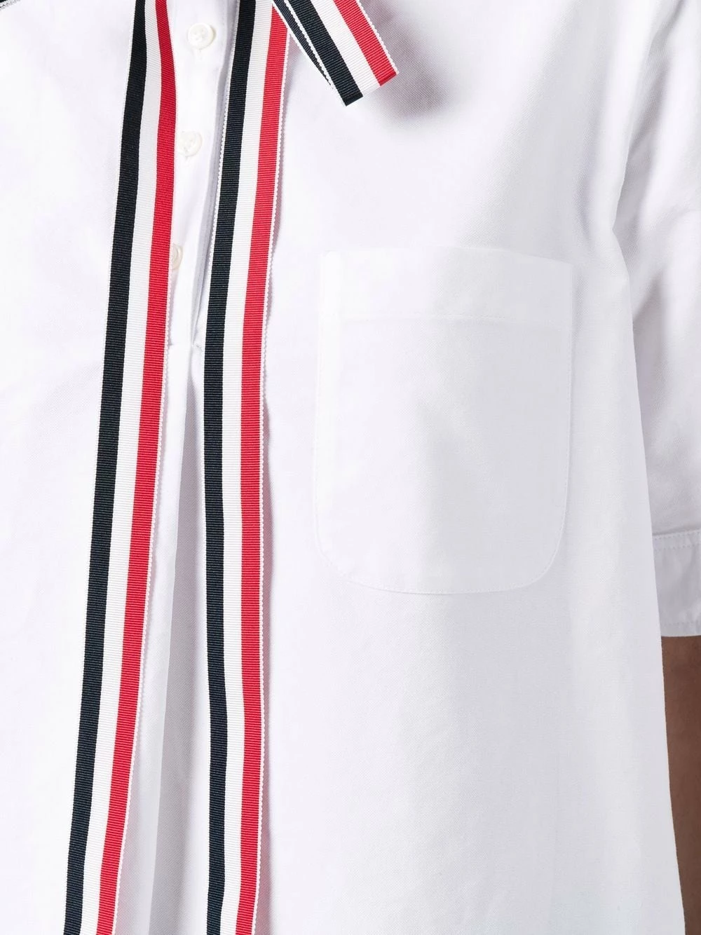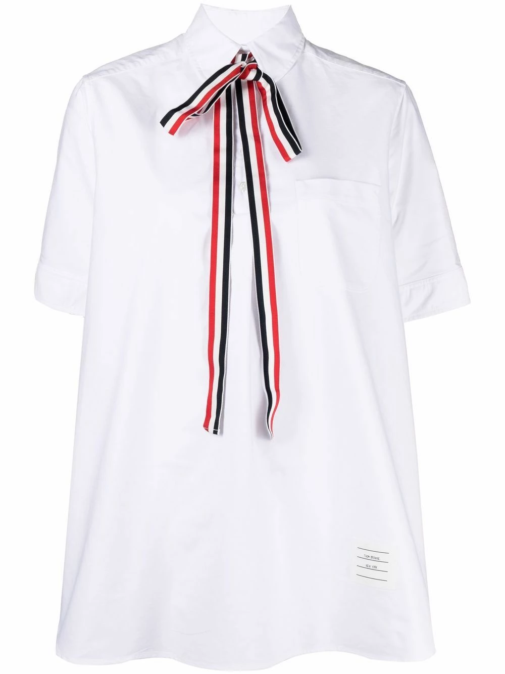 Mirroring the clean lines and signature house codes of the American brand, Thom Browne presents this cotton blouse for AW21. The front button placket and point collar offer practicality, while the iconic RWB stripe pussybow brings fashion knowledge to the scene.