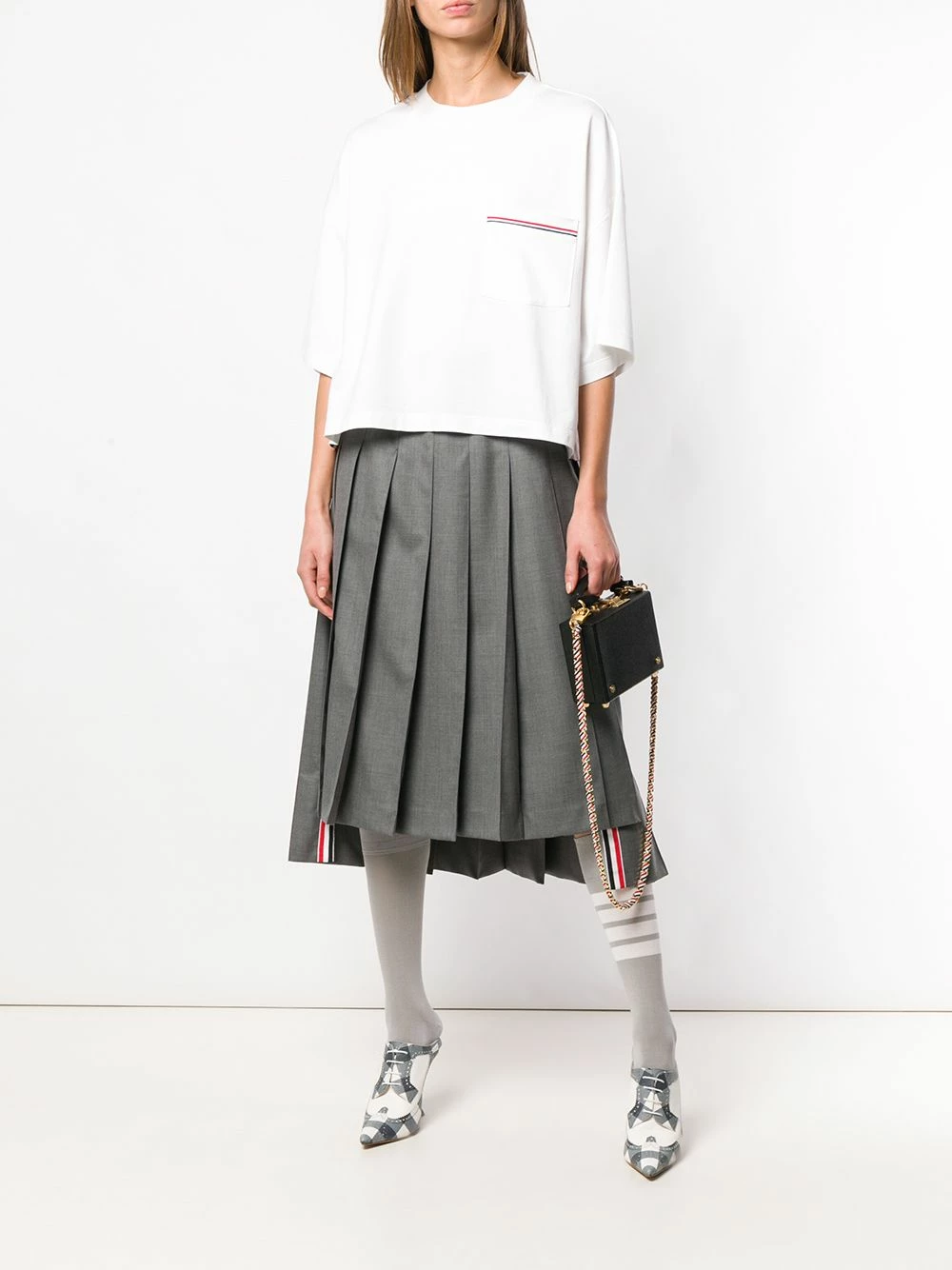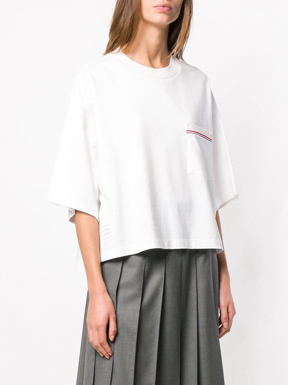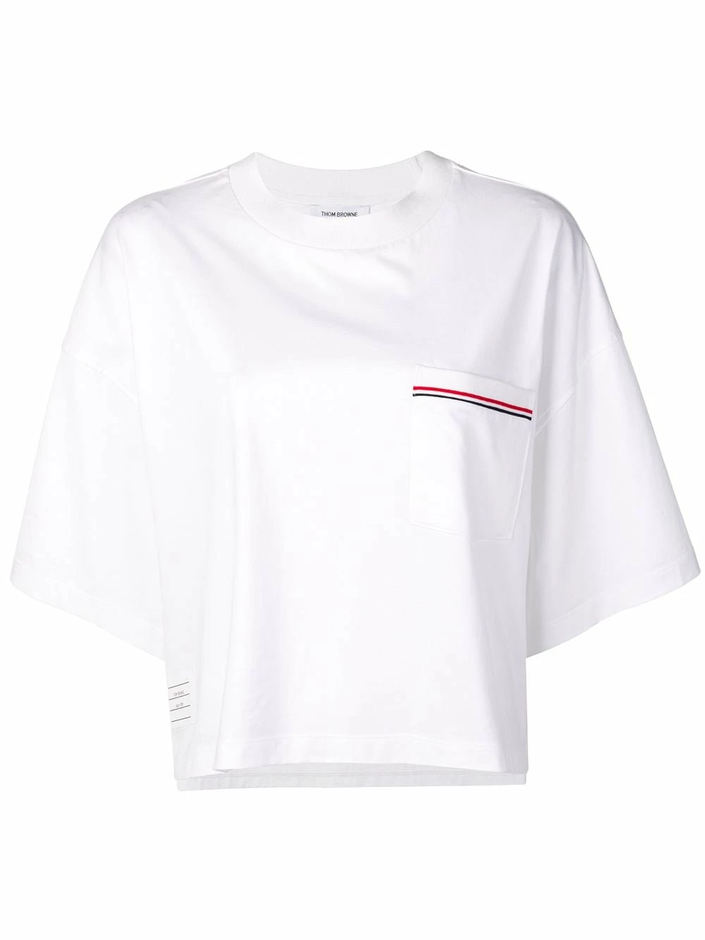 A classic white T-shirt…with a twist. The RWB-stripe on this Thom Browne piece is sure to grab attention. Show off your laid-back, preppy style. Featuring a ribbed crew neck, dropped shoulders, three-quarter length sleeves, a patch pocket at the chest, side slits, a high low hem, a side button fastening and a signature grosgrain loop tab.
