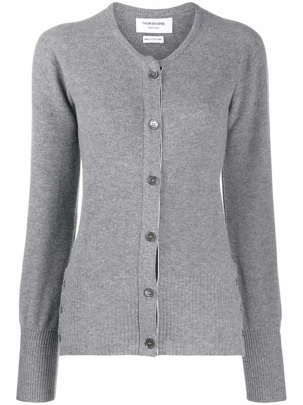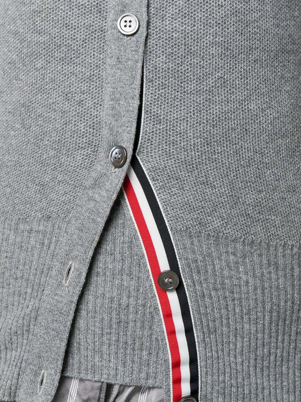 Feeling nostalgic for your old school style? Go for this RWB cashmere cardigan from Thom Browne. And this piece doesn’t even come with compulsory Maths lessons! Featuring a v-neck, a front button fastening, a relaxed fit, a ribbed hem and cuffs, long full sleeves, RWB stripes and a RWB tab.