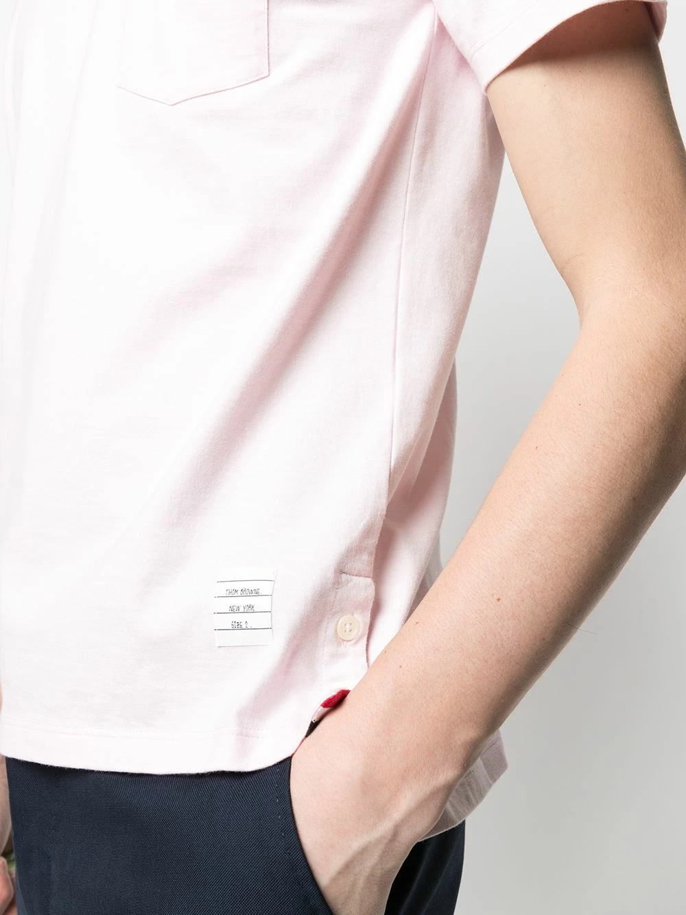 A classic piece with a touch of Thom Browne. This pink T-shirt comes with the instantly recognizable RWB stripe that will add a modern feeling to your casual outfits. Get noticed.
