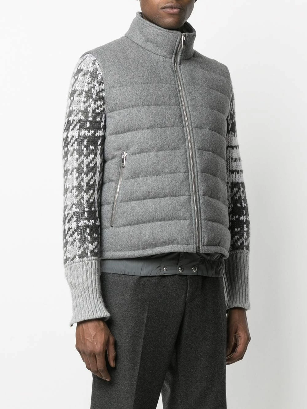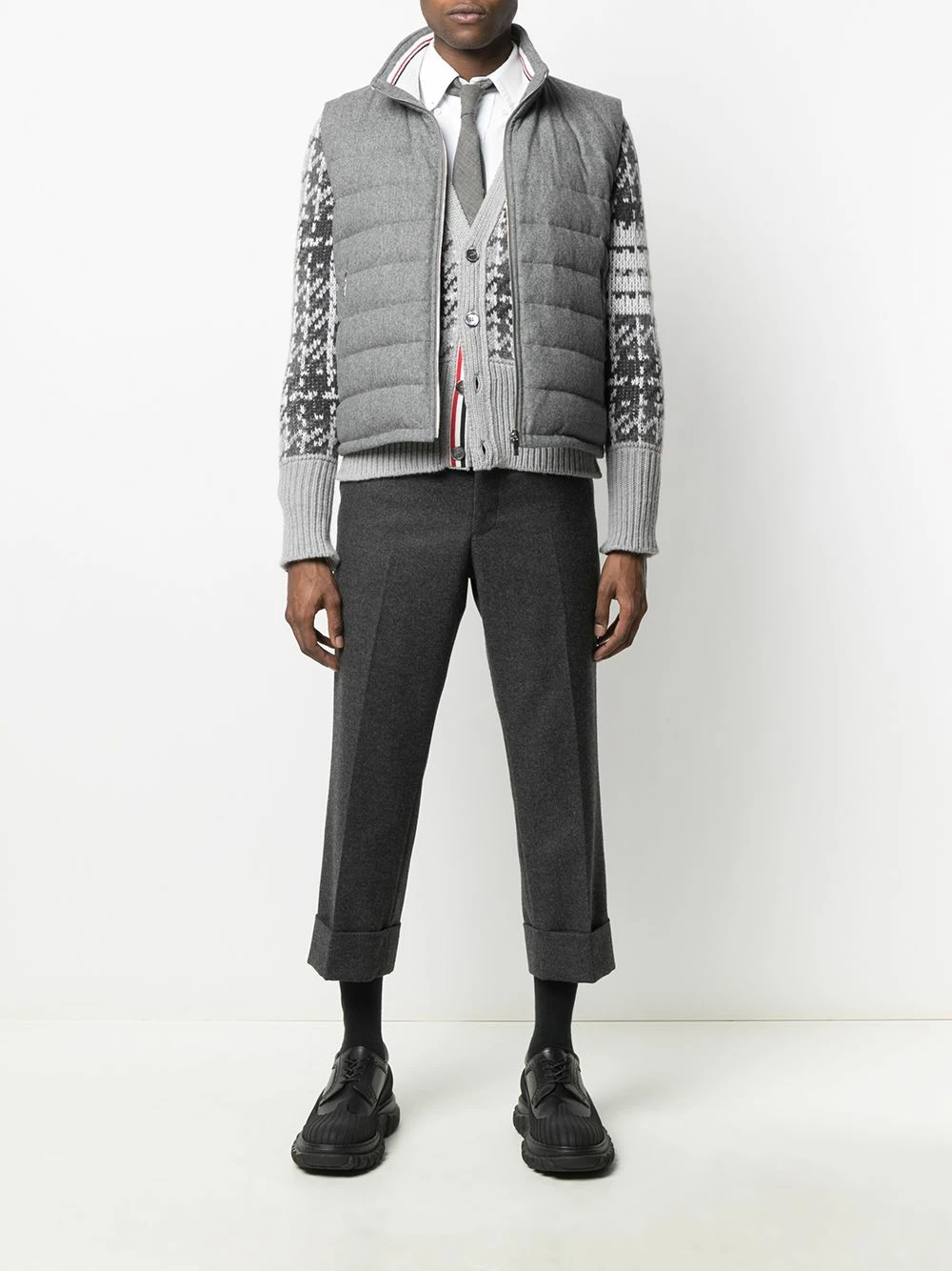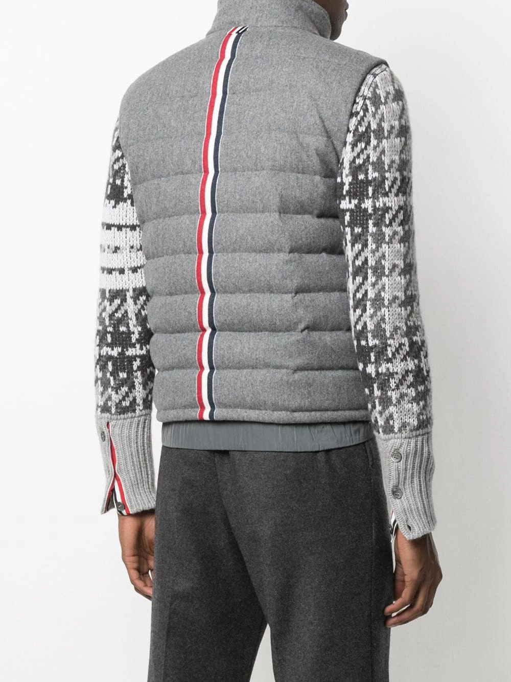 Dark Autumn nights and cold Winter days? Piece of cake. This dark grey puffer gilet from Thom Browne has you covered. Literally.