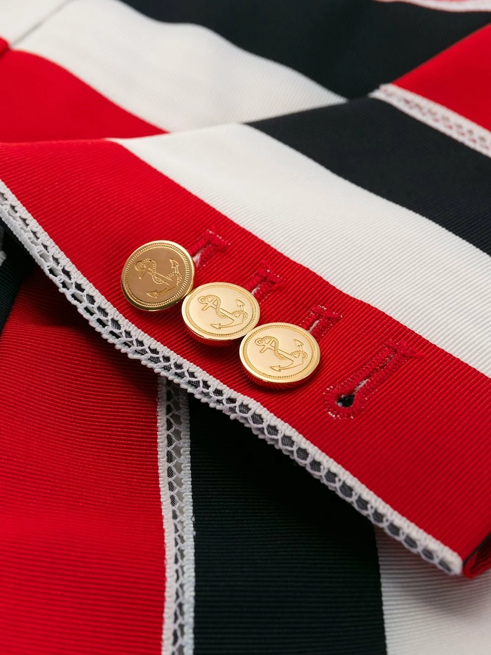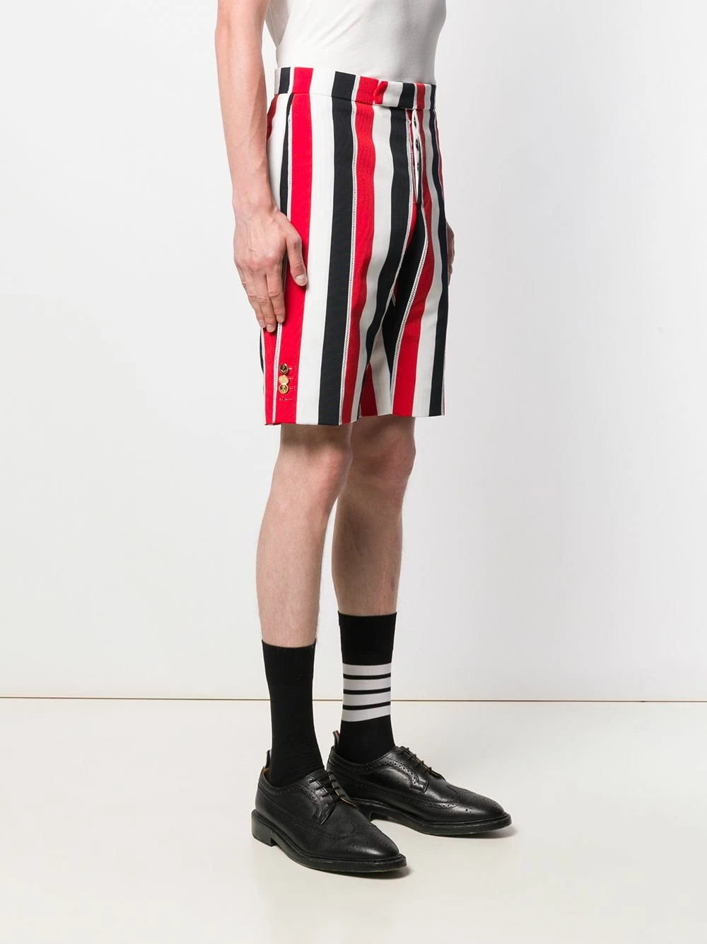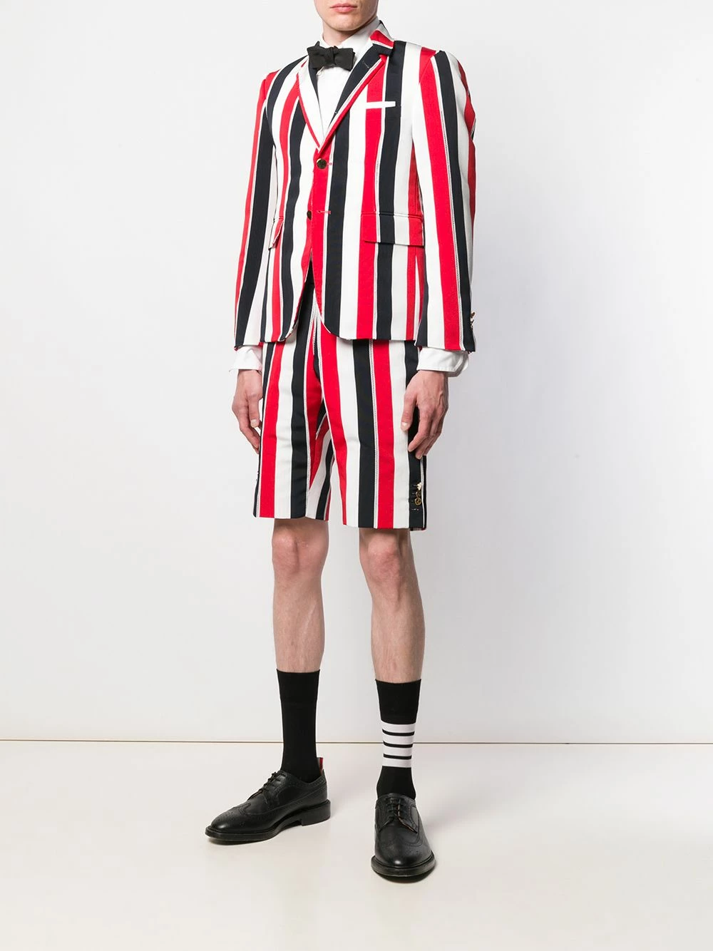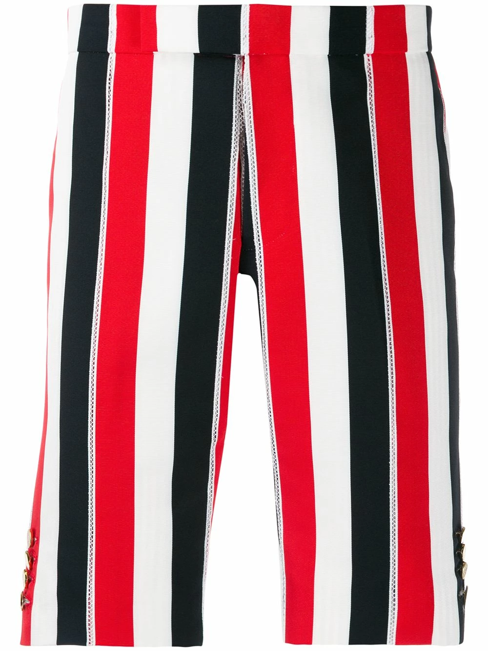Thom Brown’s expertise in technical, tailored and luxuriously fabricated aesthetic is clearly evident in these slim-fit shorts from the designer’s latest edit. Cut with a straight leg and mid-rise waist, the pair fastens with a hook and eye, while the striped pattern takes on the colourway of the signature tri-colour pattern.