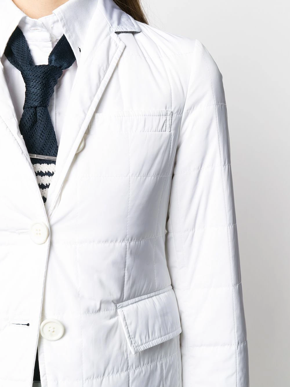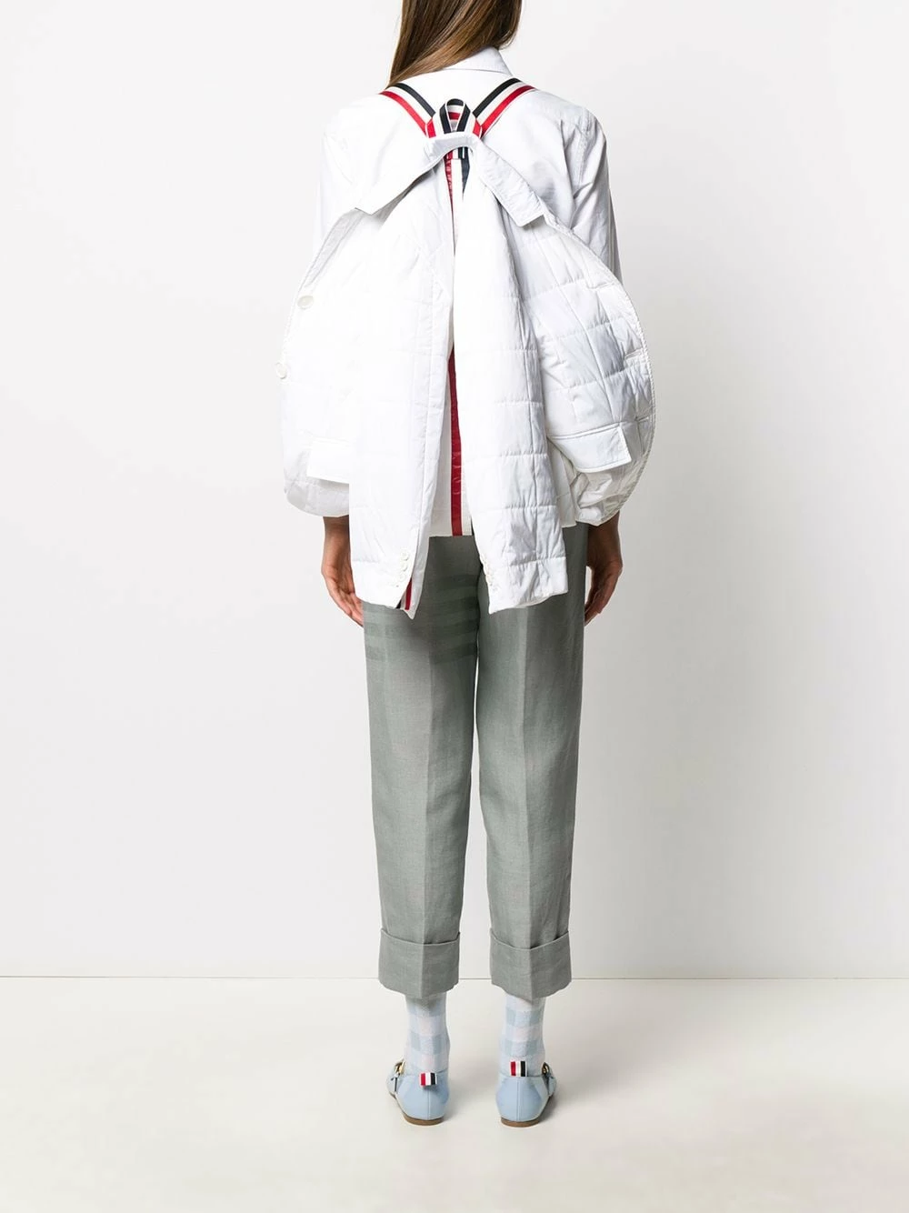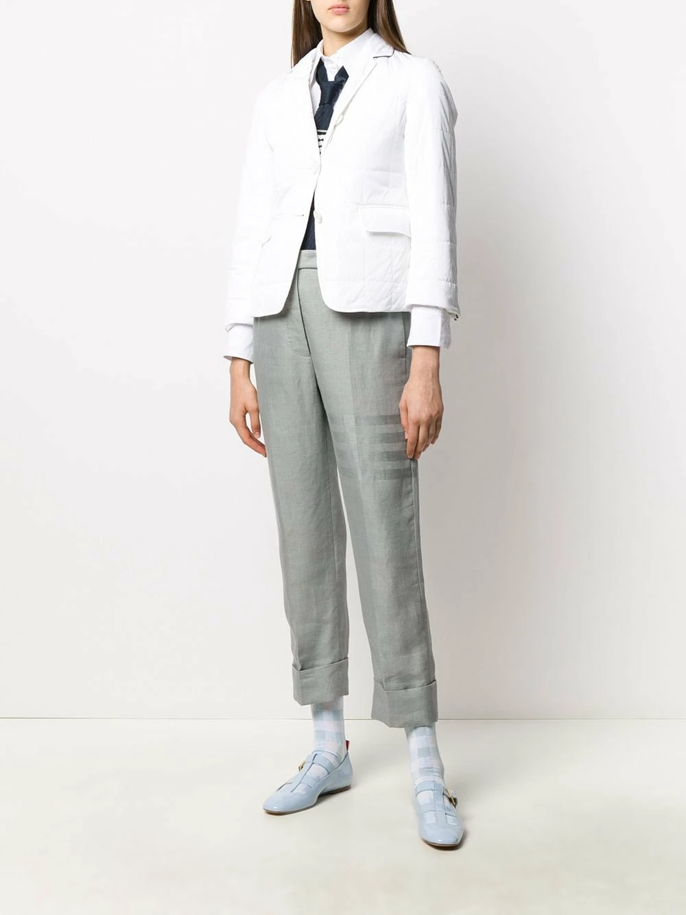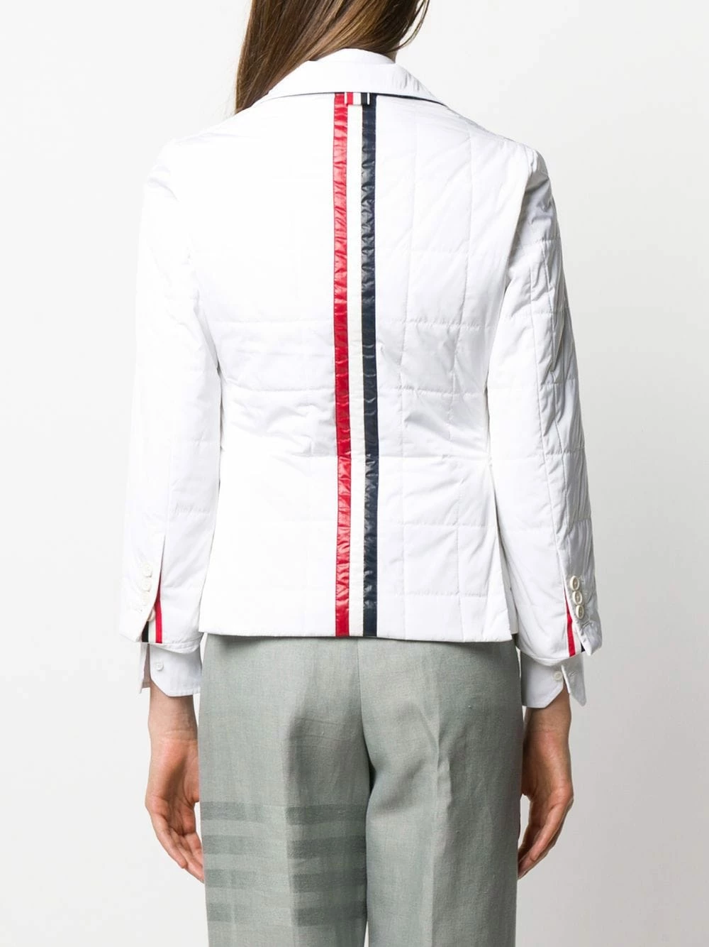 You’re padded out in smart style. That’s because you’re wearing a Thom Browne design. With the signature RWB stripe running down the back of this blazer, there’s no mistaking your favourite brand. Button up.