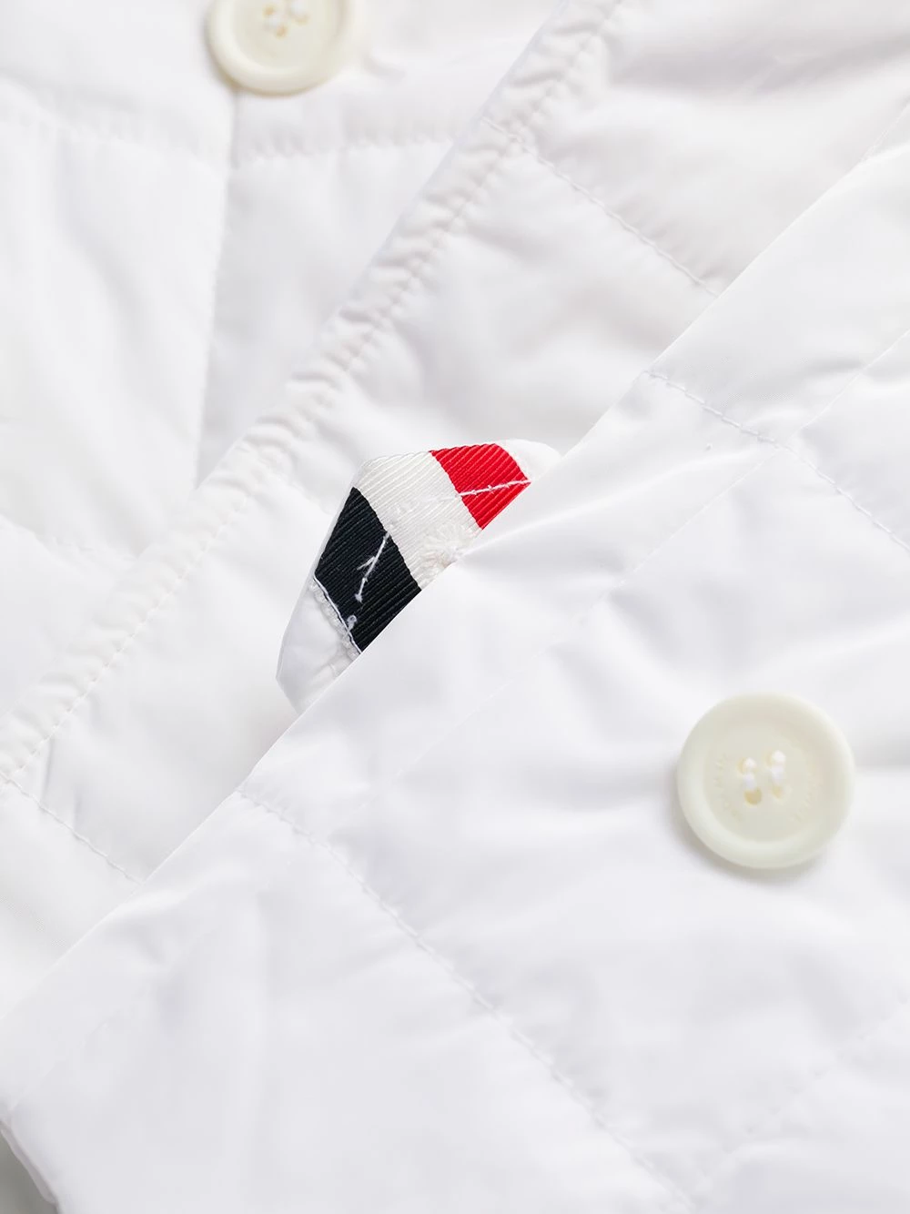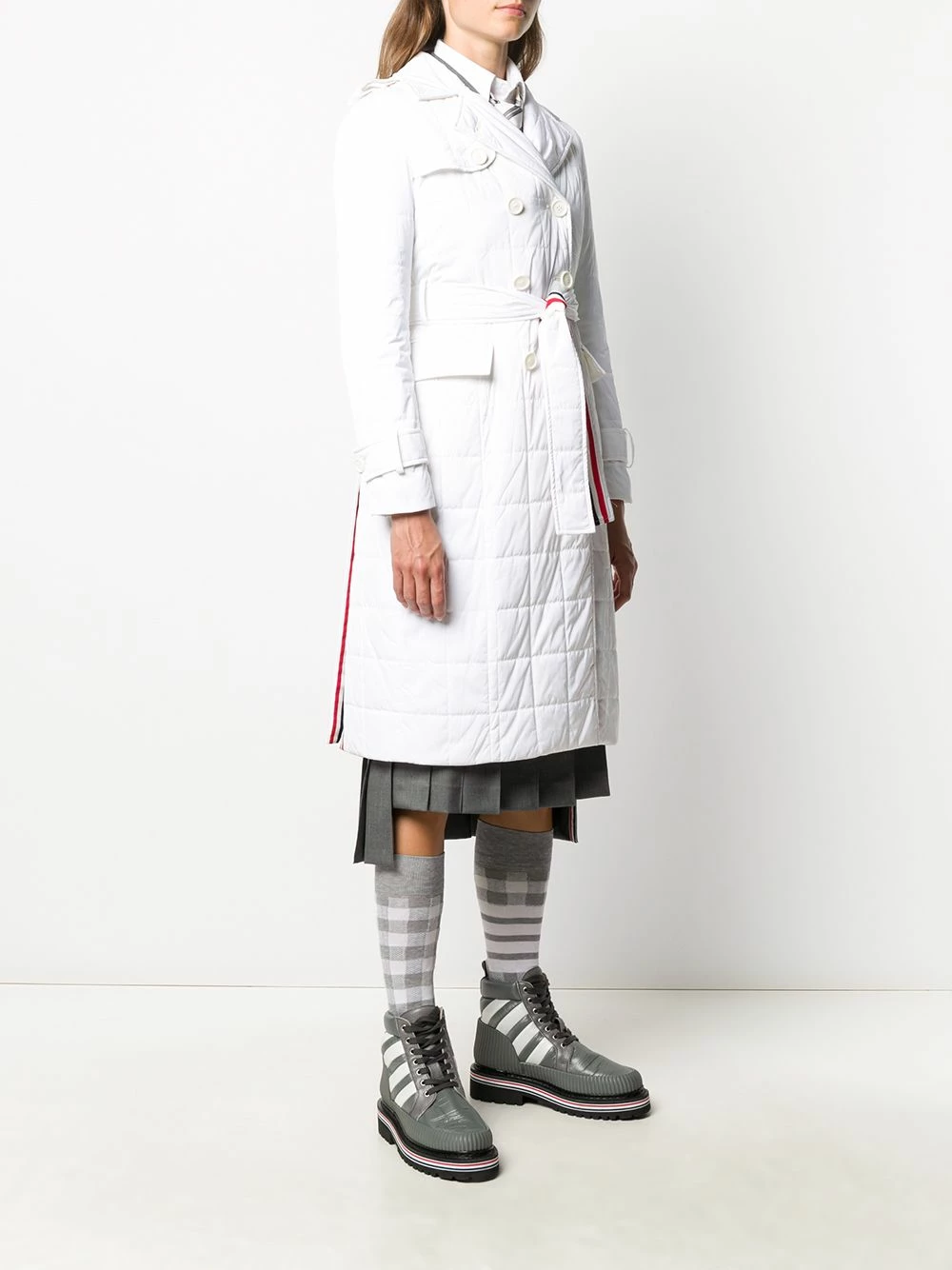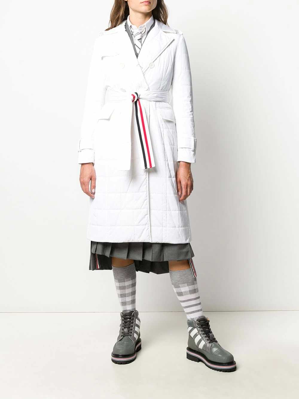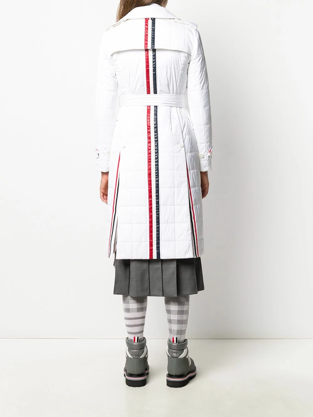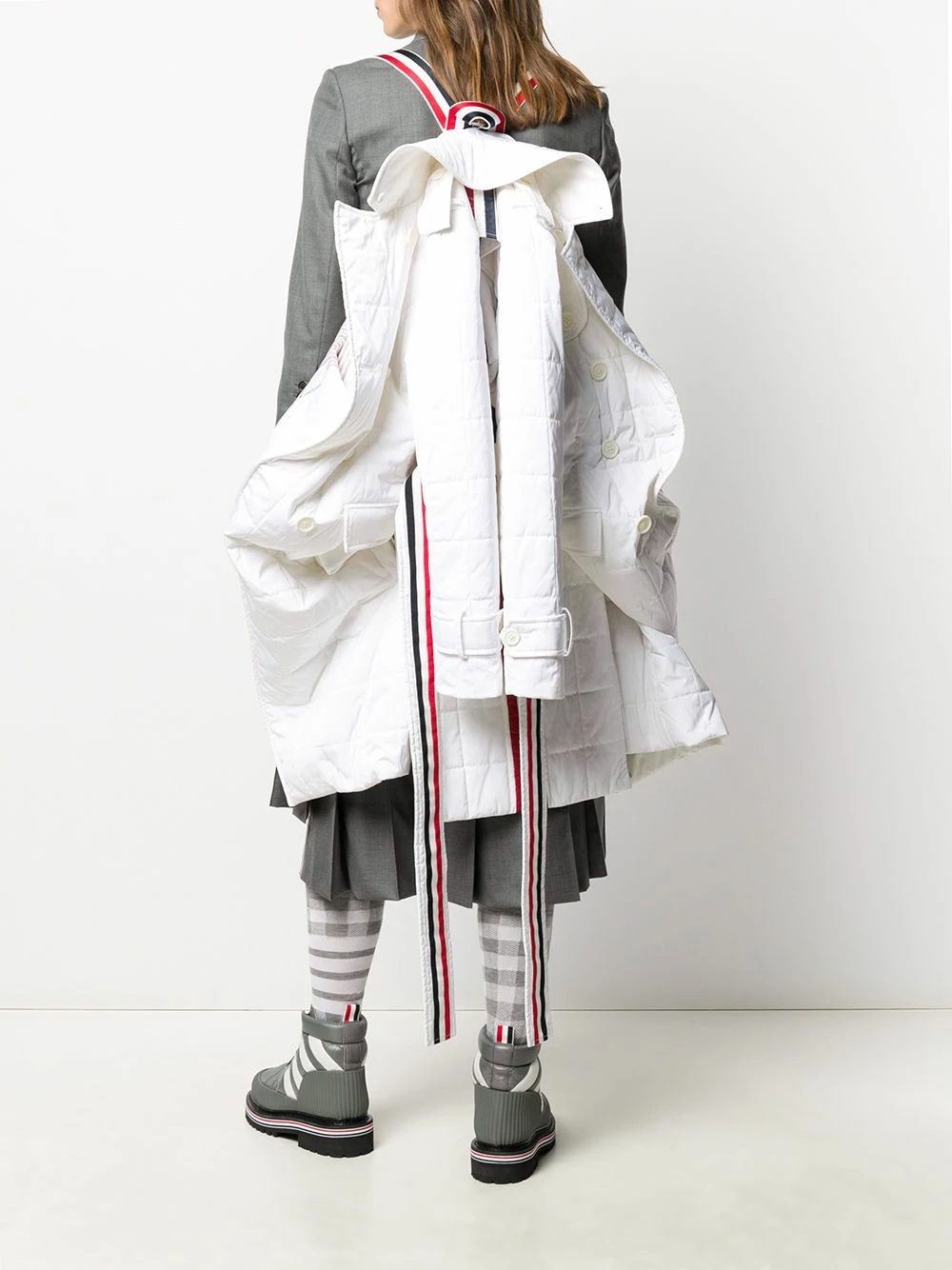 Sometimes, a piece comes along that you just can’t resist. This down-filled poly twill Thom Browne trench coat is one of those pieces. Contemporary RWB shoulder straps allow it to be worn without sleeves for a quirky and unexpected look. Featuring epaulettes on the shoulders, peaked lapels, a double-breasted front fastening, long sleeves, button cuffs, a belted waist, shoulder straps, front flap pockets, a mid-length, a double vent to the rear, down-feather filling and RWB stripes.