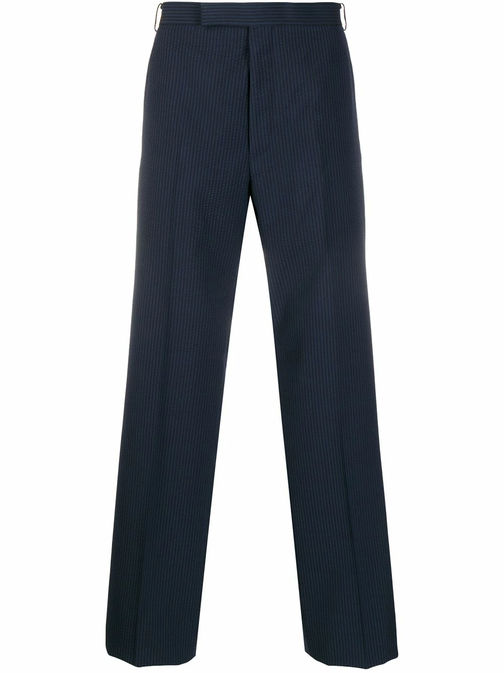 Time for a wardrobe update. Crafted from wool with a striped pattern, these navy blue tailored trousers from Thom Browne are decorated with a red, white and blue stripe to the sides and detailed with the brand’s signature RWB tag to the back. We can’t think of a better option for a smart casual look. Featuring a waistband with belt loops, a concealed front fastening, side slit pockets, two back buttoned welt pockets, a straight leg, pressed pleats to the front and rear and a regular length.
