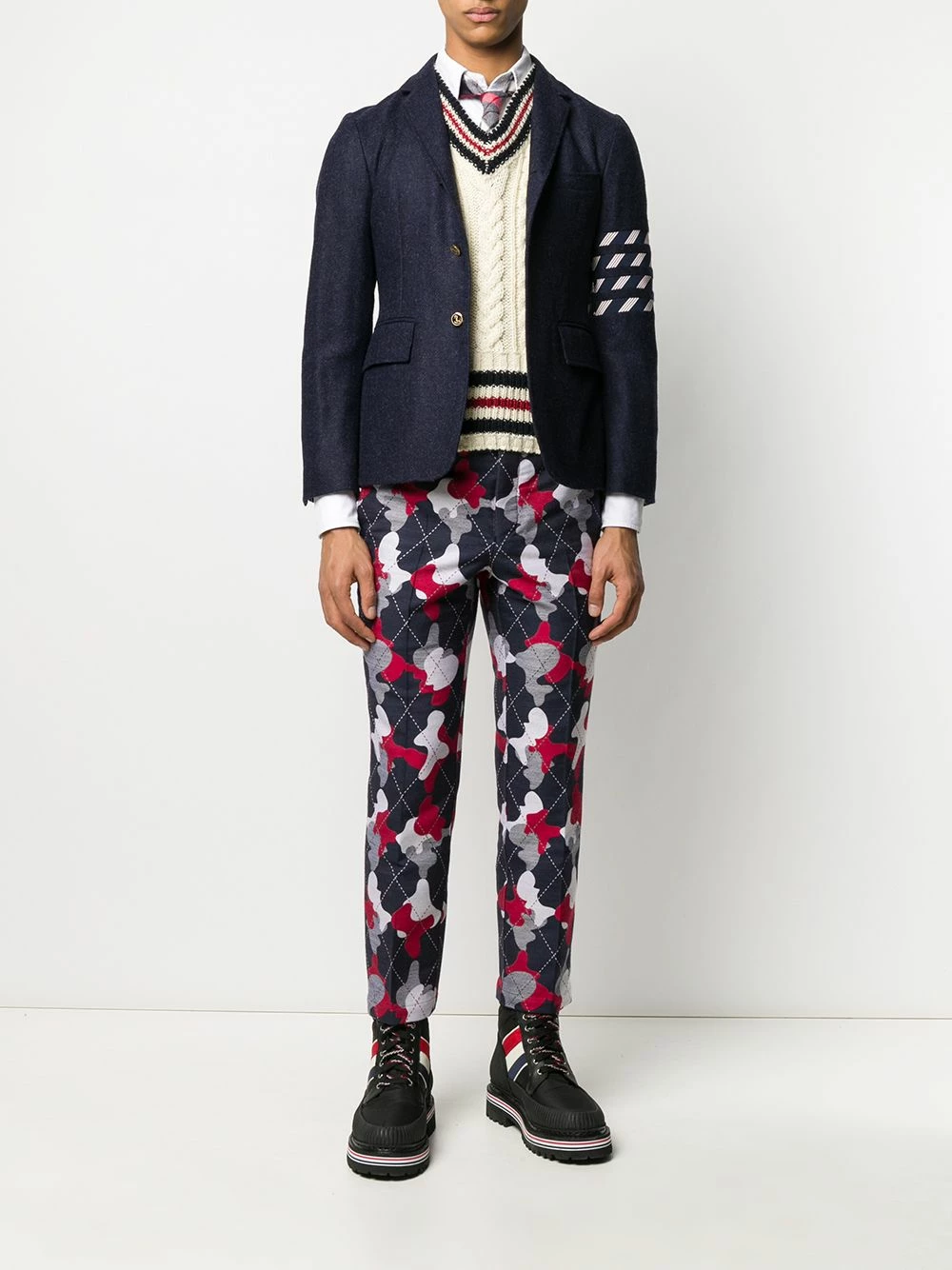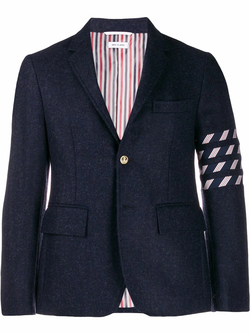 Experiment with proportions with this Thom Browne blazer. In a signature cropped style, it’s a high-impact piece. Be a little different. Featuring a collar style, a front button fastening, front pockets, cropped sleeves, a 4-Bar tab and a 4-Bar stripe.