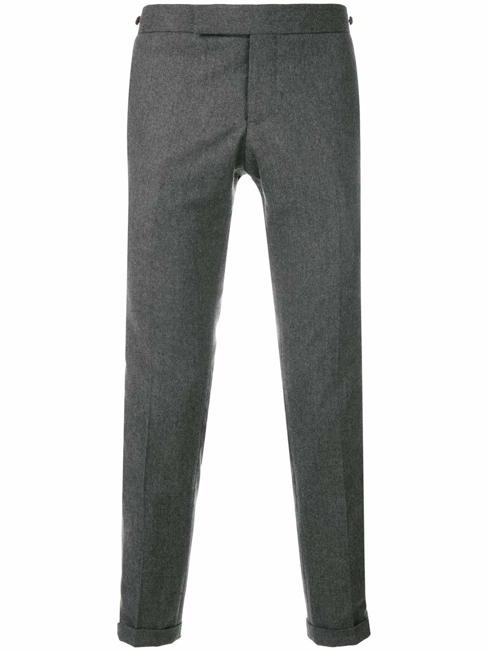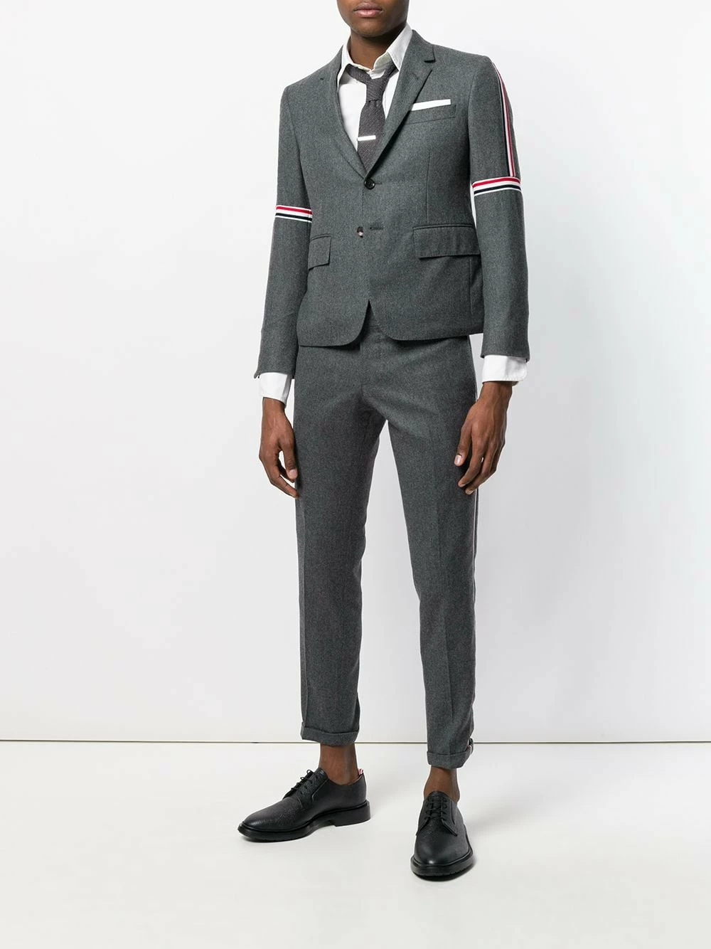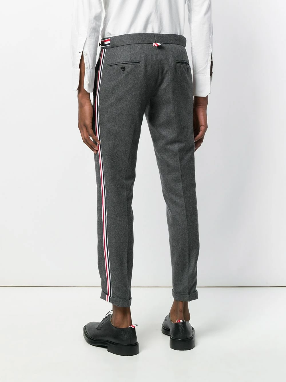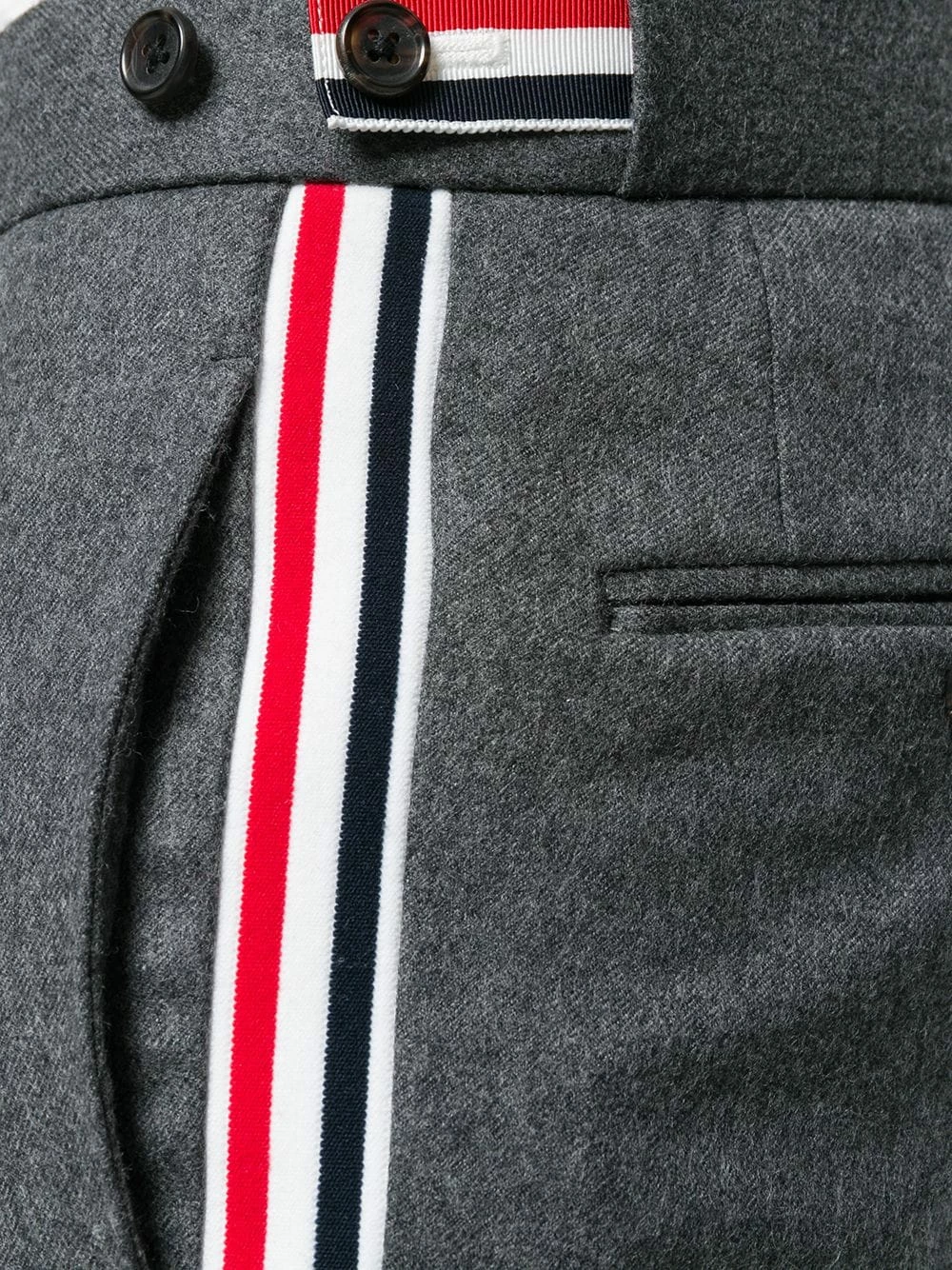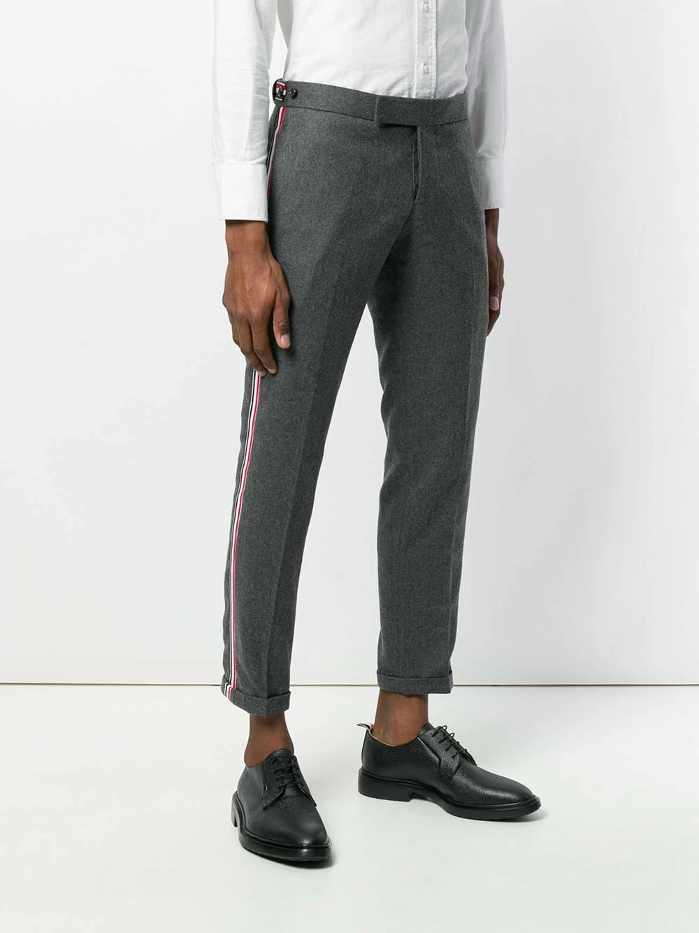 Combining highest-quality fabrics and a conservative sensibility with a touch of irreverence and humour, Thom Browne’s Autumn/Winter 2018 is full of modern must-haves. Cut from navy blue wool to a mid-rise slim fit, these Japanese-crafted trousers combine impeccable construction with sporty side stripes and traditional tailoring details: a concealed front fastening, side waist tabs, slit pockets and back buttoned welt pockets. Finished with sharply pressed creases that highlight the neat, subtly cropped cut, as well as a tricolour grosgrain tab on the rear for a signature touch, try yours with a matching jacket and a pair of polished brogues for a refined yet relaxed look.
