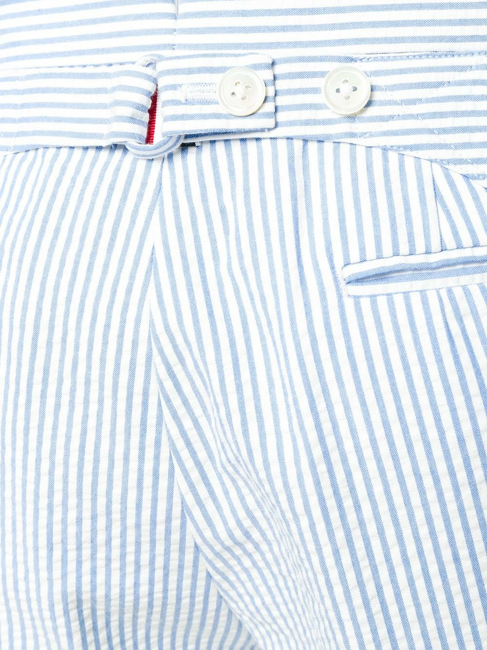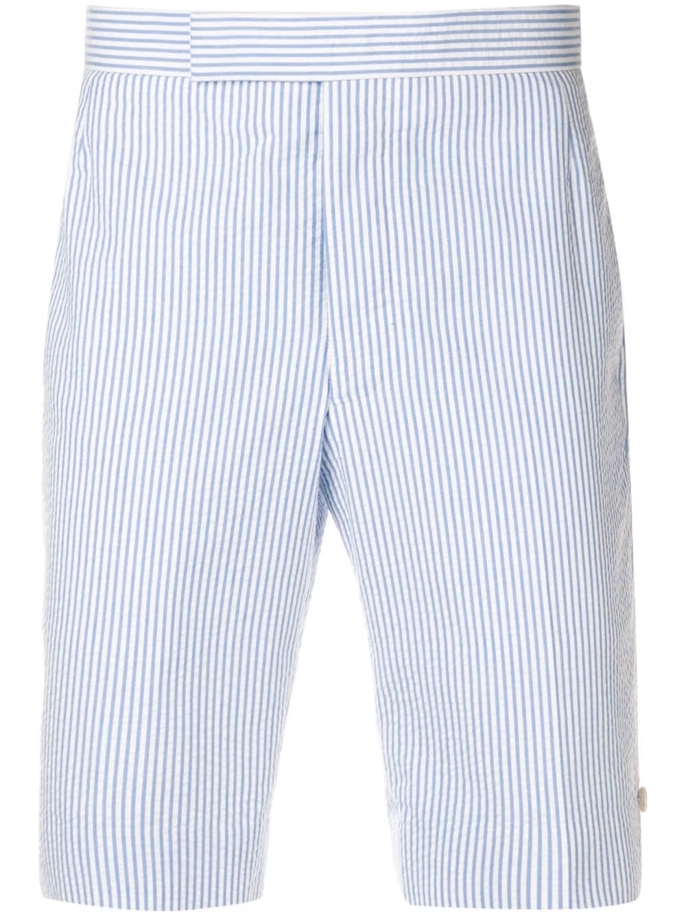 Light blue Seersucker Backstrap Short from Thom Browne featuring a mid rise, a slim fit, a striped pattern, a concealed front fastening, side pockets, two back buttoned welt pockets and a signature tri-colour striped trim.