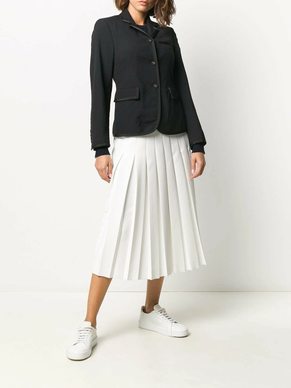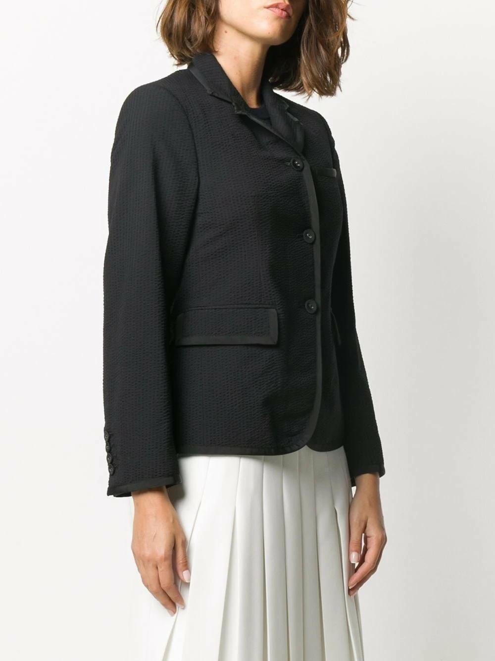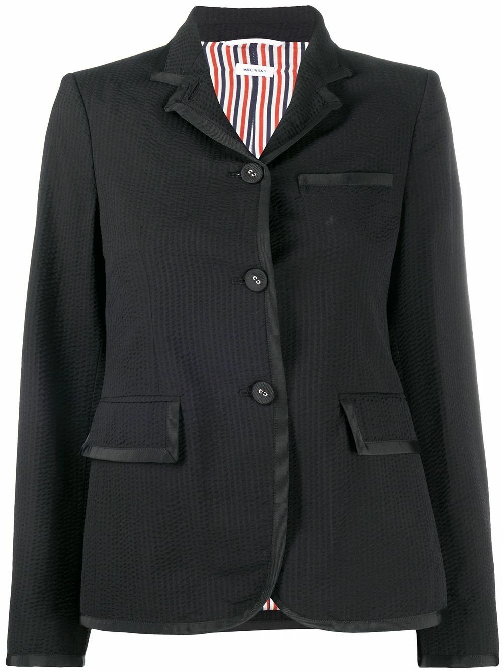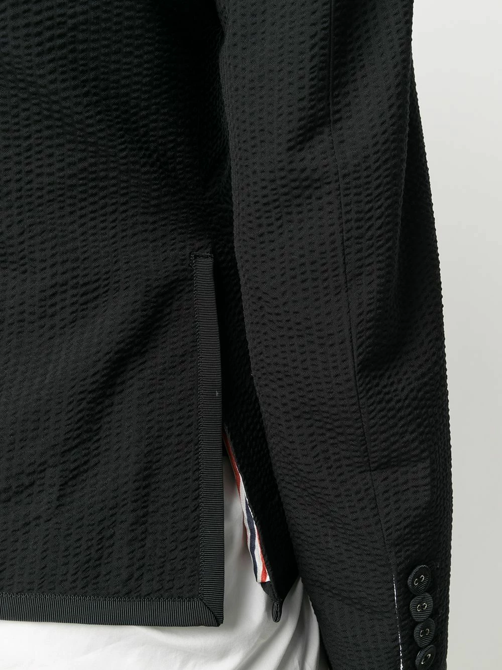 Since its launch in 2003, Thom Browne’s namesake label has gained notoriety for its clean designs and use of luxury materials. This black wool Narrow Shoulder Seersucker Blazer from Thom Browne features notched lapels, a front button fastening, long sleeves, two front pockets and a curved hemline.