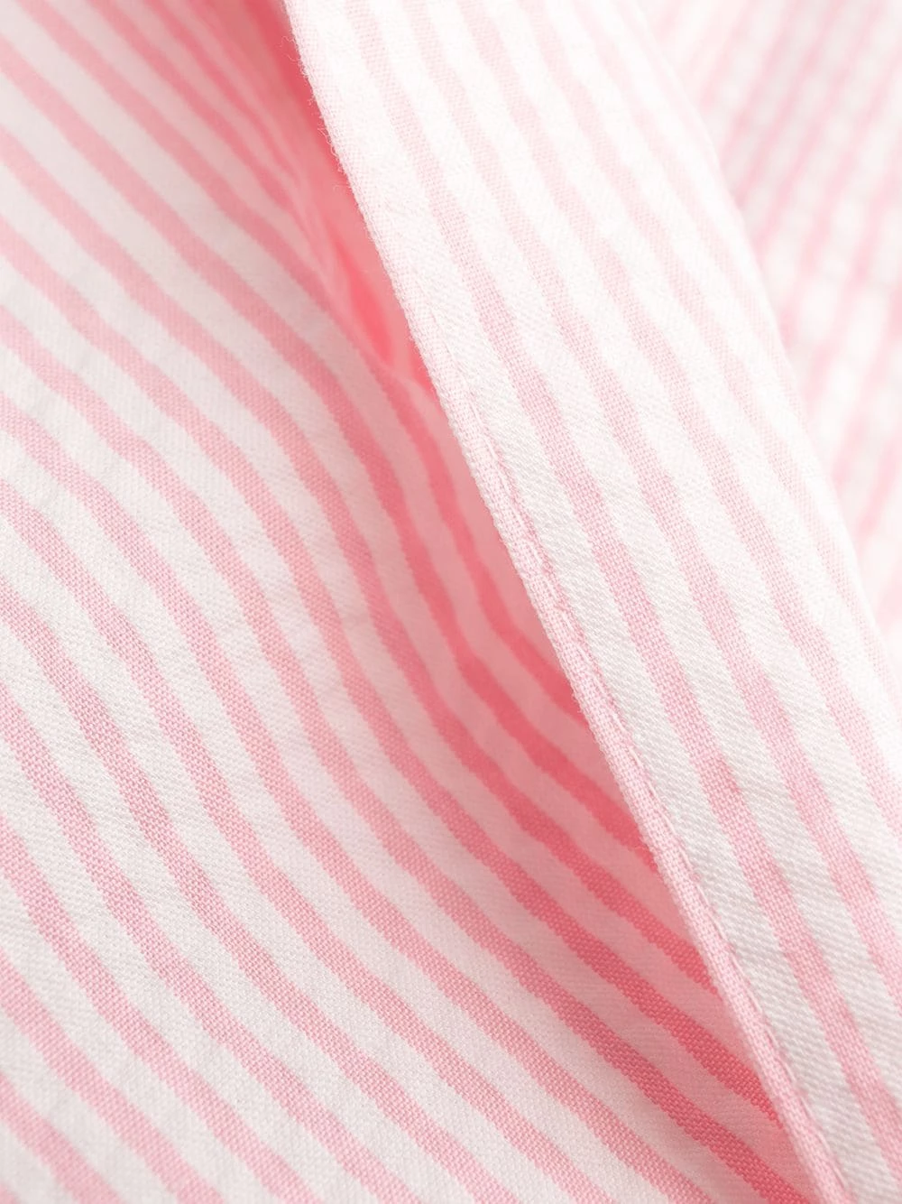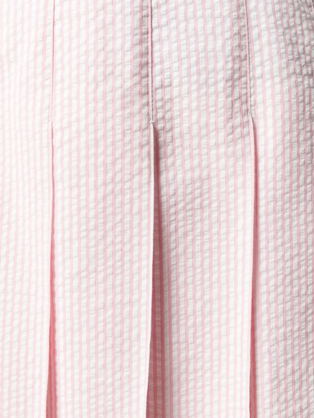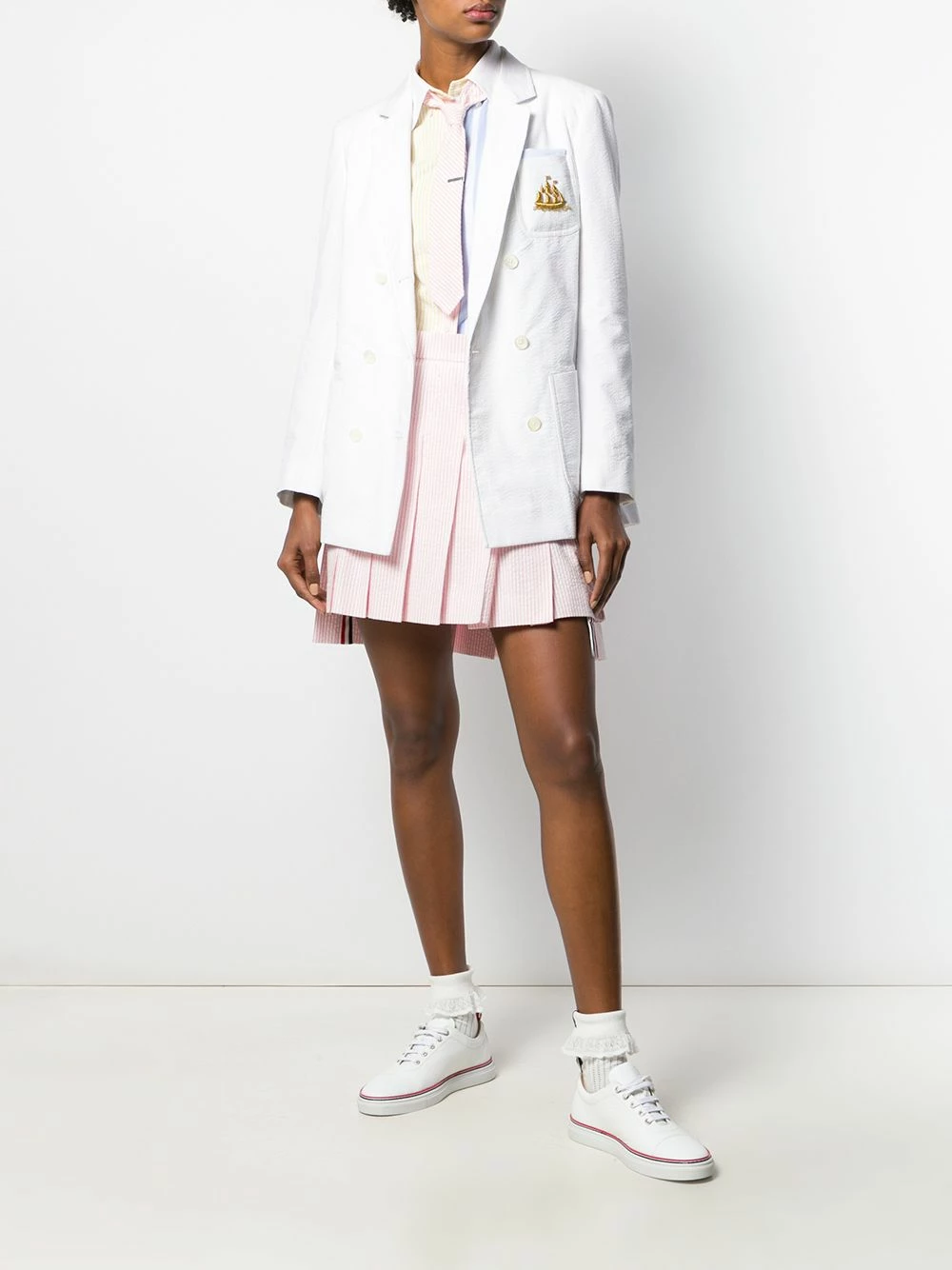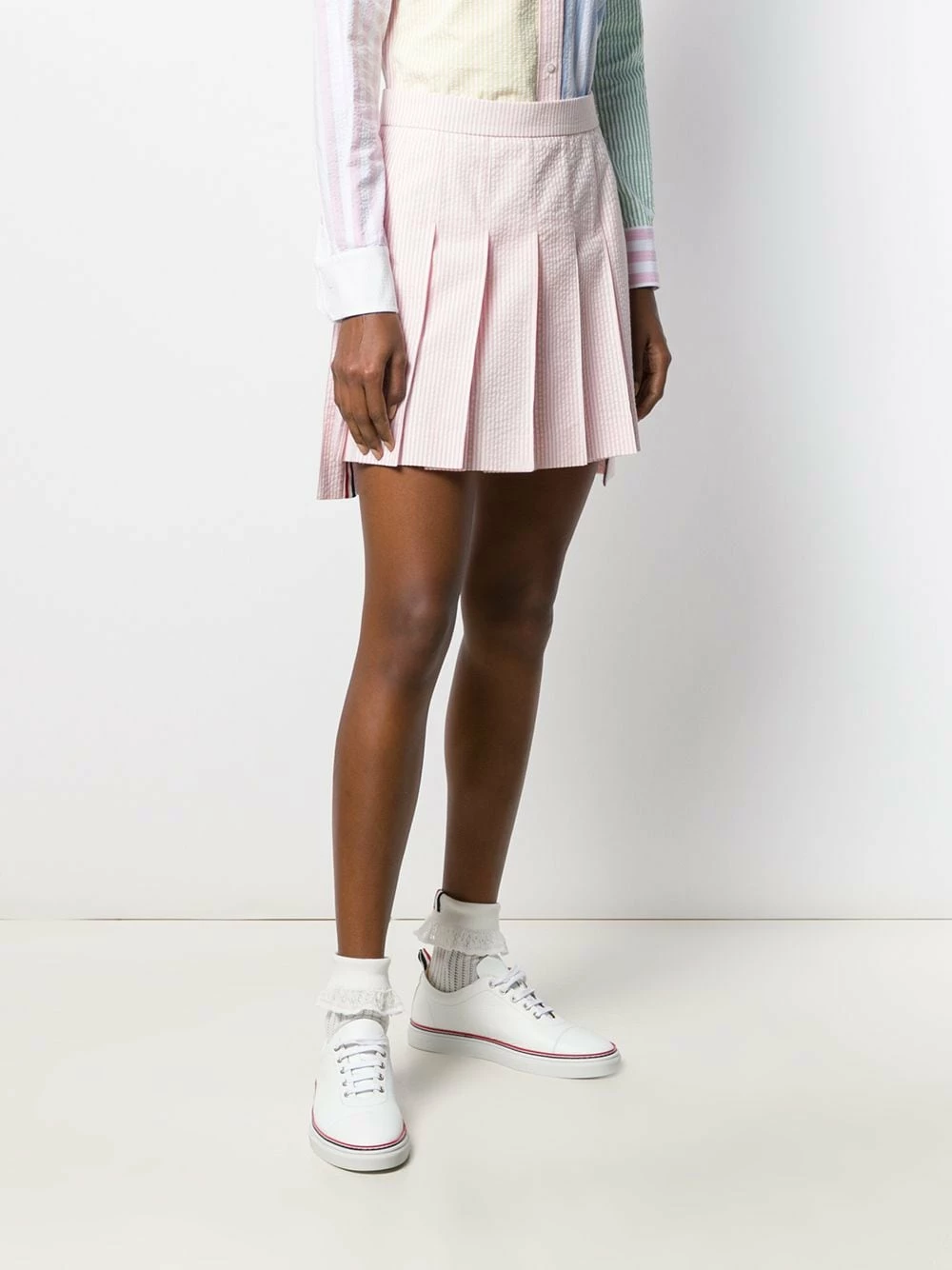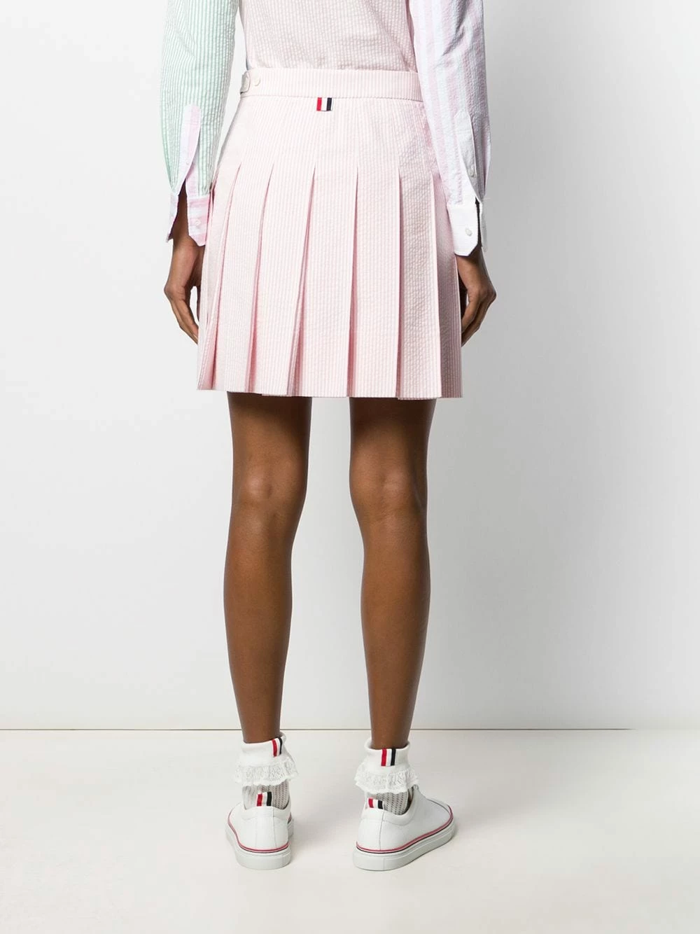 Go for a feminine feel. This Thom Browne seersucker pleated miniskirt is preppy with a grown-up flare. The longer back panel adds a quirky touch. Featuring a side zip fastening, a signature three stripe detail, a pleated design, a short length and a high low hemline.