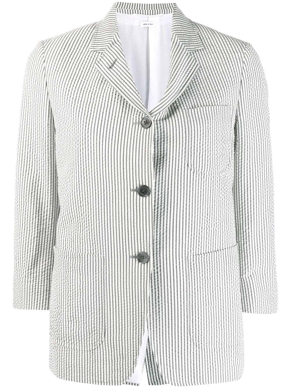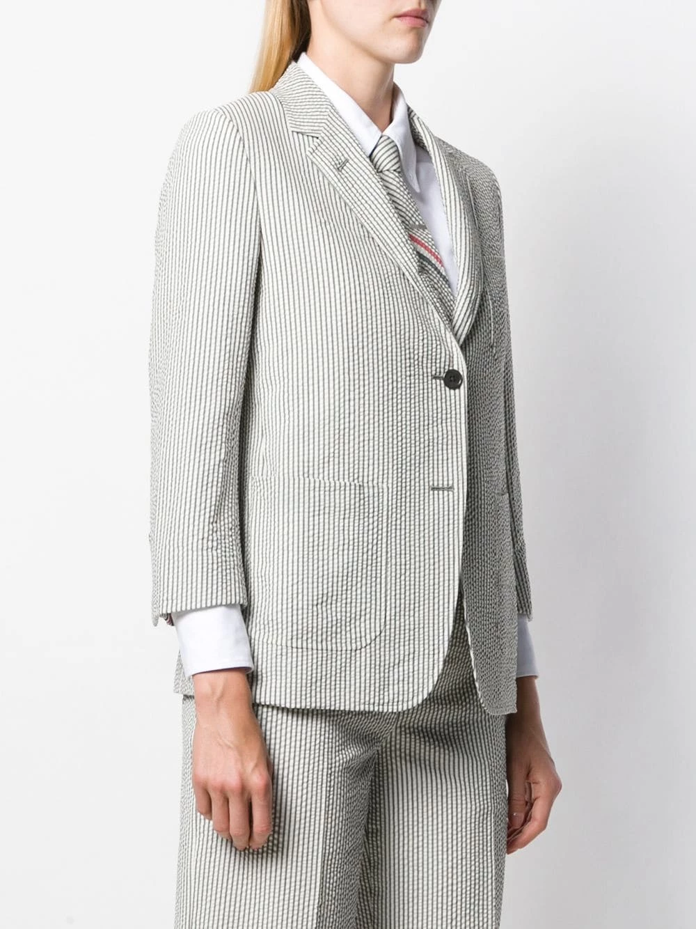 Those girls who look like they have their whole life together? Join their ranks by pulling on this grey and white striped tailored blazer from Thom Browne. Whether you do or not, you can look the part completely. Featuring classic lapels, a broad welt chest pocket, a front button fastening, a striped pattern, patch pockets, cropped sleeves and a signature grosgrain loop tab.